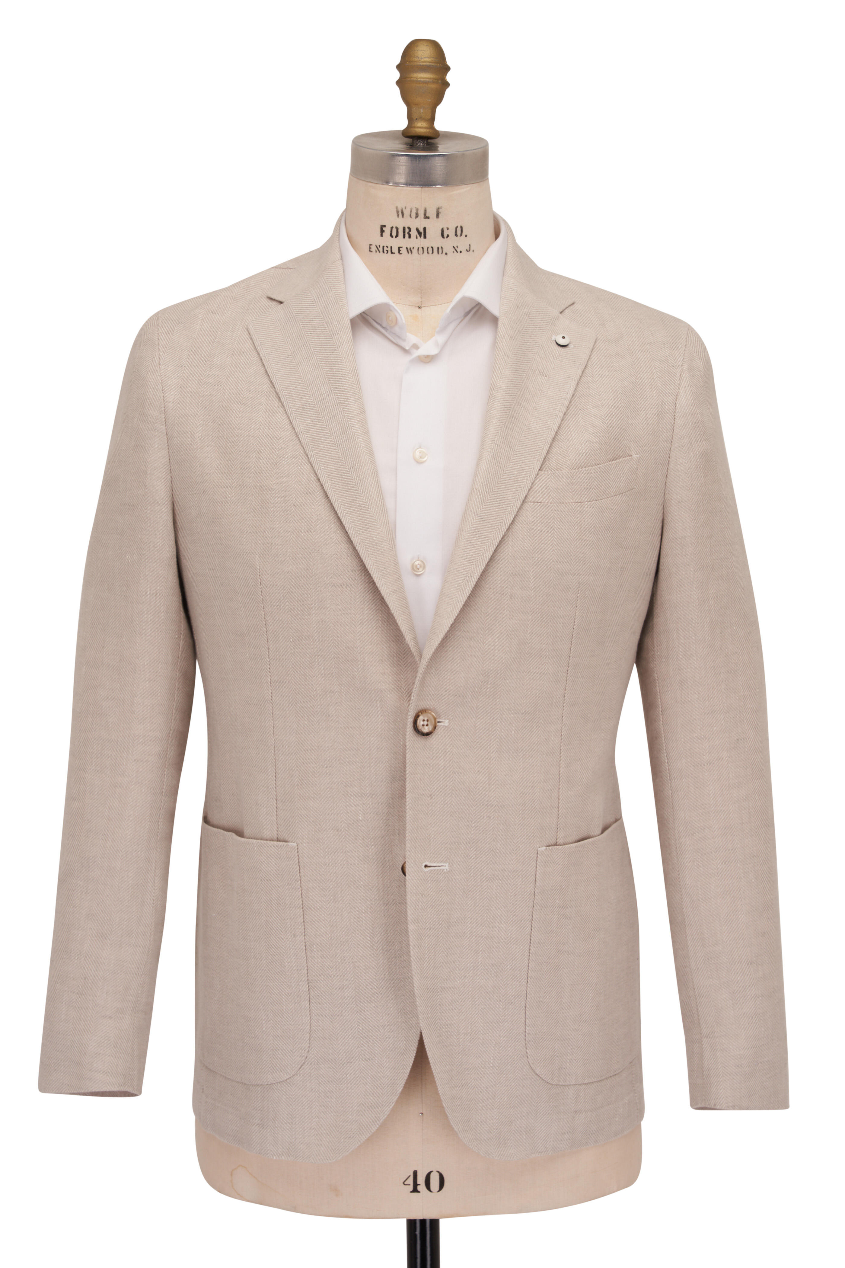 Notched lapels. Two button front closure. Chest welt pocket; lower patch pockets; interior slip pockets. Double vent. Made in Italy. 65% linen, 35% cotton; unlined. Dry clean.