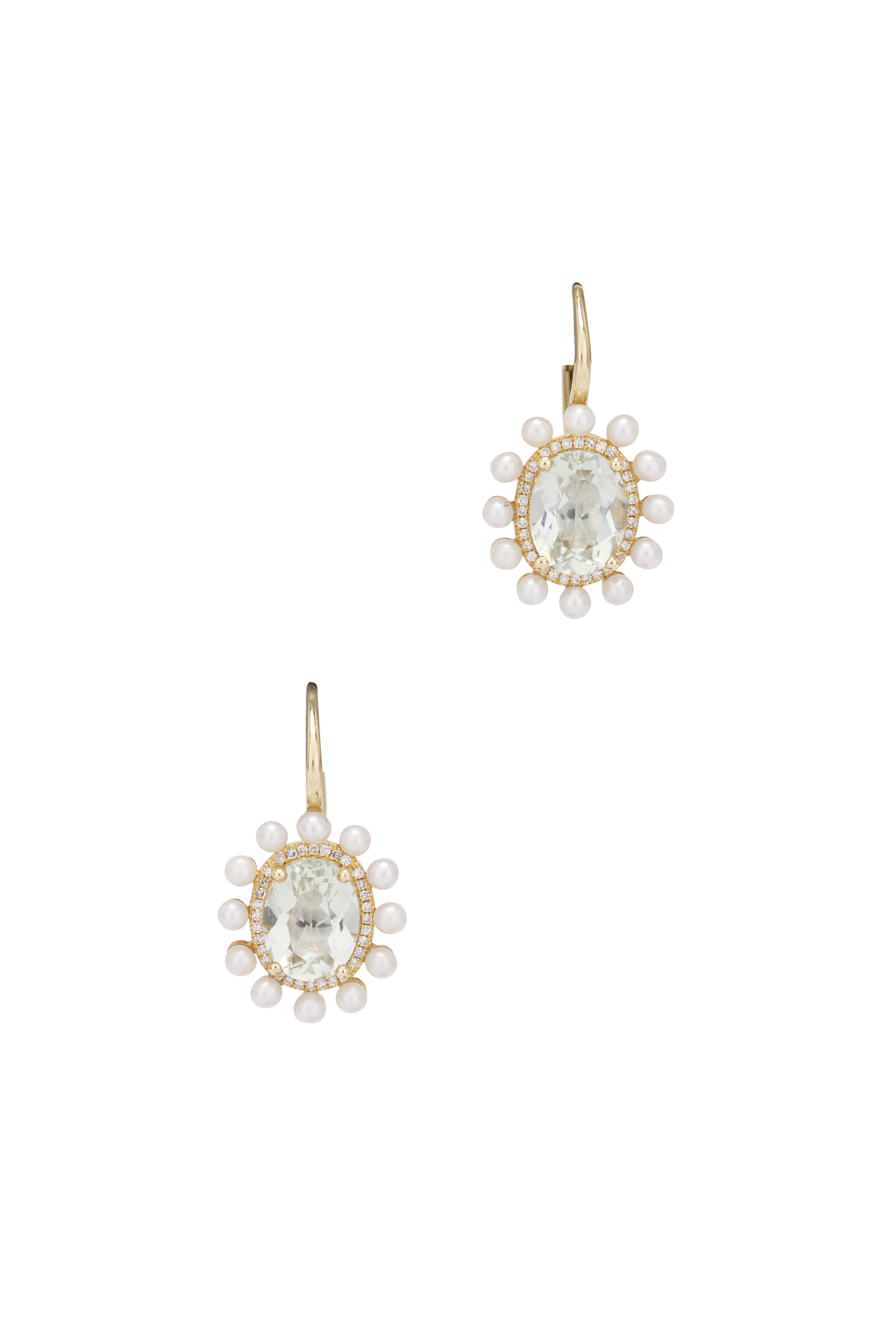 14K Yellow Gold. Green Amethyst. Pearl. Lever Back.