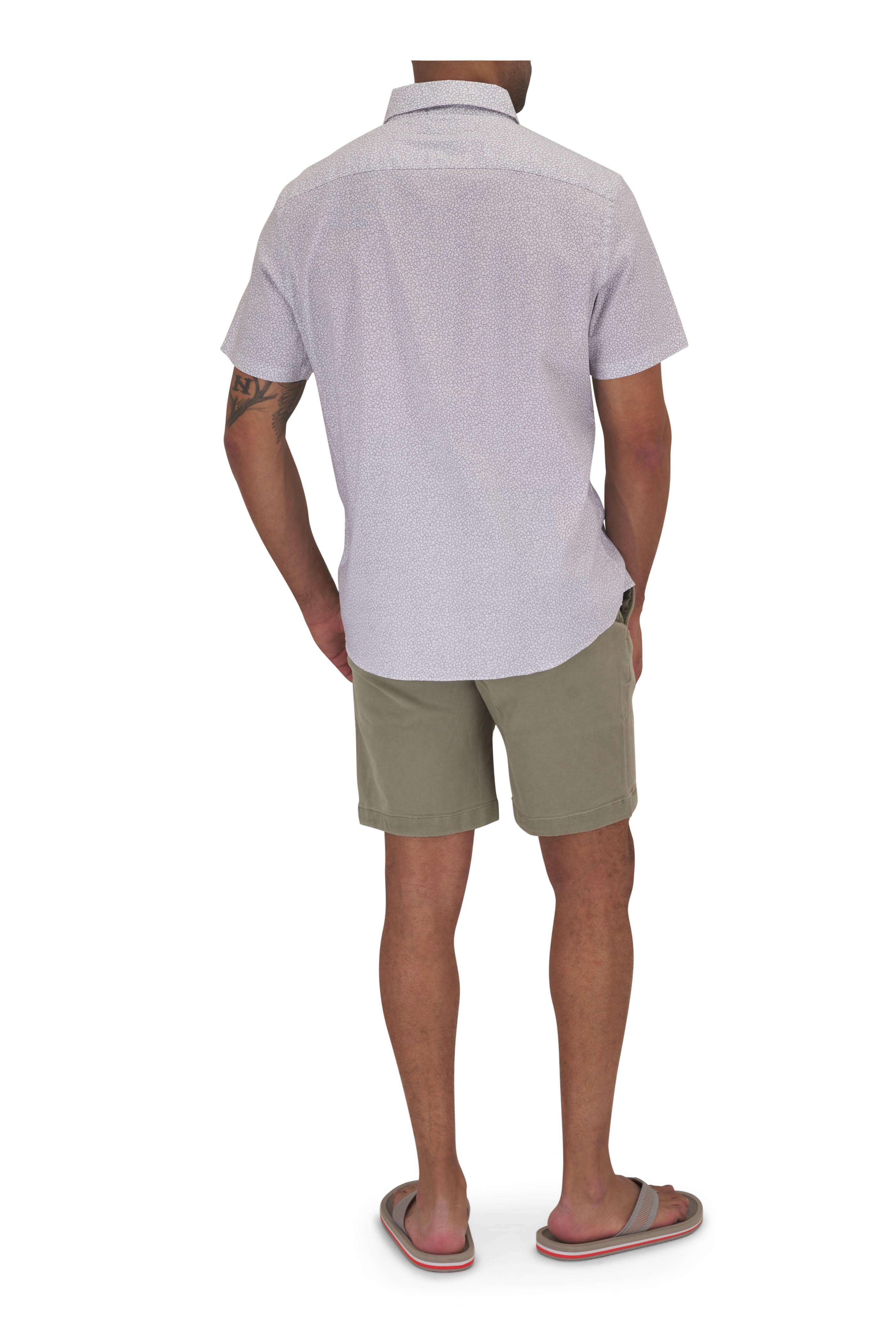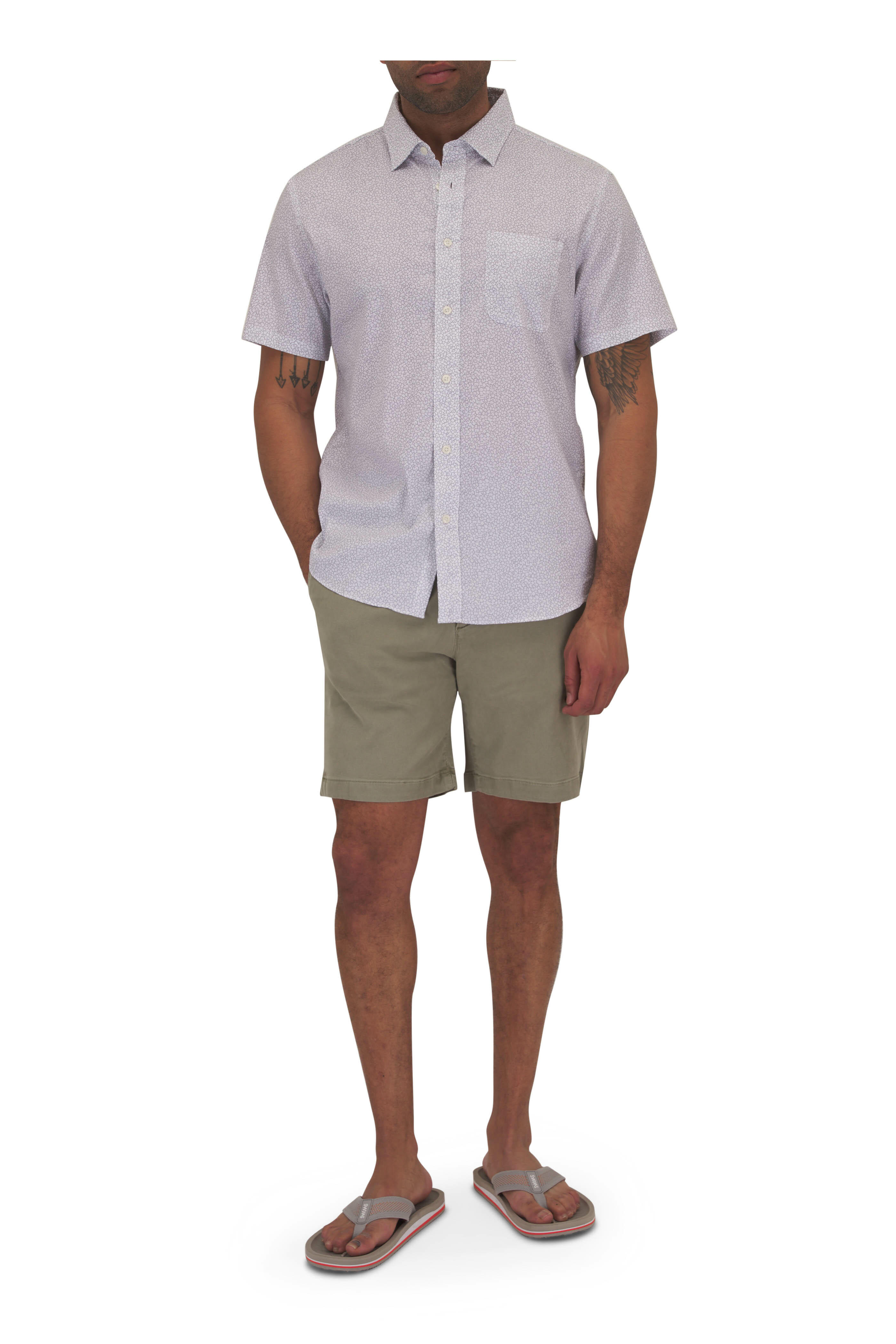 Spread collar. Front button placket. Chest patch pocket. Shirttail hem. Imported. Color: Ivory Cliff Floral. Relaxed body, with a straight fit from the chest to the hem. 55% supima® cotton, 25% recycled nylon, 16% lyocell, 4% elastane. Machine wash.