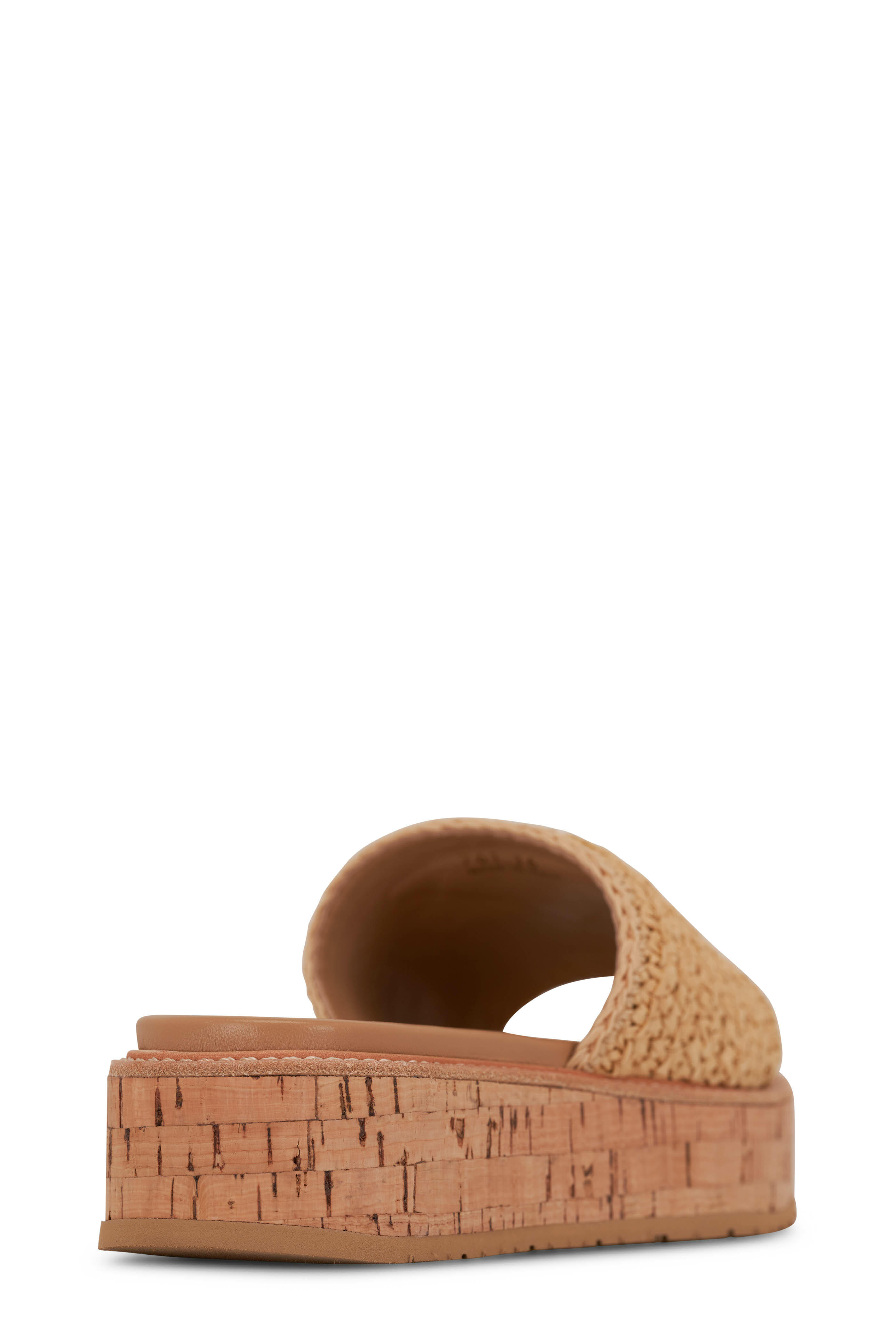 Raffia effect yarn upper. Round, open toe. Slip on style. Enameled metal triangle logo. Triangle-patterned rubber sole. Made in Italy. Flatform height: 35mm (1.3").