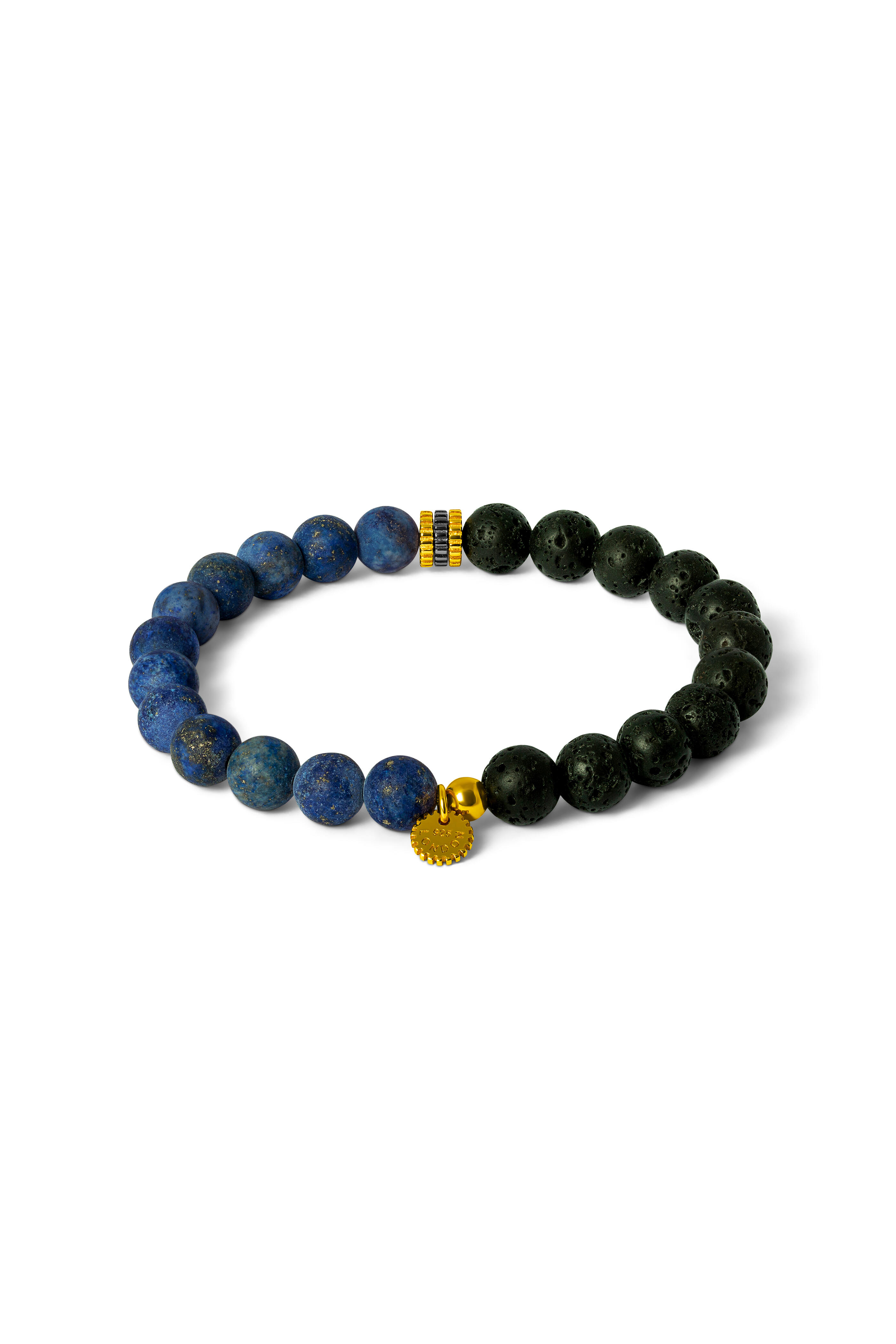 Sterling Silver& Ruthenium-Plated Elements: 2-micron. Yellow Gold Overlay. Black Lava Beads: 8mm. Blue Lapis Beads: 8mm. Stack, Slip On & Off. Size L: 7.5"/ 19CM.