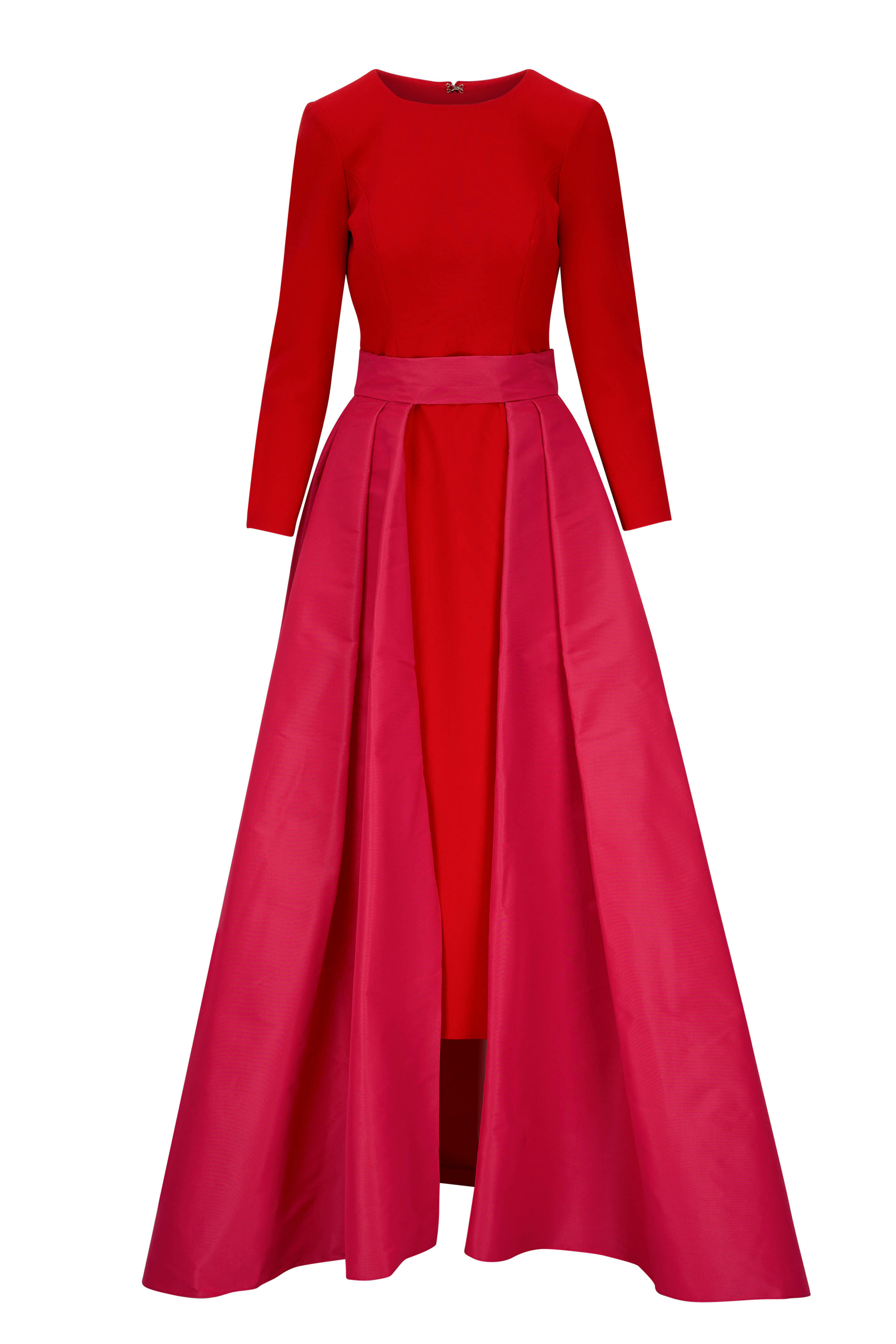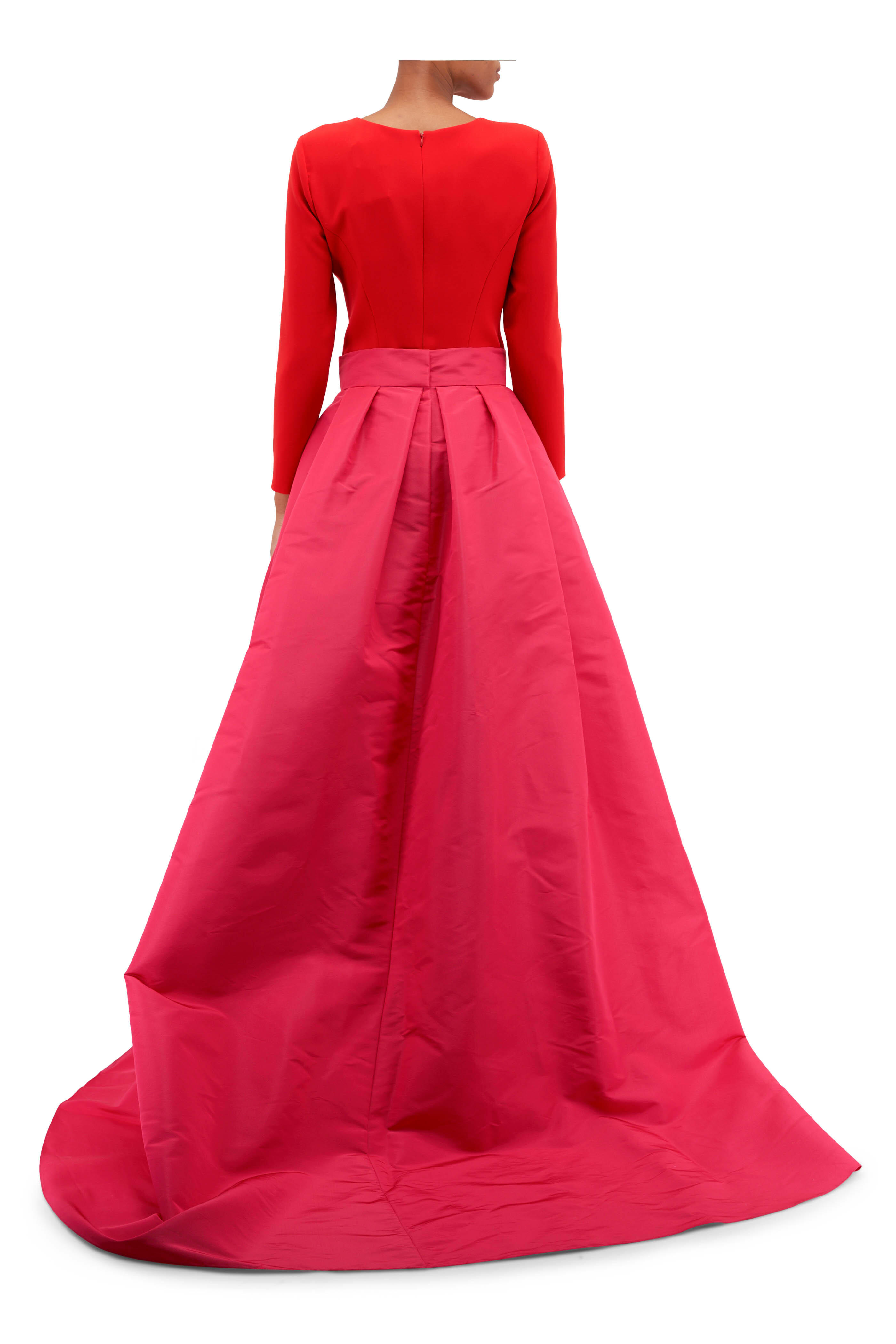 Crew neckline. Concealed back zip. Long sleeves; zip cuffs. Contrasting pink belted overskirt. Side seam pockets. Made in the USA. 54" shoulder to hem. Fits true to size. 100% silk; fully lined. Dry clean.