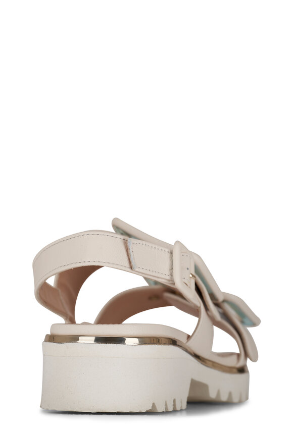 Nappa leather upper. Round, open toe. Double buckle strap vamp. Adjustable slingback strap. Leather lining; metallic gold trim. Rubber lug sole. Made in Italy. *For any sizing inquires please e-mail norma@mitchells.com*. Runs large; it is suggested to order ½ size down.