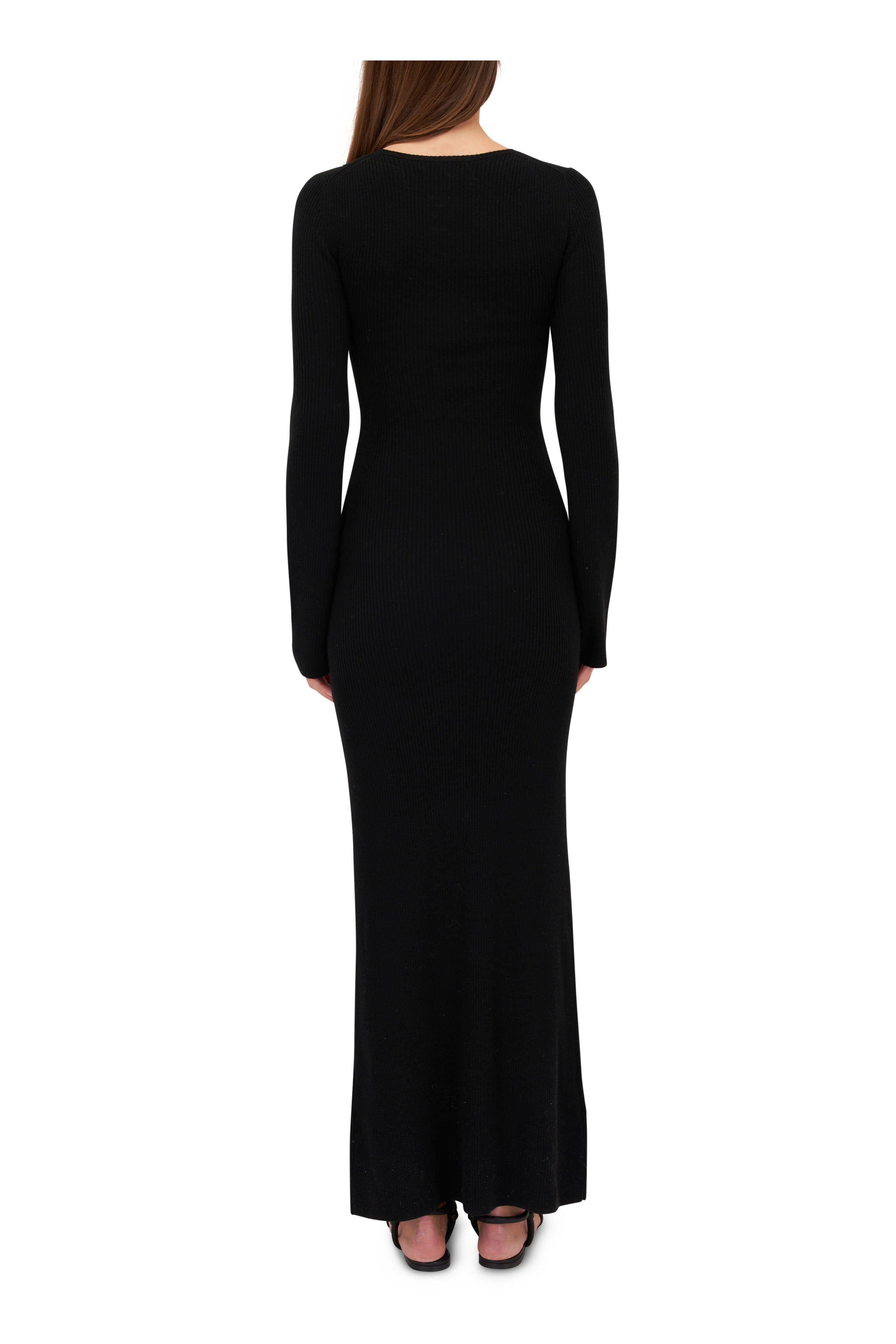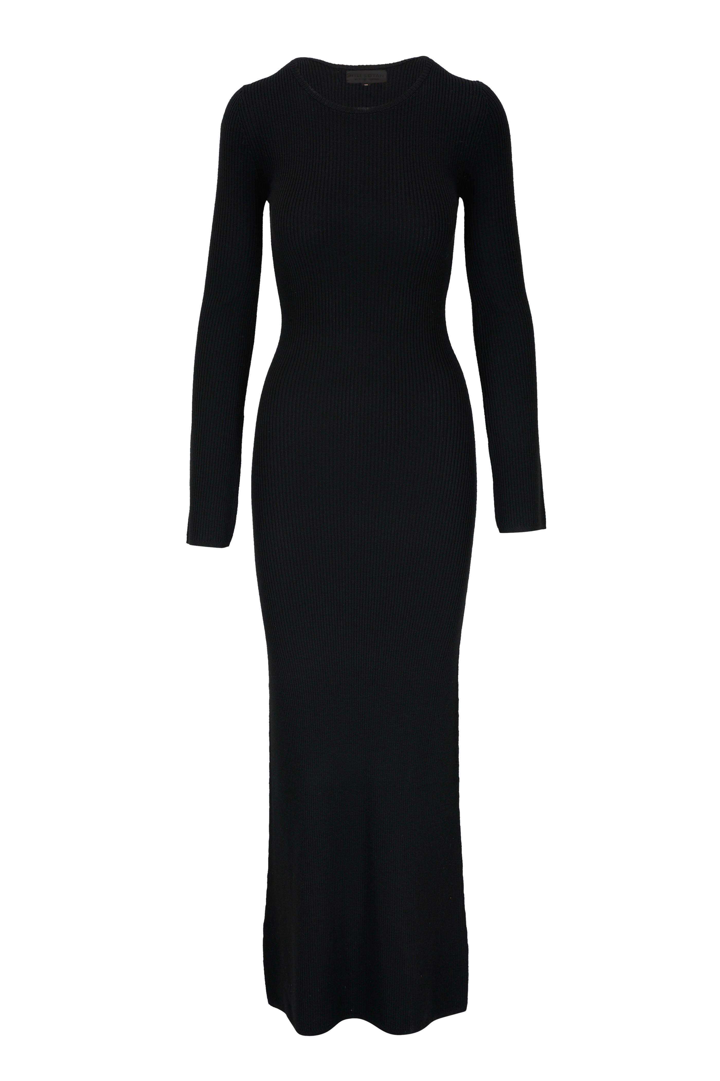 Crew neckline. Long bell sleeves. Straight hem. Imported. Column silhouette. 62" shoulder to hem (size XS). 100% wool. Dry clean.