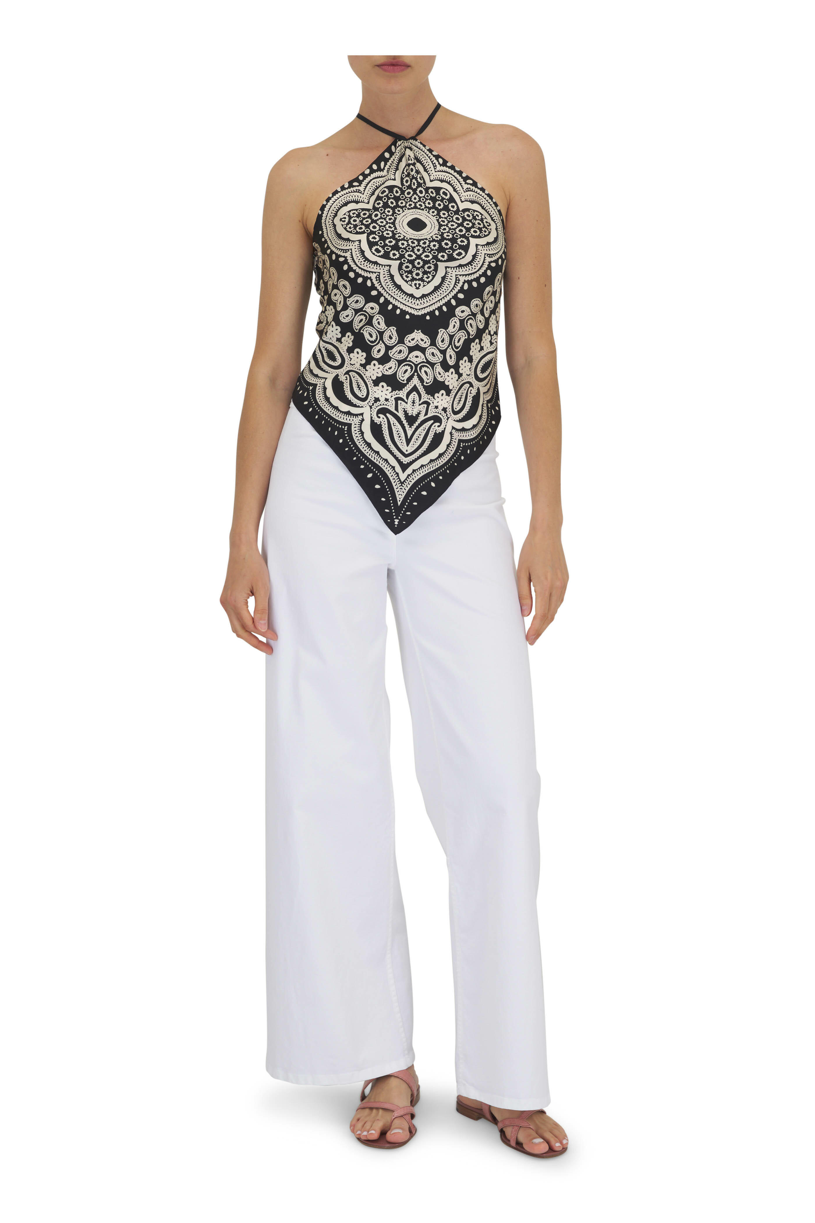 Halter neckline with button closure. Slip-on style. Bandana style hem. Made in the USA. 100% silk. Dry clean.