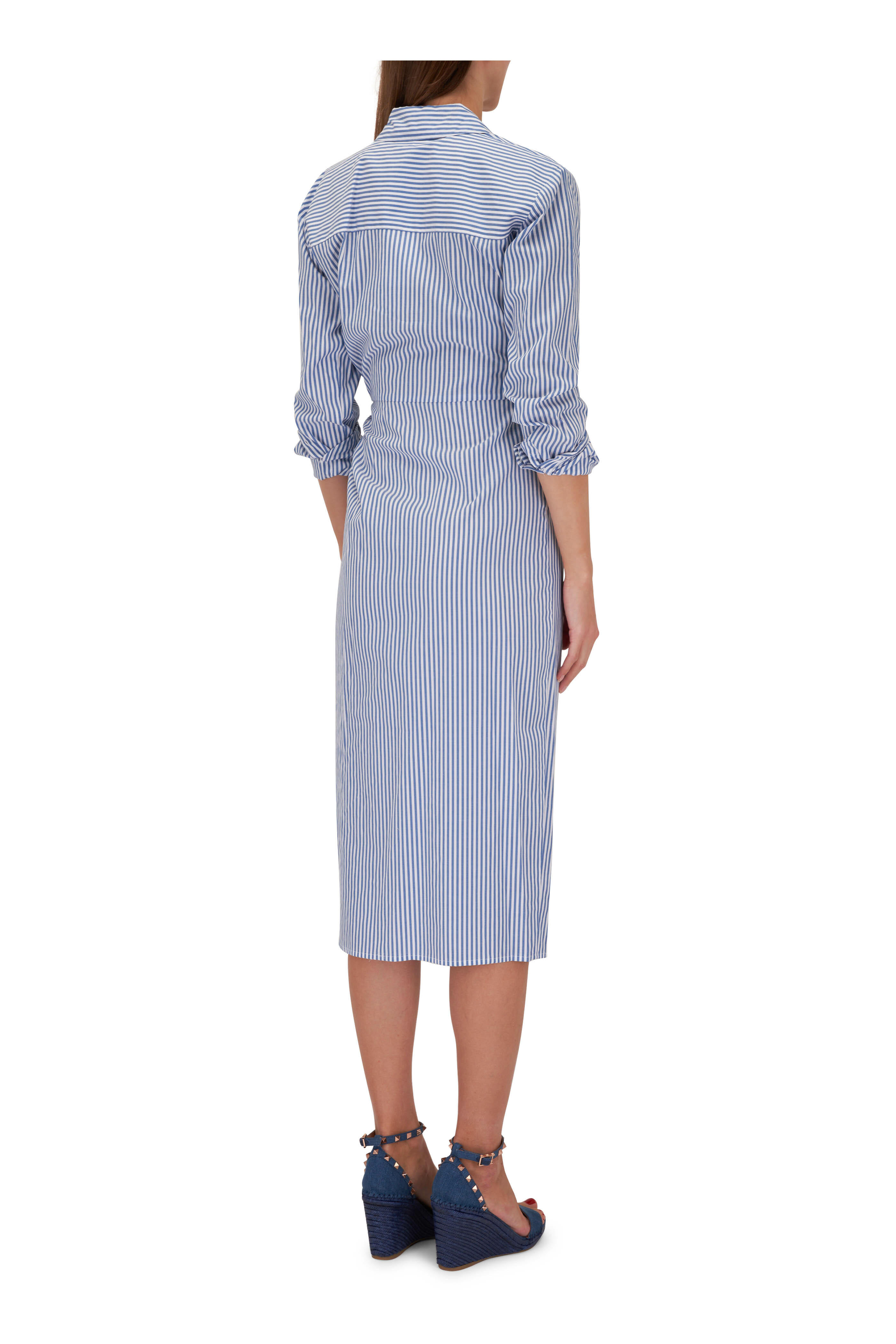 Collared v-neckline. Asymmetric front button placket. Concealed side zip. Imported. Approx. 46" shoulder to hem. 100% cotton. Machine wash.