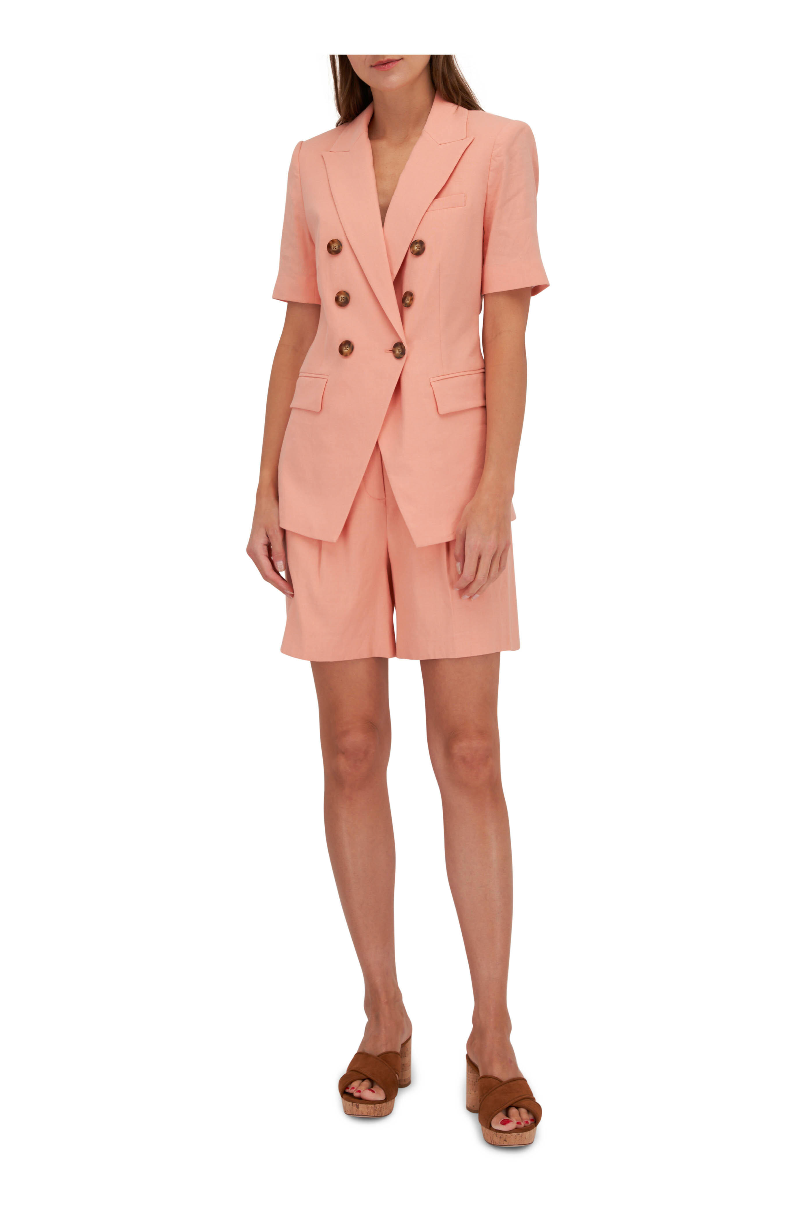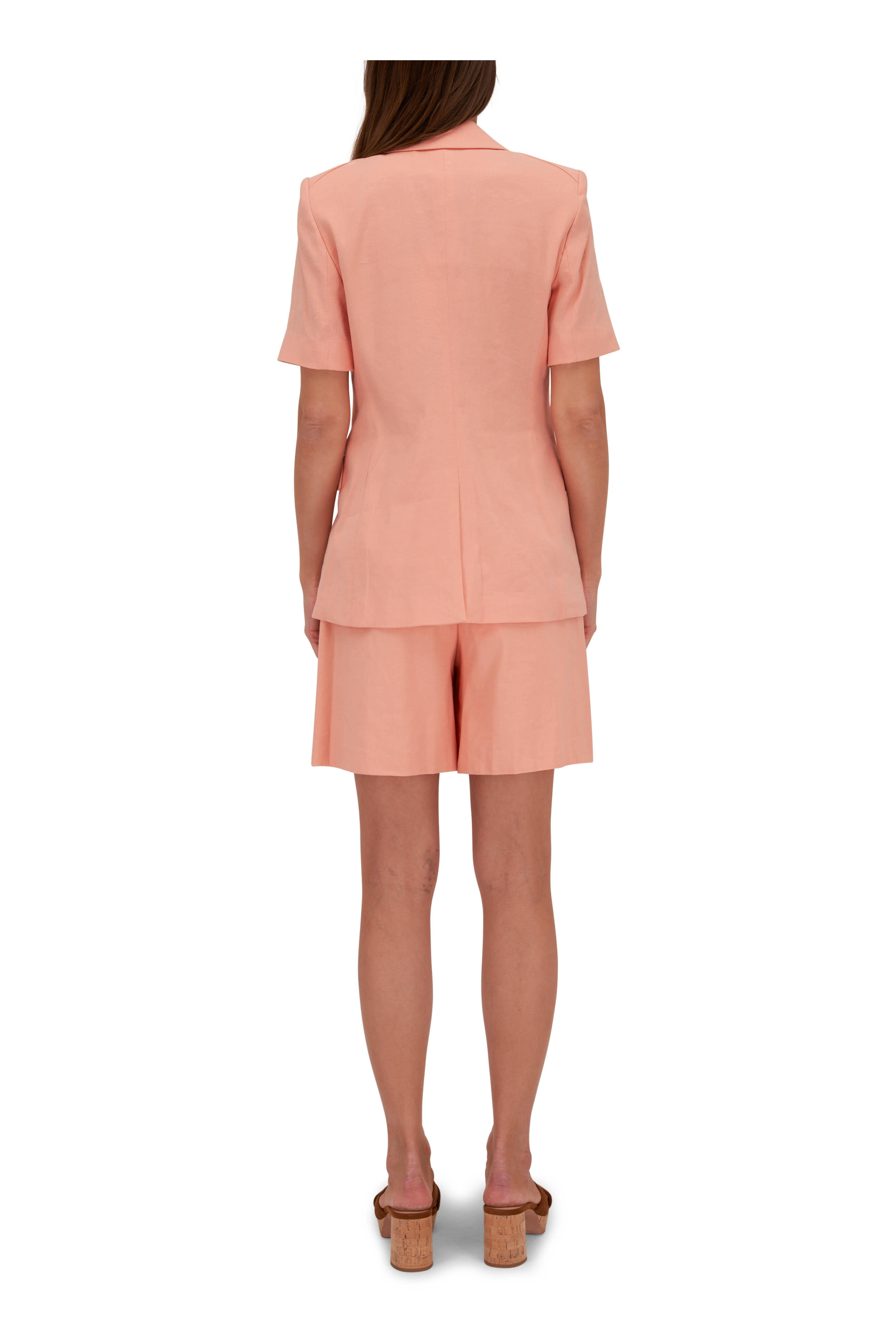 Lined. Zip fly with hook-and-eye closure. On-seam pockets; back welt pockets. Front pleat details. Imported. Rise 12.75”. Inseam 6.25”. Leg opening 27”. 55% linen, 43% viscose, 2% elastane. Dry clean.