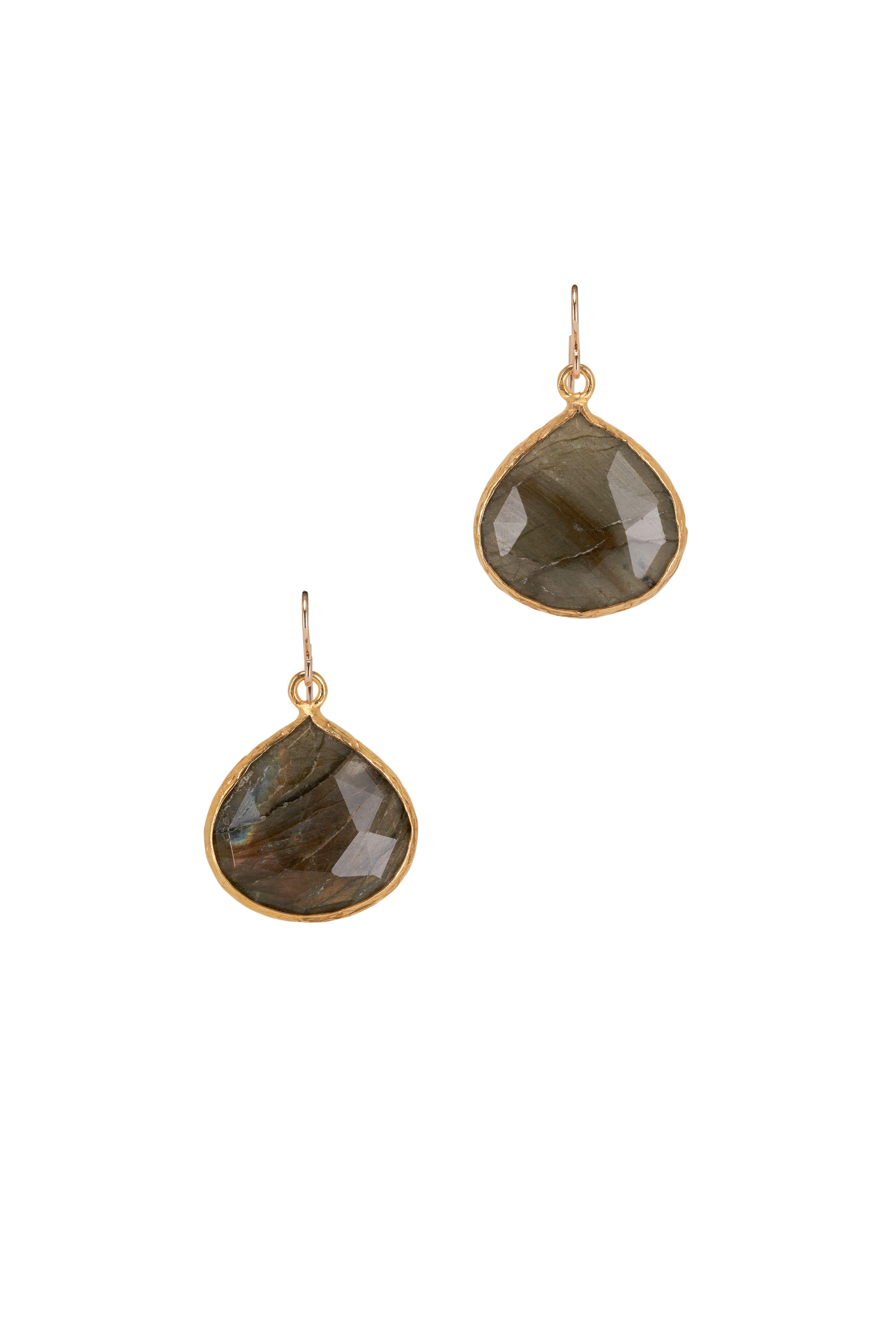 Labradorite Briolette. Sterling Silver Finished in 14K Gold. French Hook Wire. Measures: 0.5" Long.