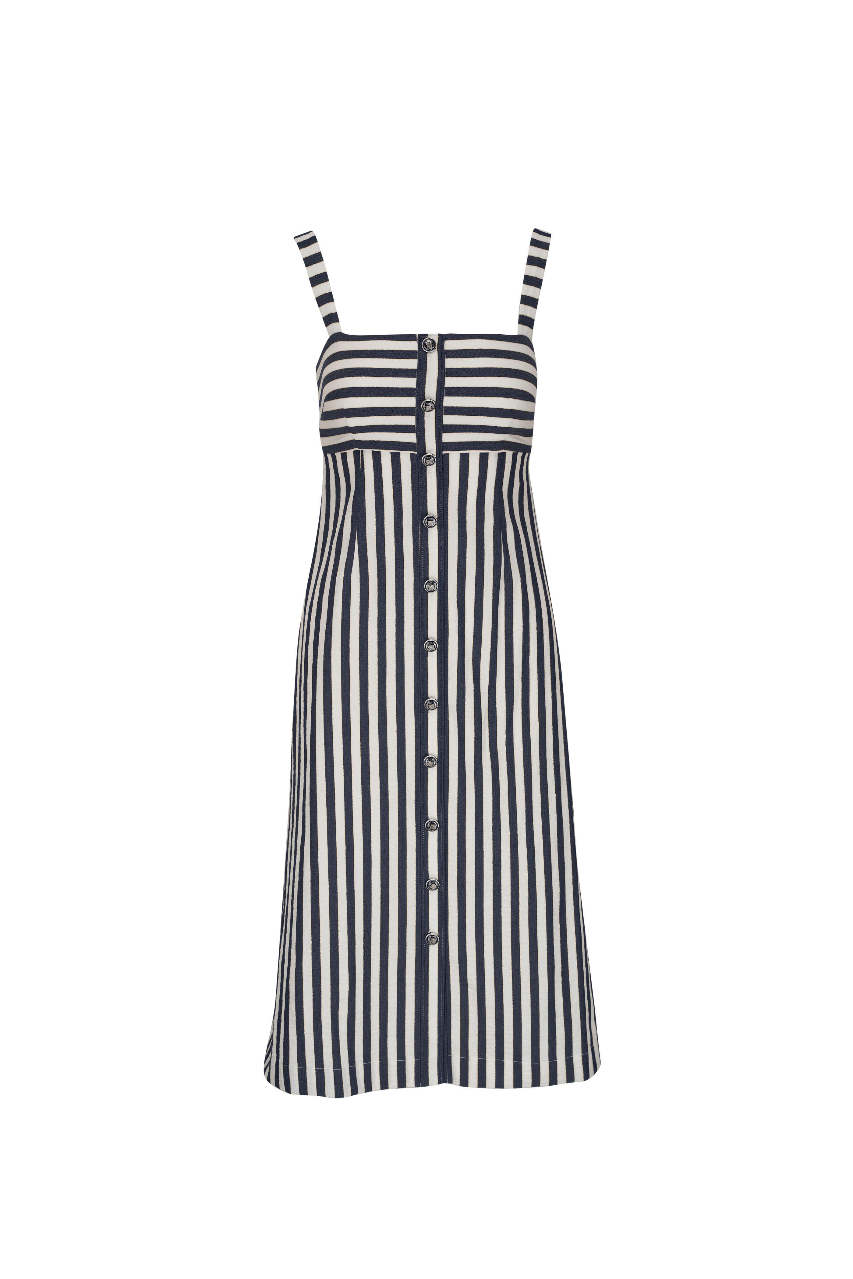 Square neckline. Front button placket. Concealed back zip. Adjustable straps. Straight hem. Made in USA. Shoulder to hem 44". 65% polyester, 34% cotton, 1% metallized fiber. Dry clean.