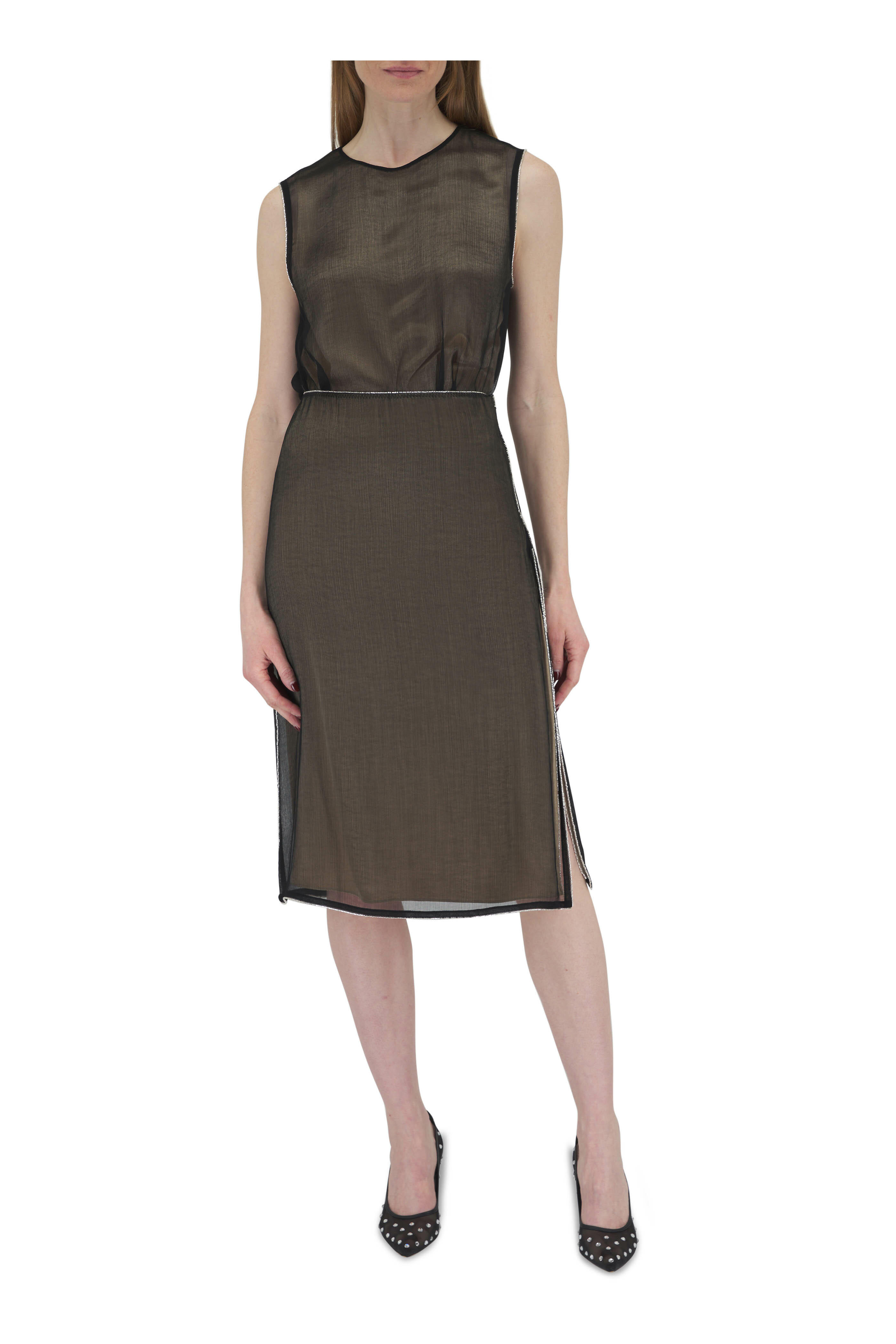 Concealed side zip. Beaded border trim. Left side slit. Imported. 28" shoulder to hem. 100% viscose; fully lined. Dry clean.