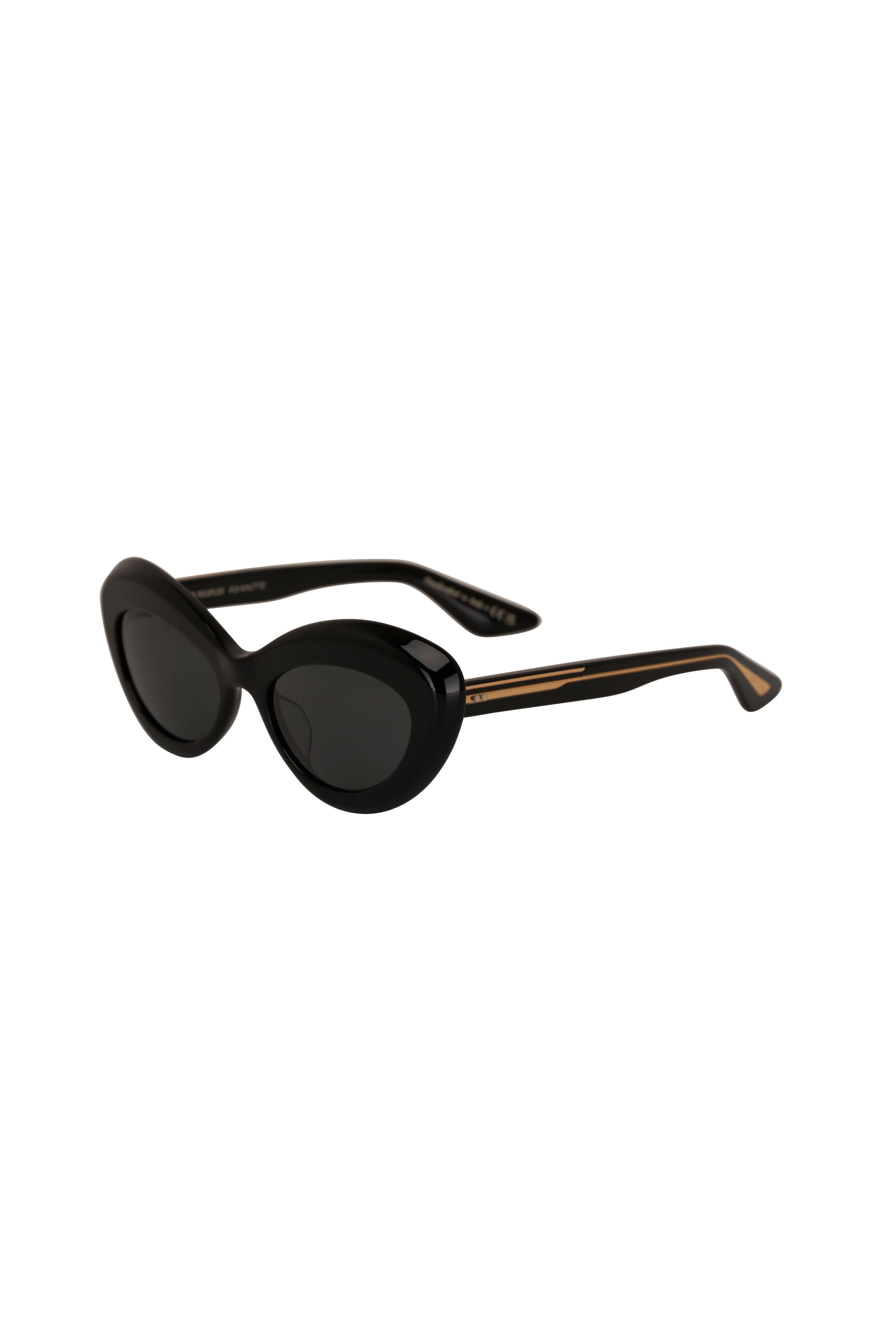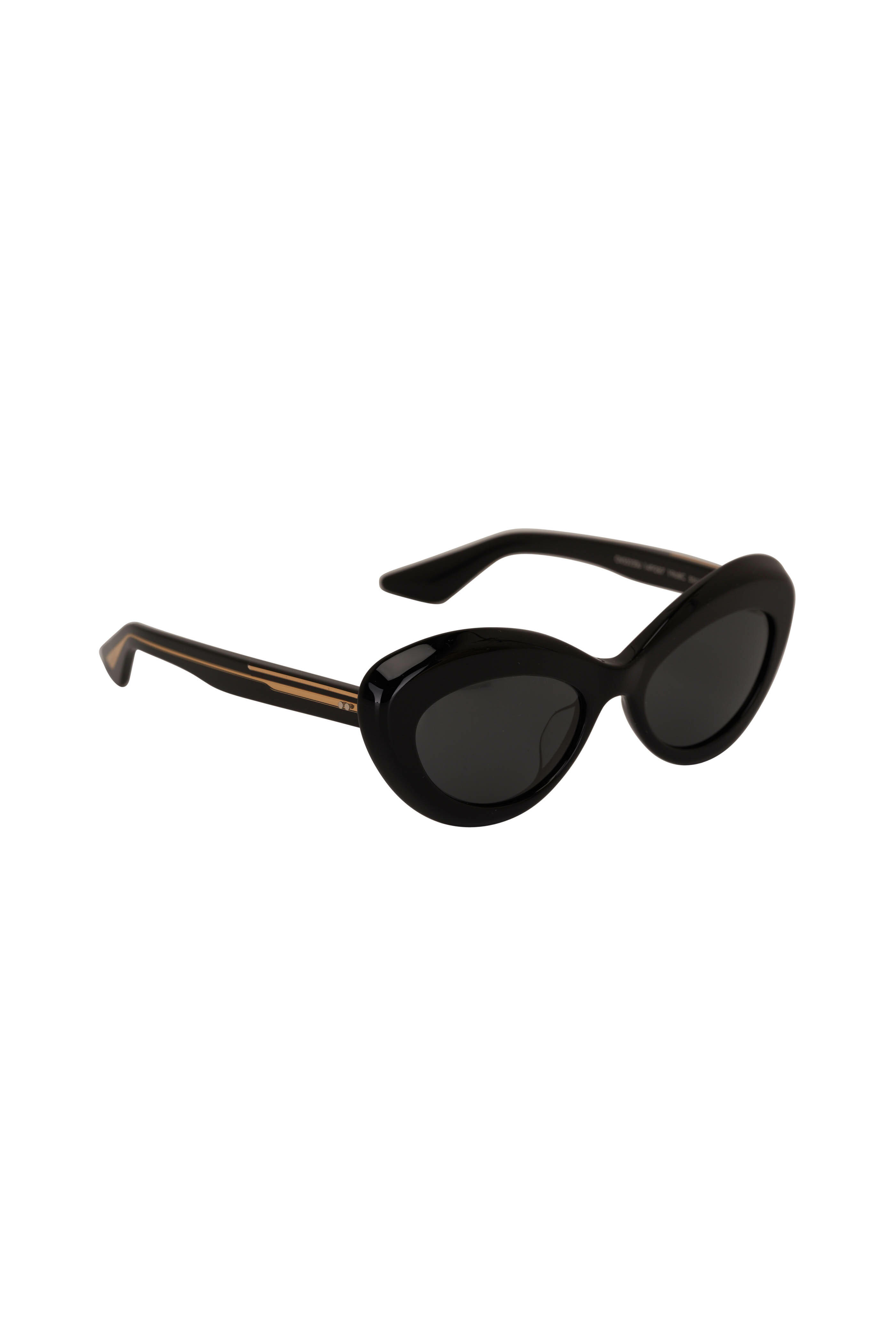 Frame material: acetate. Frame color: black. Frame fit: vintage cat eye. Lens type: glass. Lens color: carbon grey. Made in Italy. 100% UV protection.