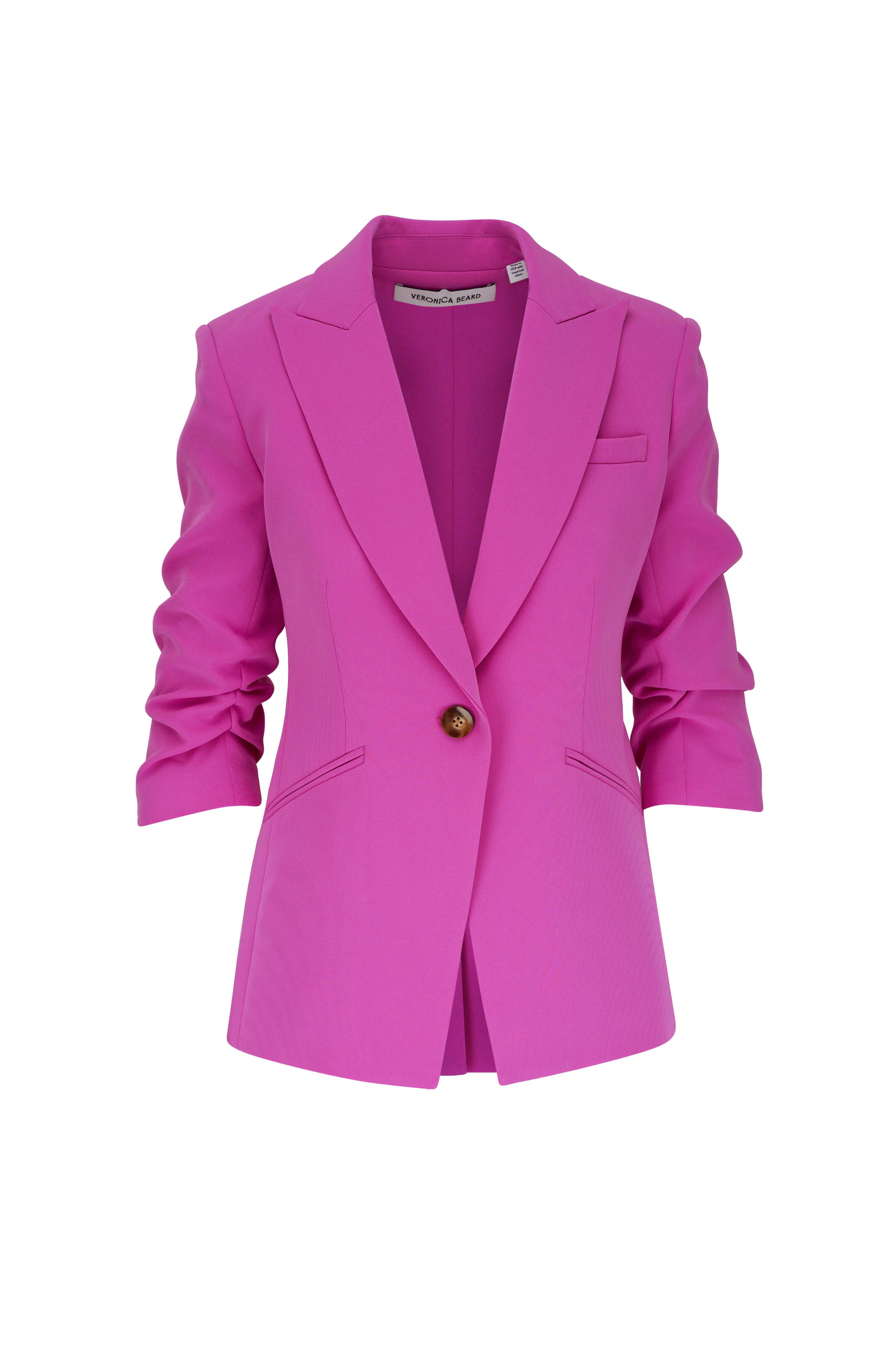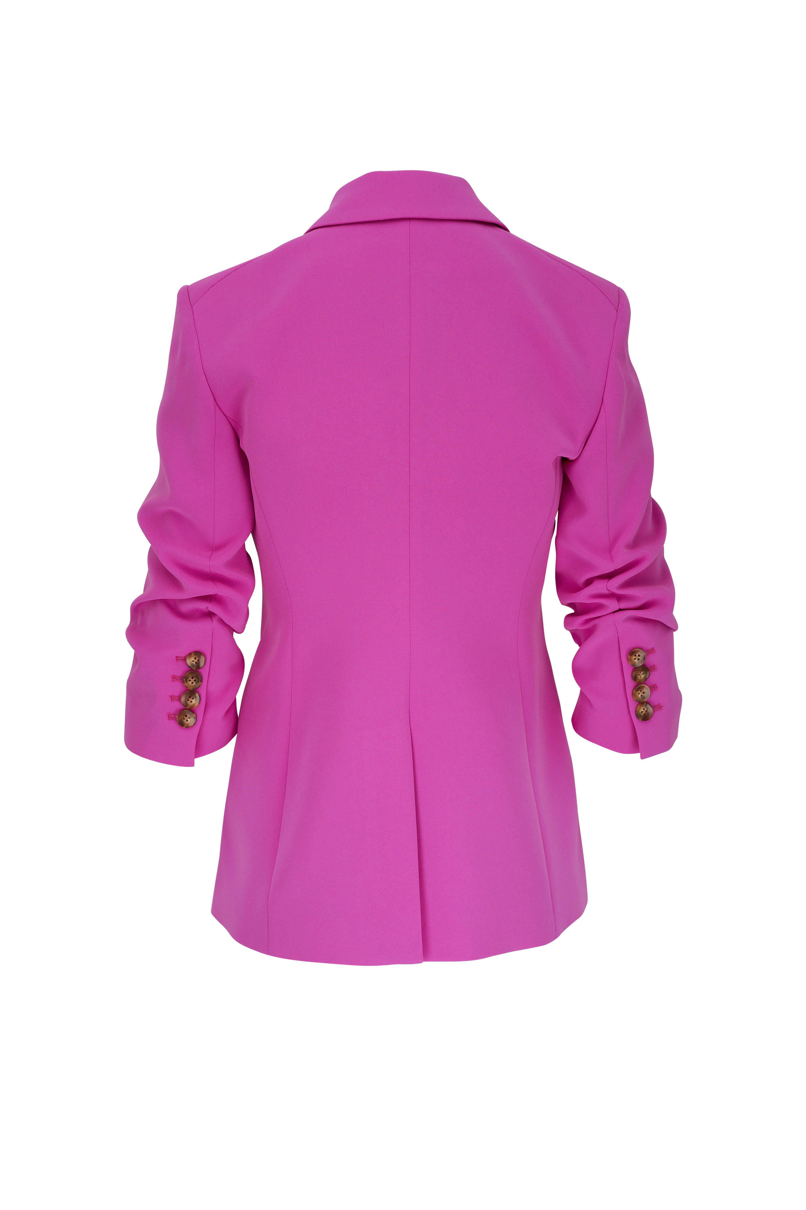 Notched lapels. Single button closure. Crushed sleeves. Chest welt pocket, waist front besom pockets. Single vented back. Made in the USA. Shoulder to hem 27". 65% Triacetate, 35% polyester; fully lined. Dry clean.