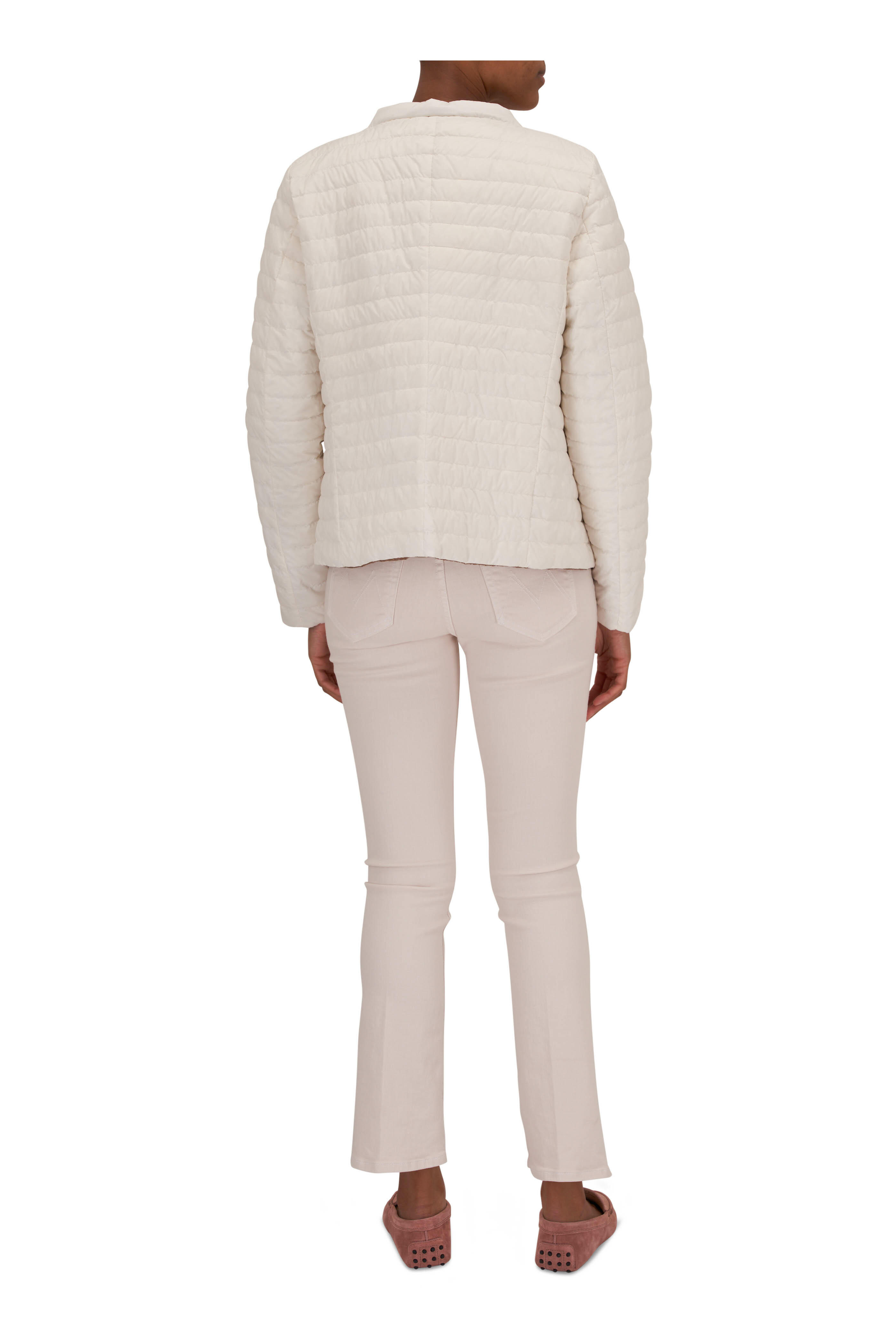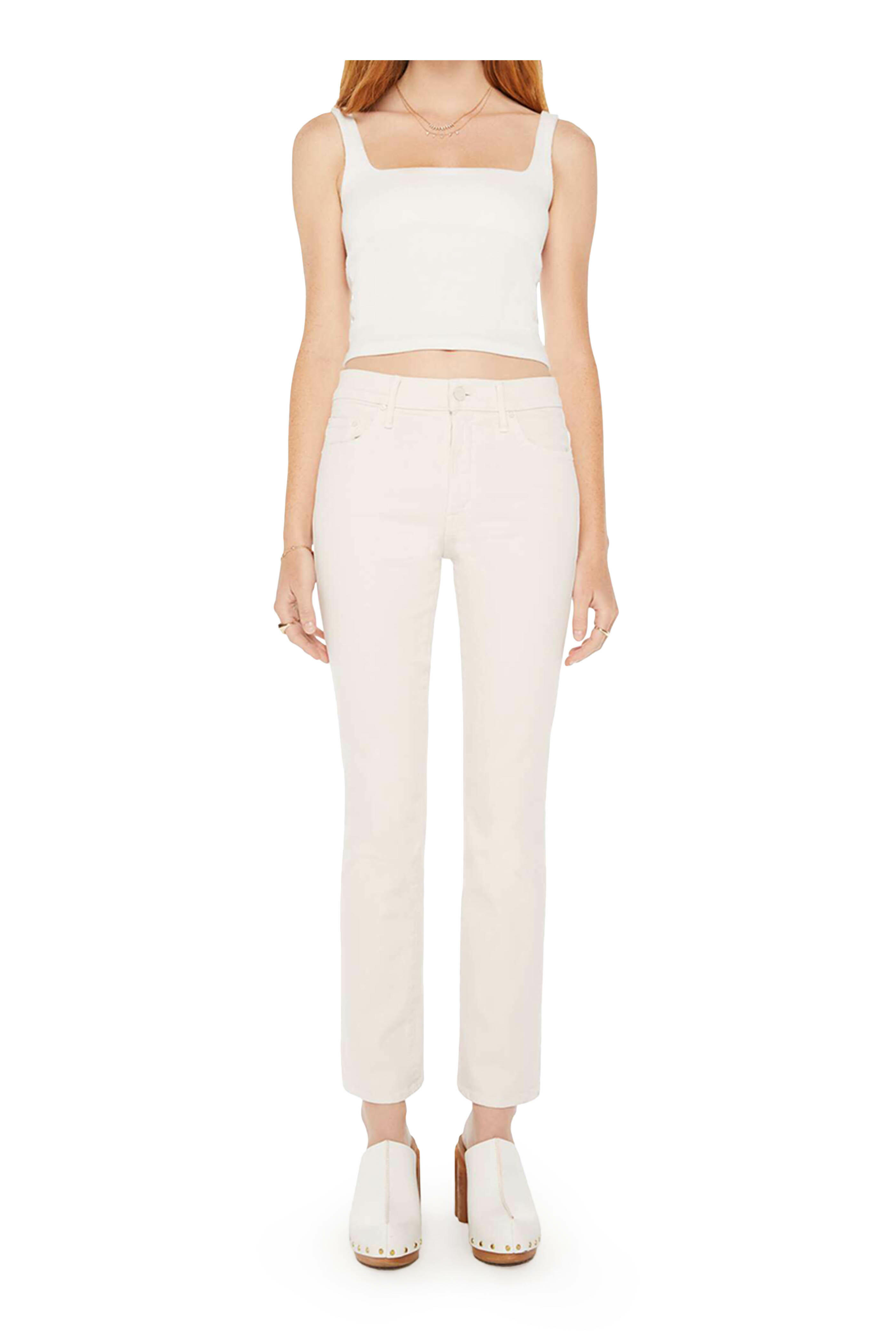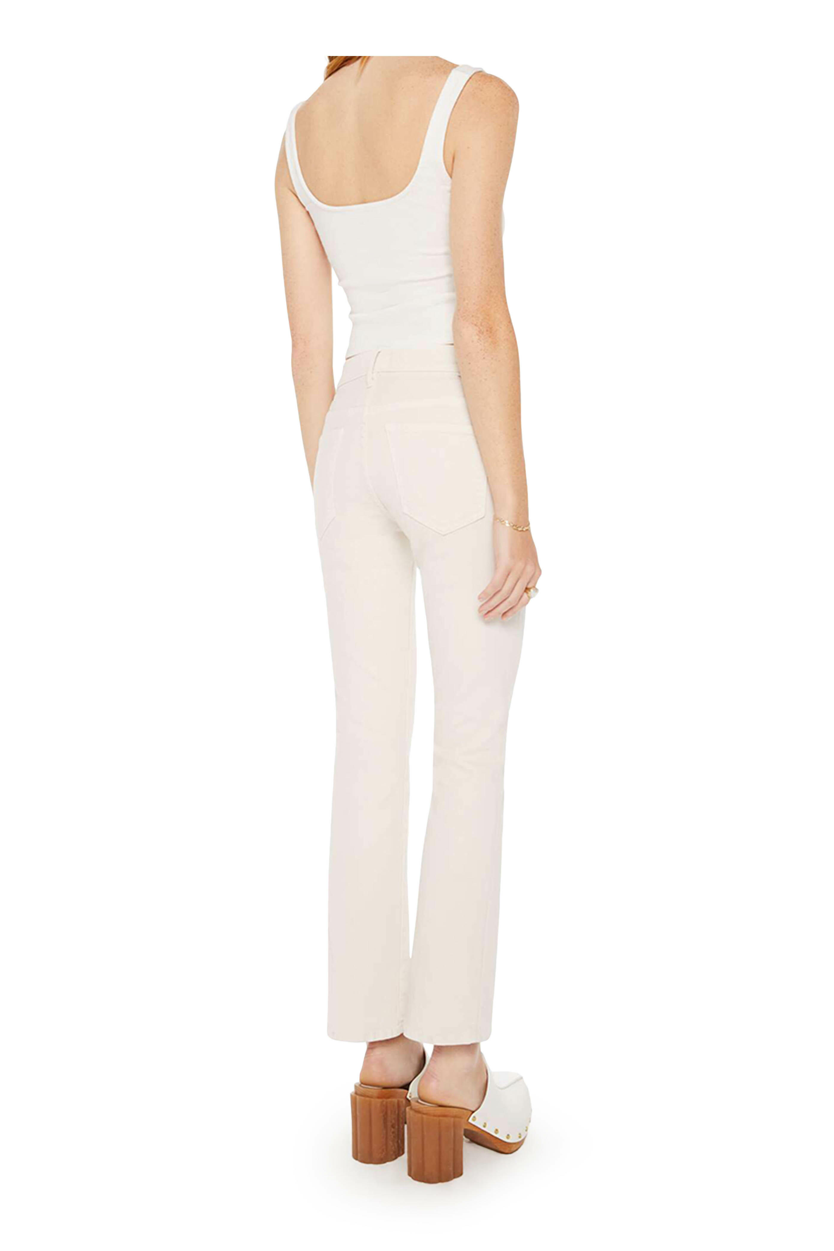 Zip fly with button closure. Banded waistband; Belt loops. Five pocket styling. Clean straight hem. Made in the USA. High-rise bootcut. 94% cotton, 4%polyester, 2% elastane. Machine wash.