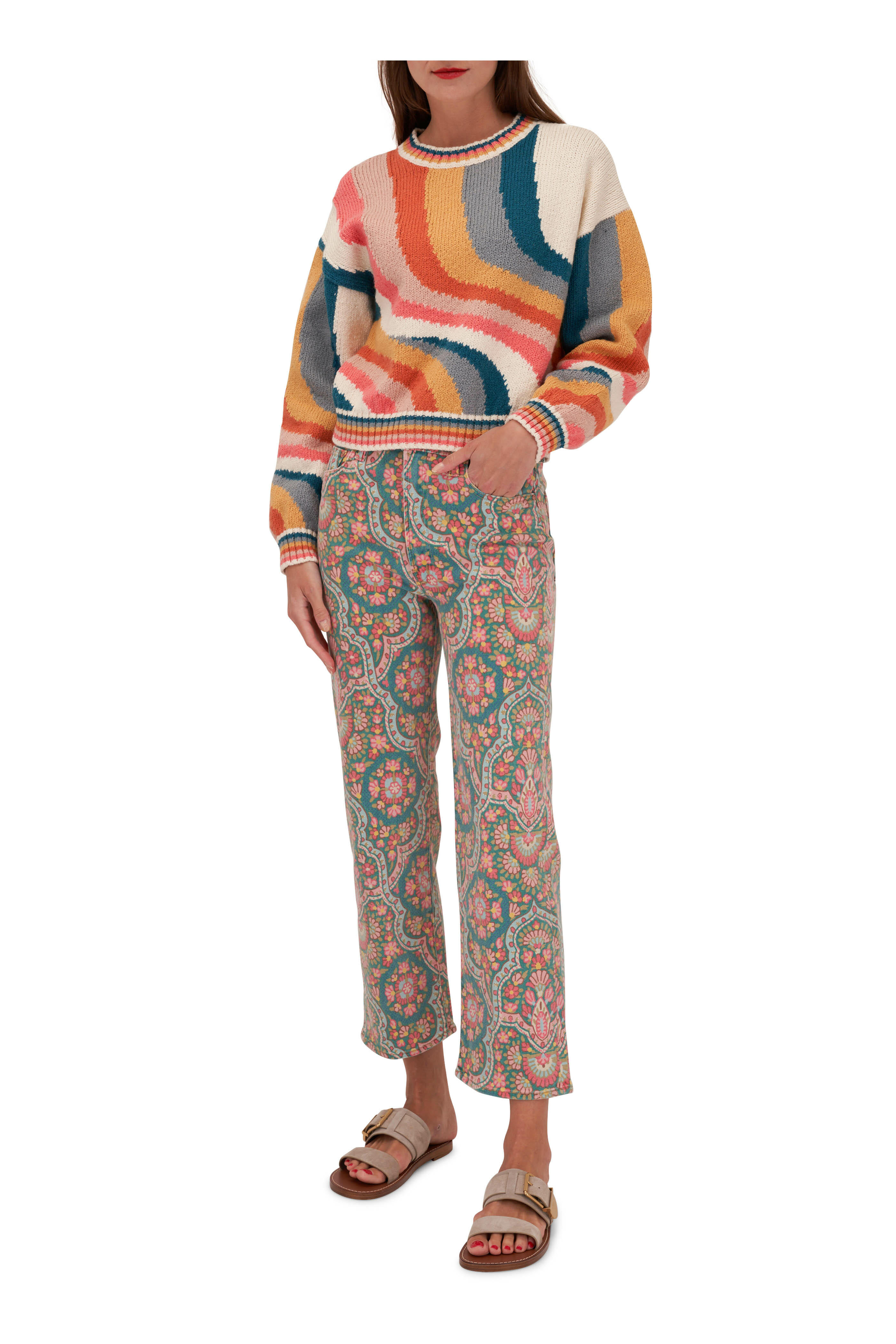 Zip fly with button closure. Five pocket styling. Made in the USA. 11 1/4" Rise. 27 1/2" Inseam. 17 1/2" Leg Opening. High waisted, wide straight leg. Ankle-length inseam. 93% cotton, 5% polyester, 2% elastane. Machine wash.