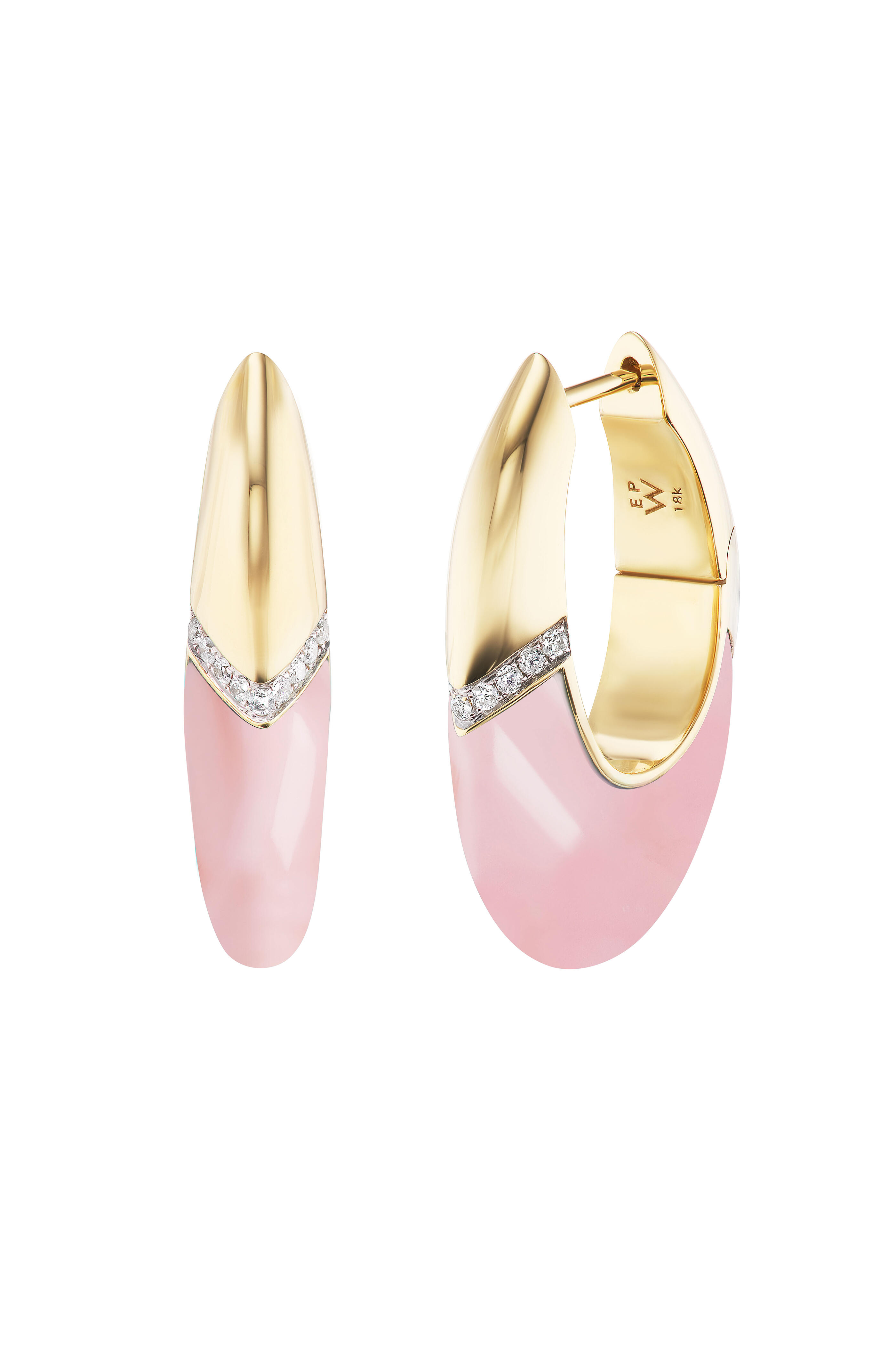 18K Yellow Gold. Diamond: 0.14 tcw, G/VS. Pink Opal. Measures: 27 mm.