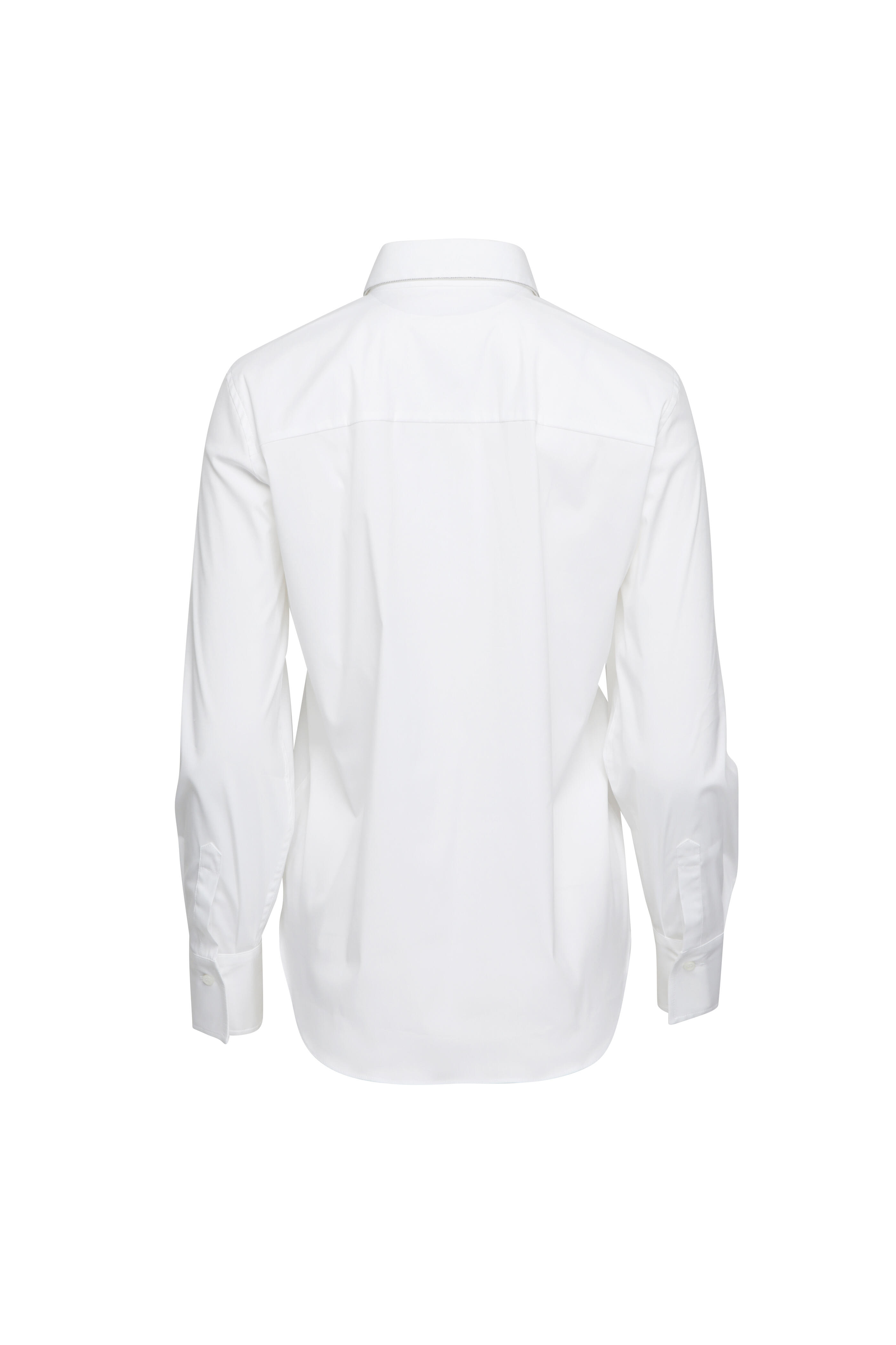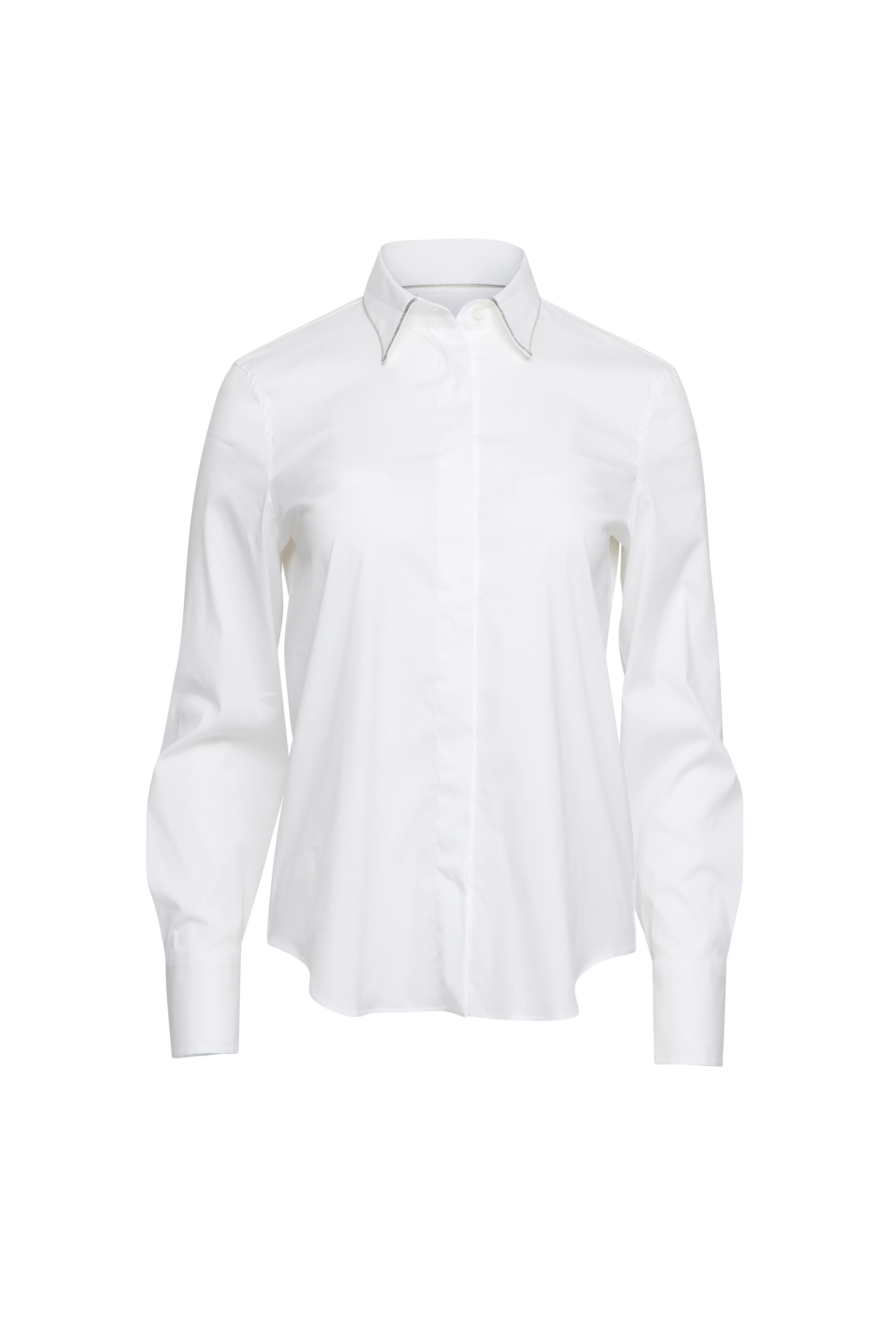 Collar; monili trim detail. Long sleeves; button cuffs. Concealed button up front closure. Relaxed fit. Rounded hem. Made in Italy. 72% cotton, 23% nylon, 5% elastane. Dry clean.