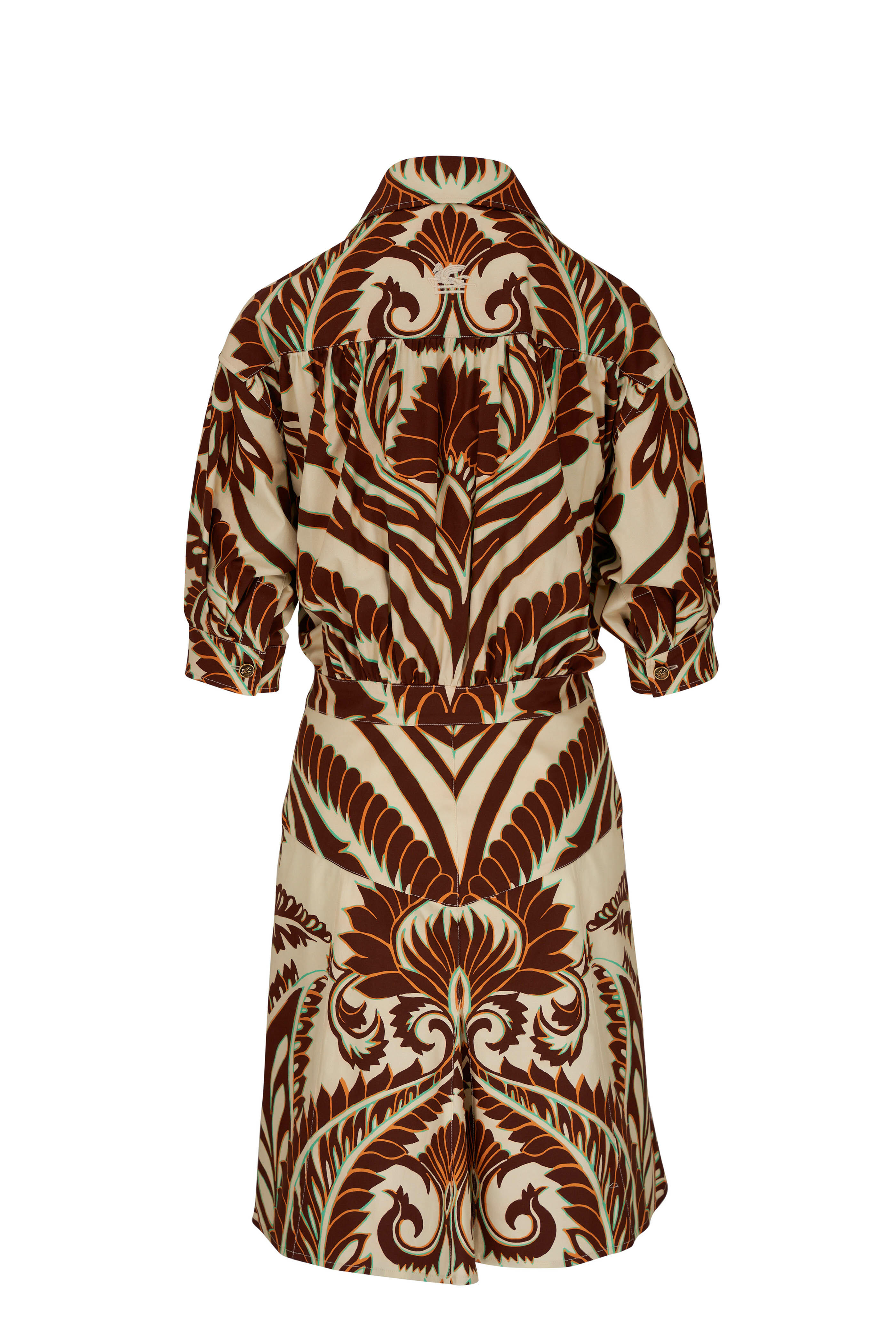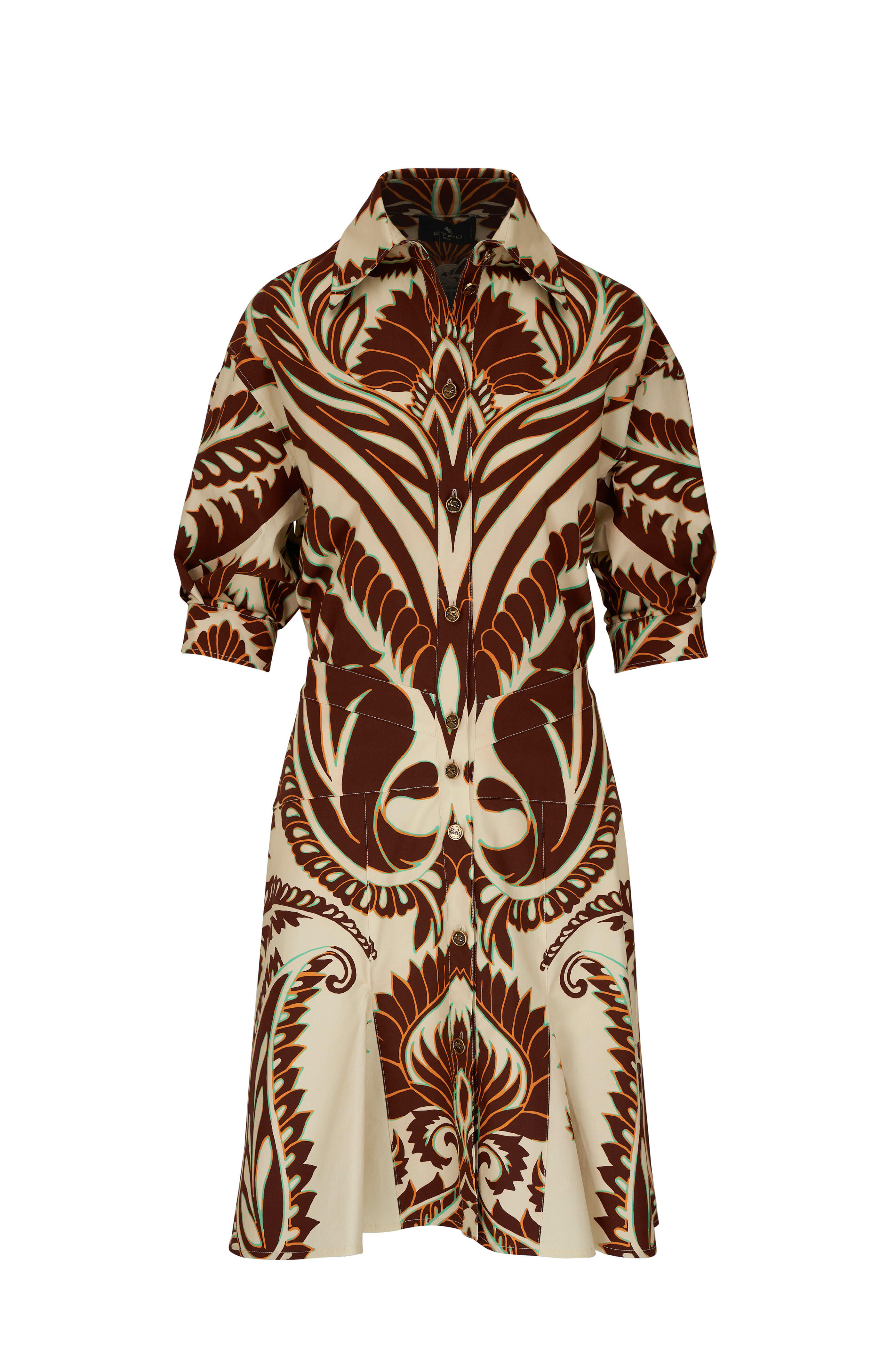 Spread collar. Front button placket. Elbow-length sleeves. Single button cuffs. Godet skirt. Made in Italy. Approx. 38" shoulder to hem. 97% cotton, 3% elastane. Dry clean.