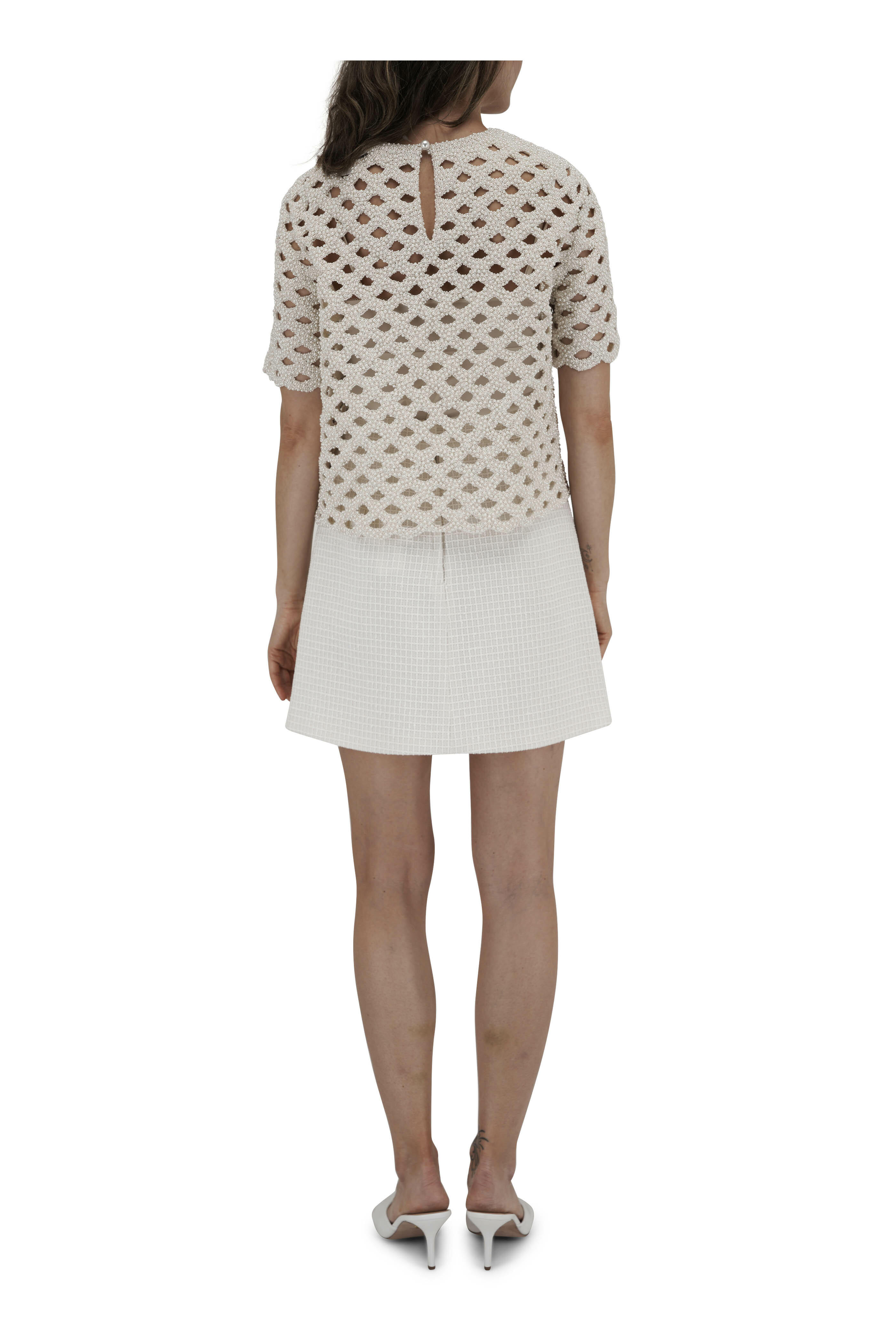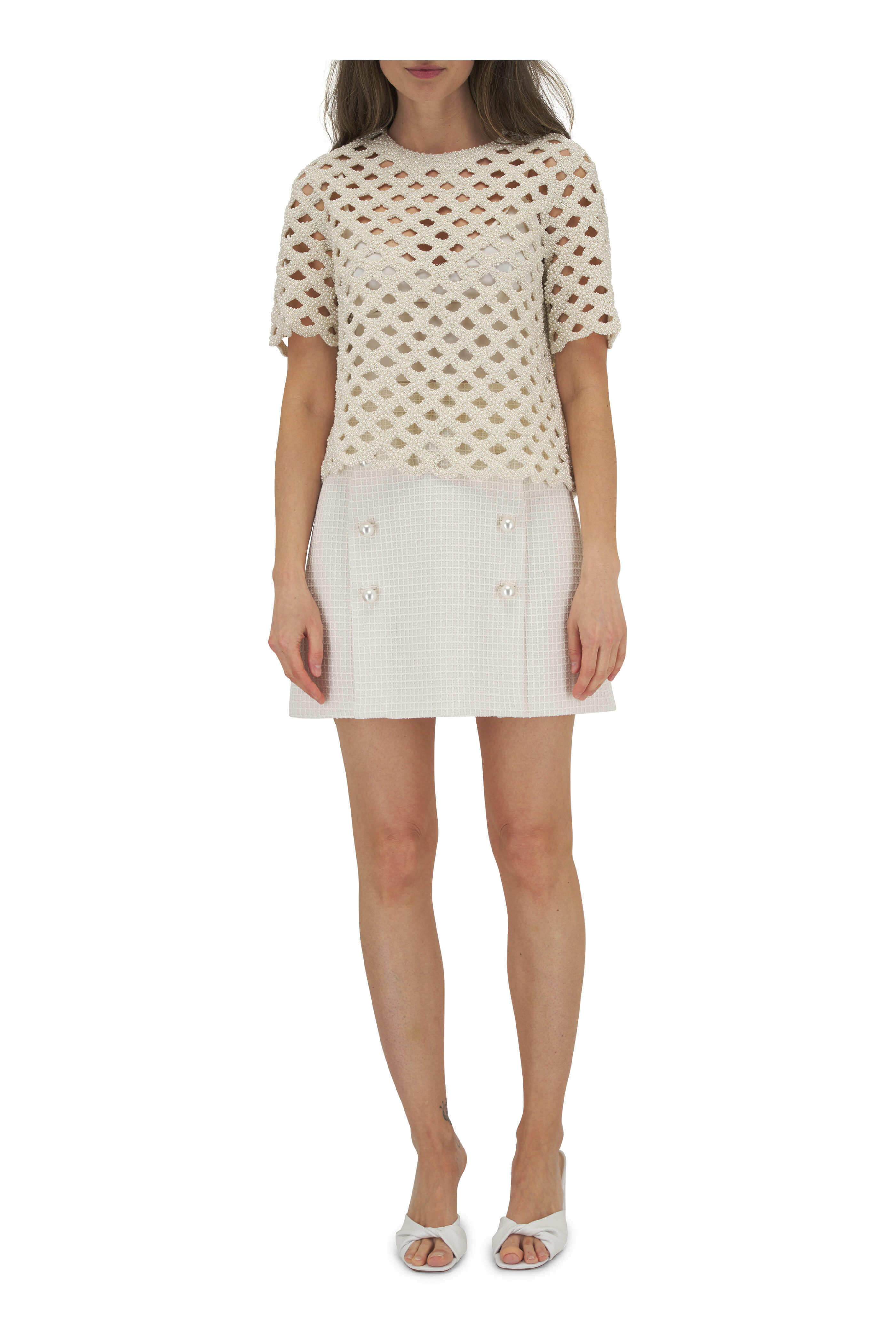 Concealed back zip; hook-&-bar closure. Decorative pearl buttons. Straight hem. Made in the USA. 17" shoulder to hem. 61% wool, 20% polyurethane, 9% cotton, 8% polyamide, 2% acrylic; fully lined. Dry clean.