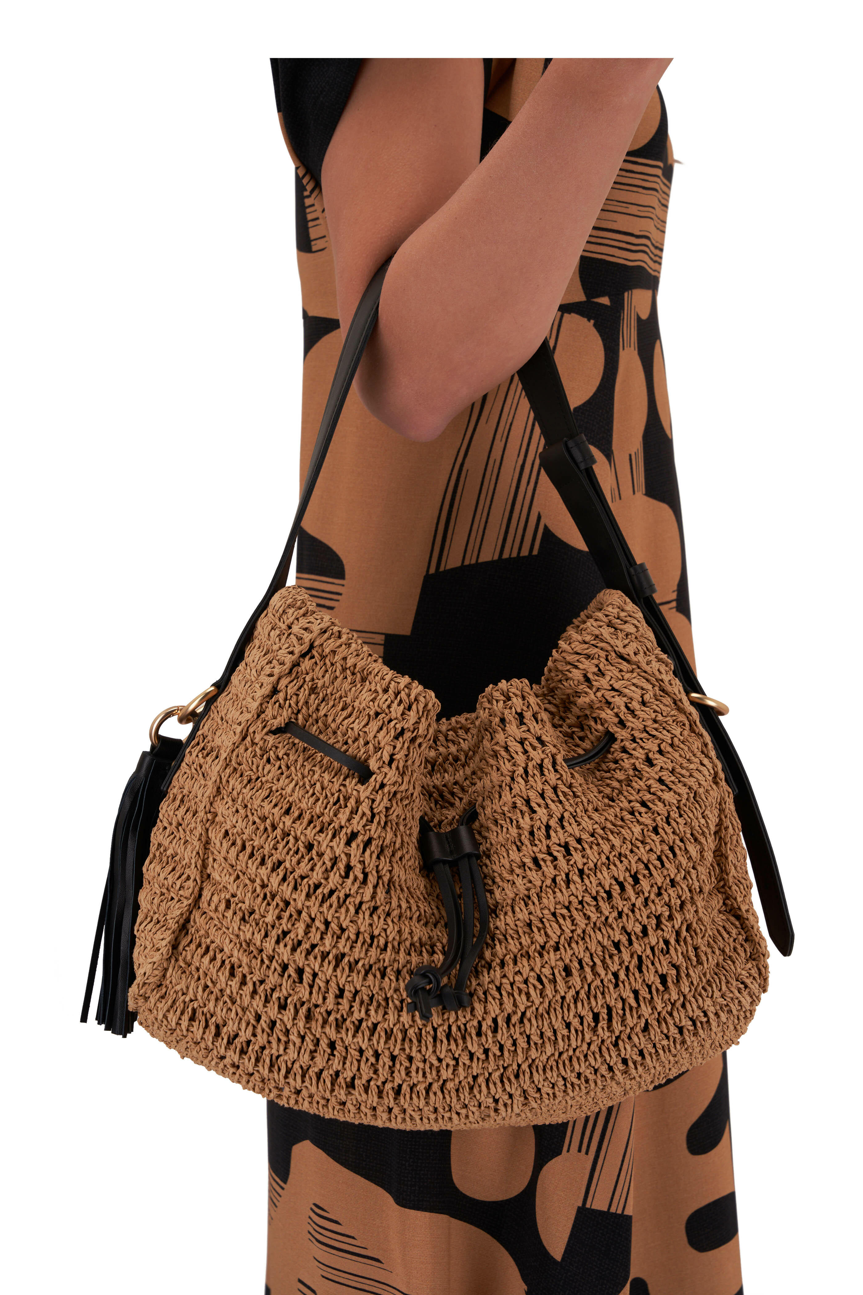 Raffia and leather. Single adjustable shoulder strap. Magnetic top snap closure. Leather drawstring. Interior dual wall pocket and zip pocket. Matte gold-tone metal hardware. Removable leather fringe keychain. Cotton twill lining. Imported. Height: 9.4". Width: 13.7". Depth: 5.9".