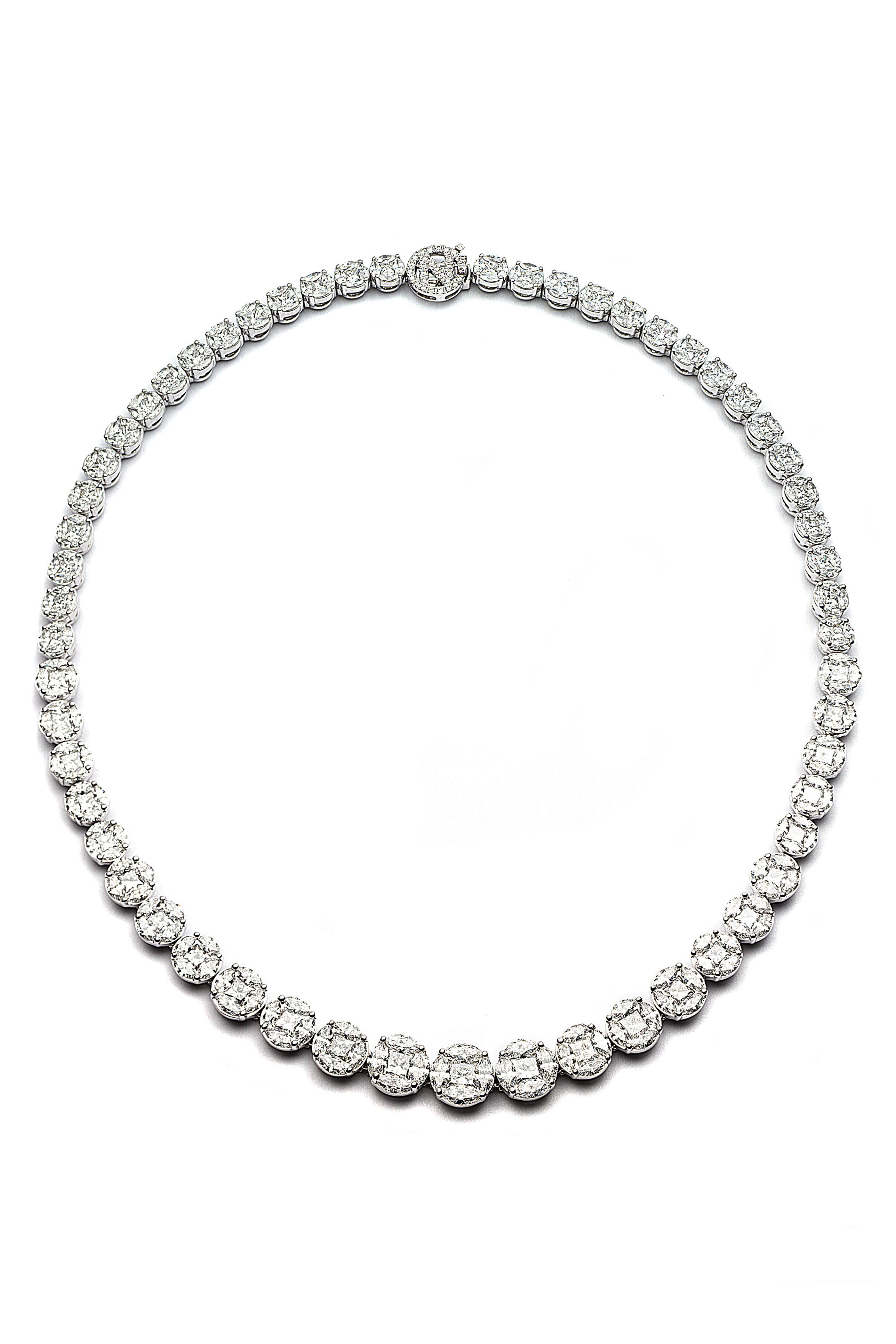 White Gold: 750/1000; 18K. White Rhodium Finish. Diamonds: 18.89 tcw. Color: E-F. Clarity: VS1. Measures: 16" long.