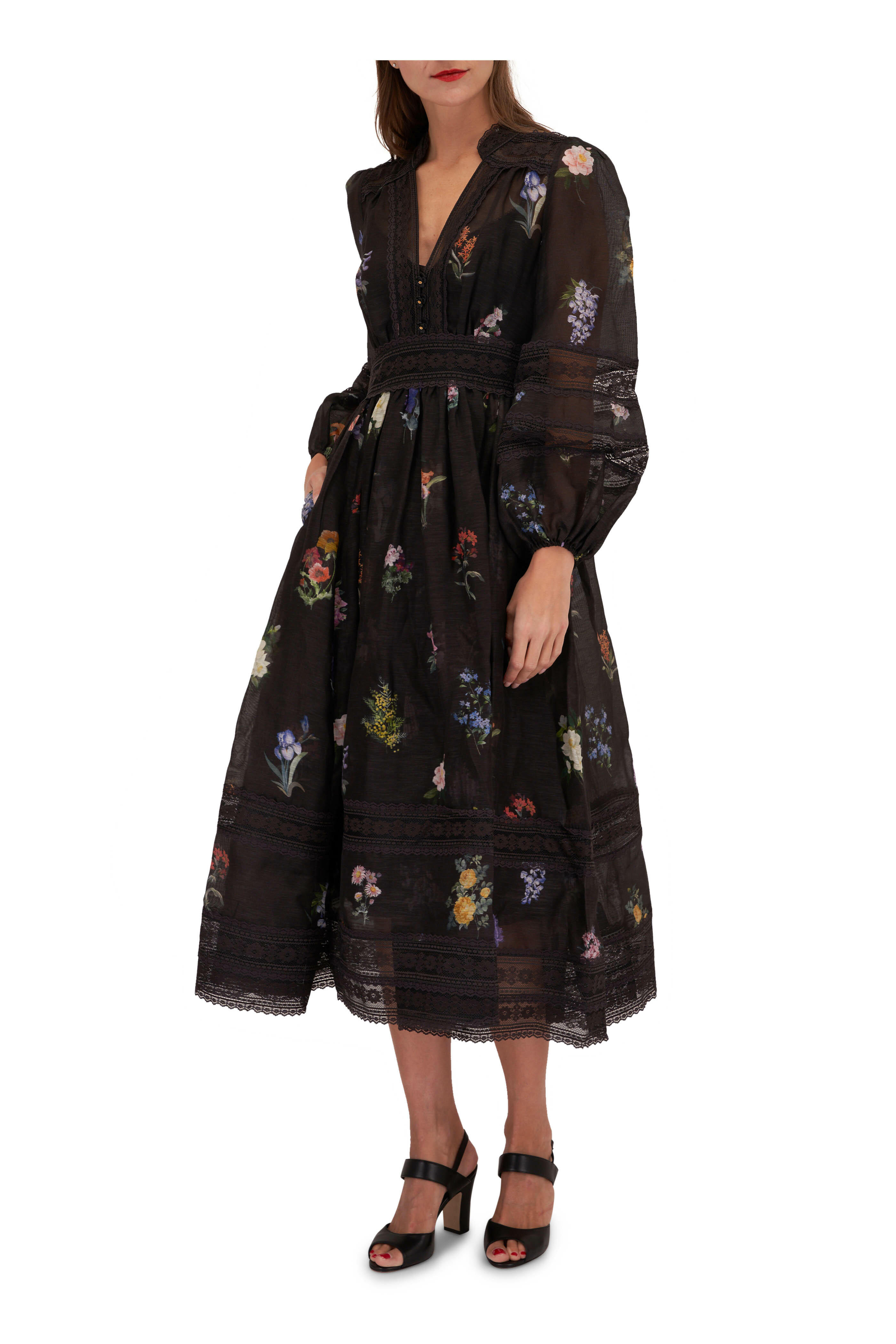 V-neckline. Concealed back zip. Blouson sleeves; elasticized cuffs. On-seam pockets. Imported. Approx. 49" shoulder to hem. 53% linen, 47% silk; Slip: 86% recycled post-consumer polyester, 14% elastane. Dry clean.
