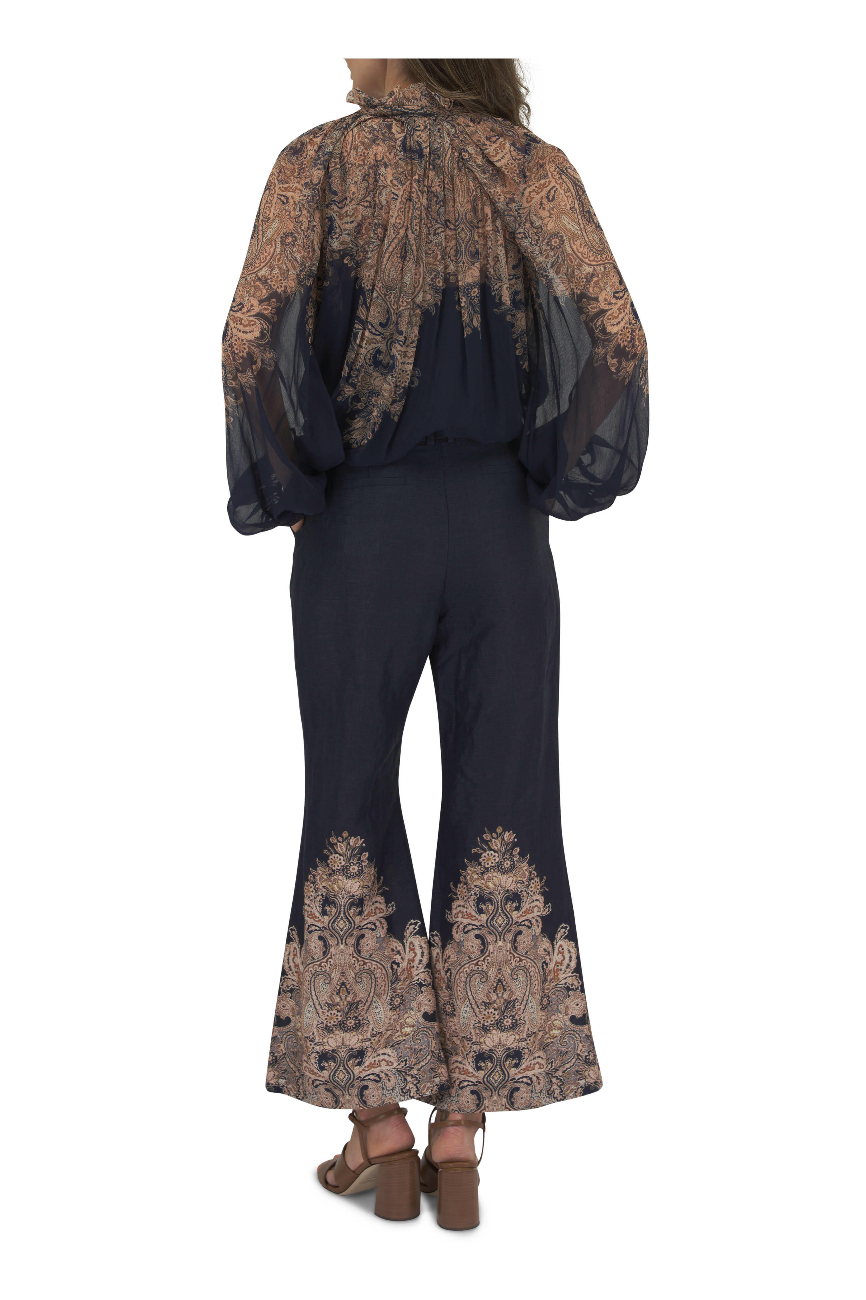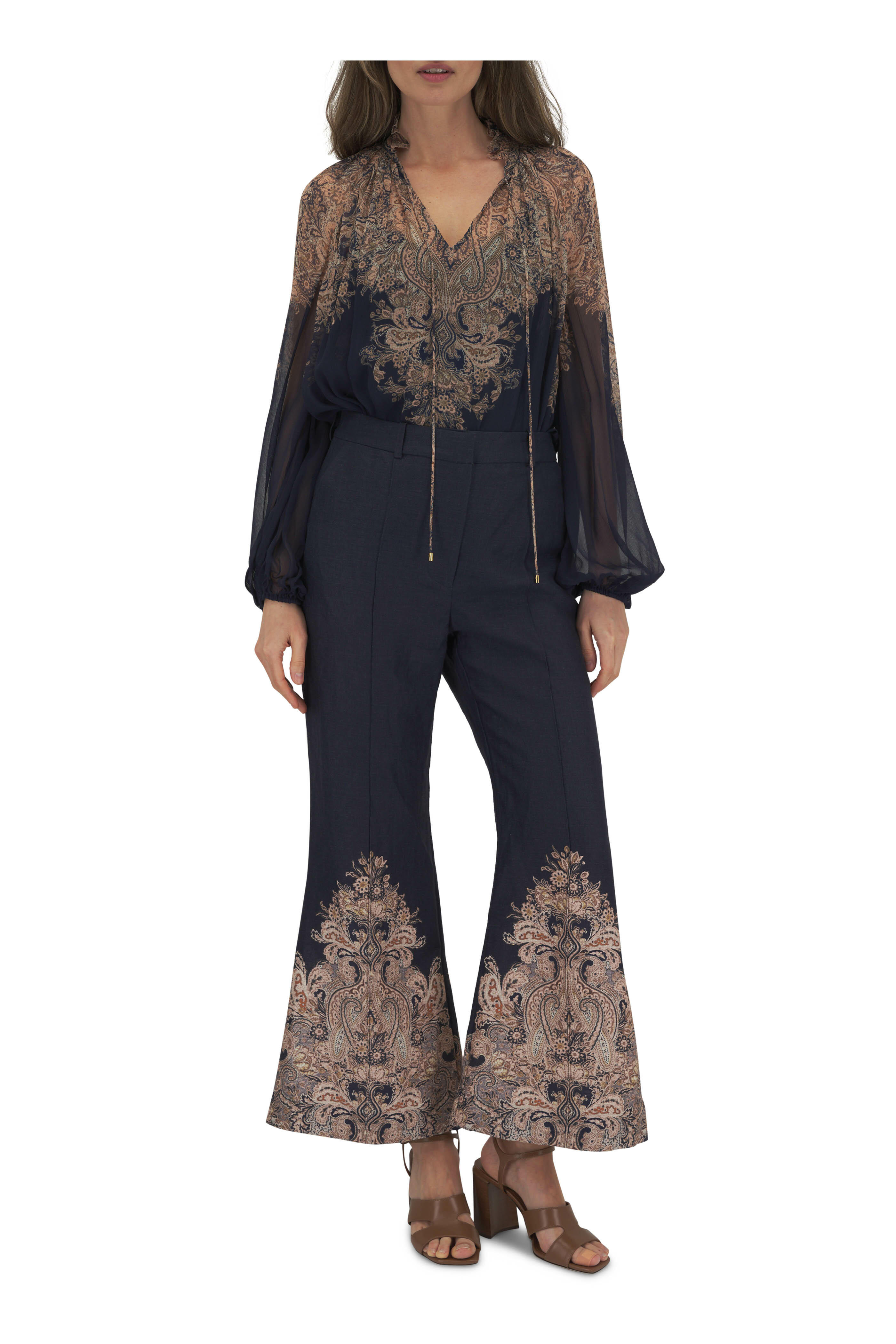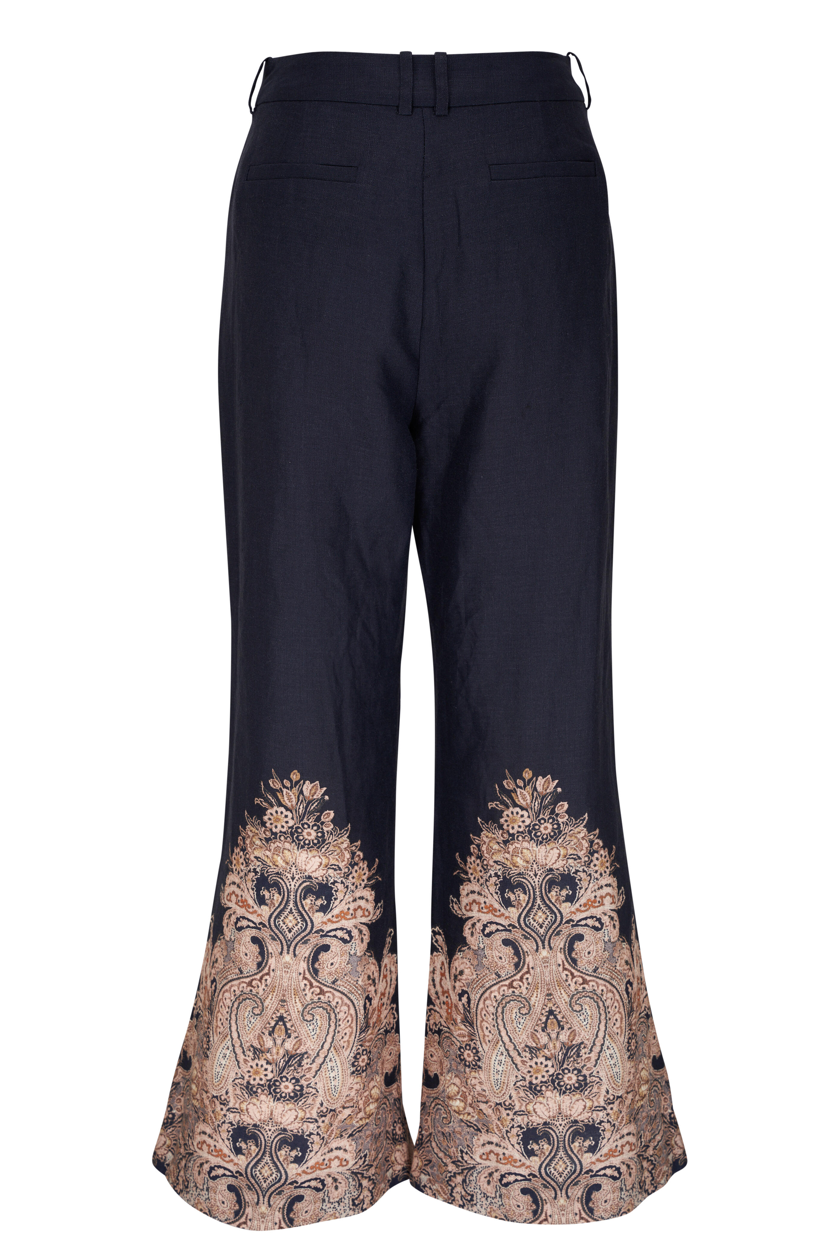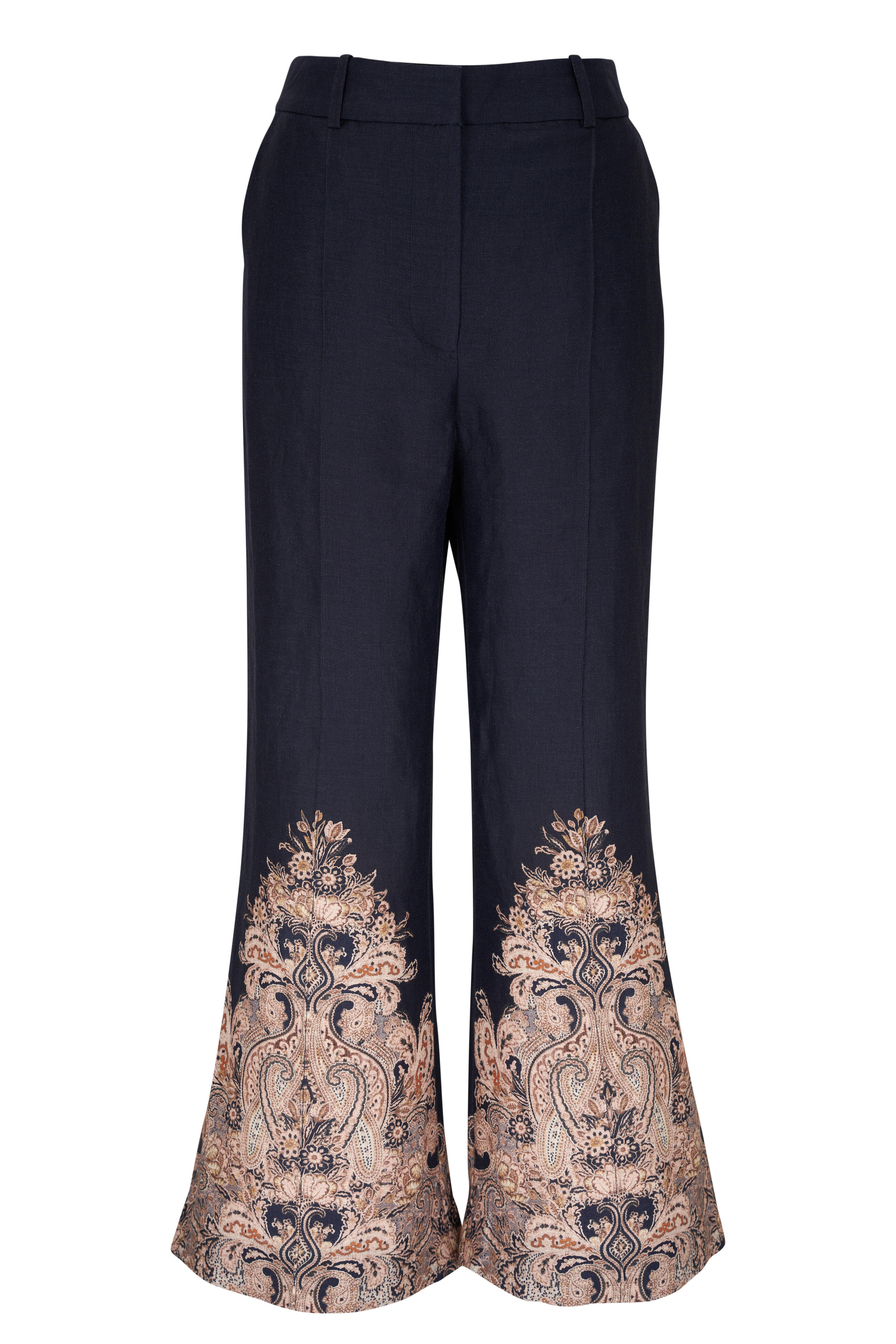 Zip fly with double hook-and-eye closure. Banded waistband; belt loops. Side slash pockets; Back welt pockets. Front seam detail. Imported. 100% linen. Dry clean.