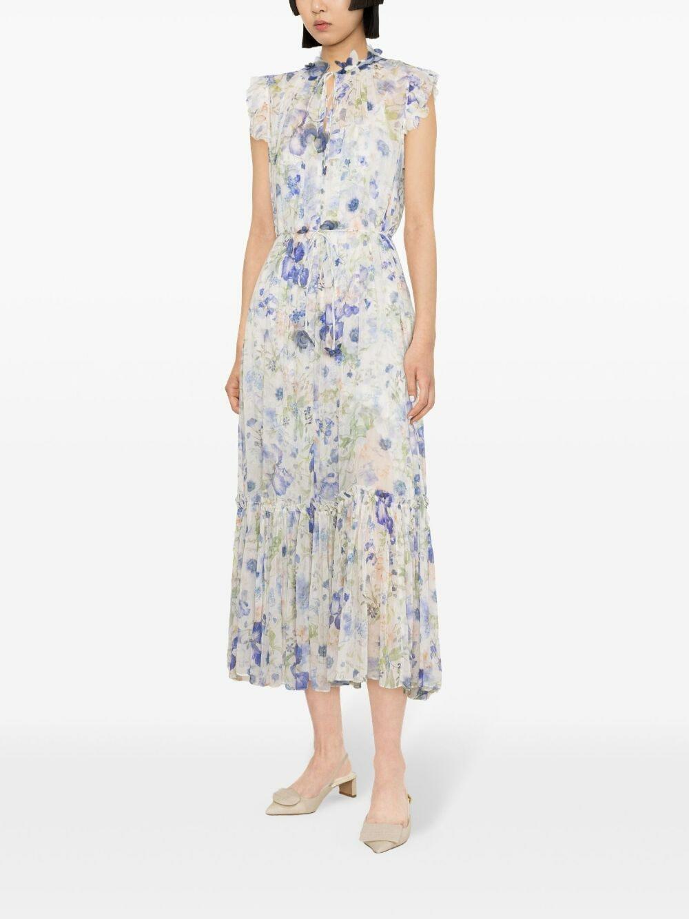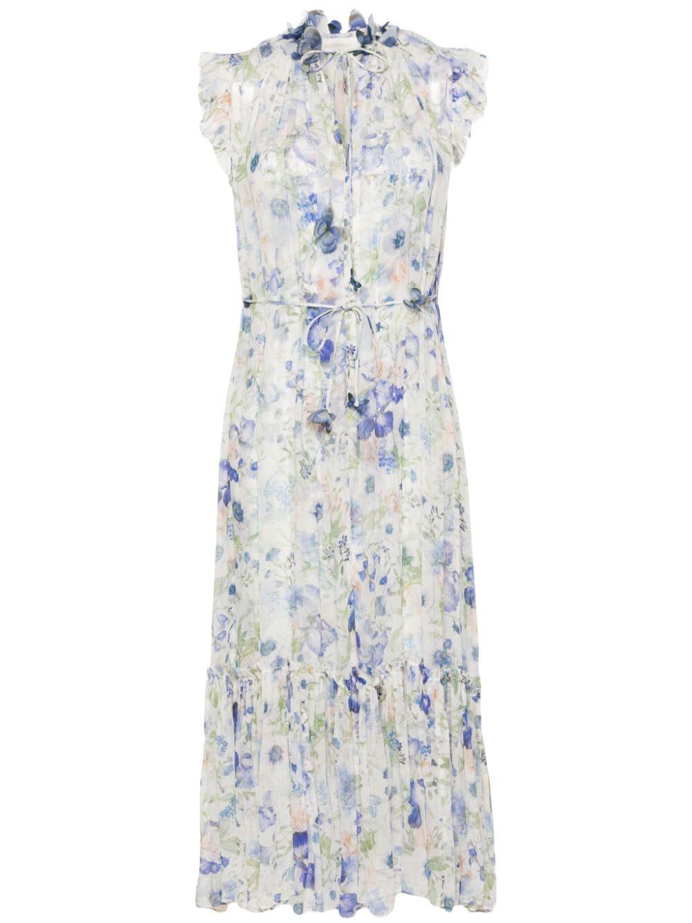 Ruffled v-neckline with tie closure. Slip-on style. Self-tie waist. Ruffled cap sleeves. Tiered skirt. Imported. Approx. 50 ½" shoulder to hem. 100% viscose; Slip: 86% recycled post-consumer polyester, 14% elastane. Dry clean.