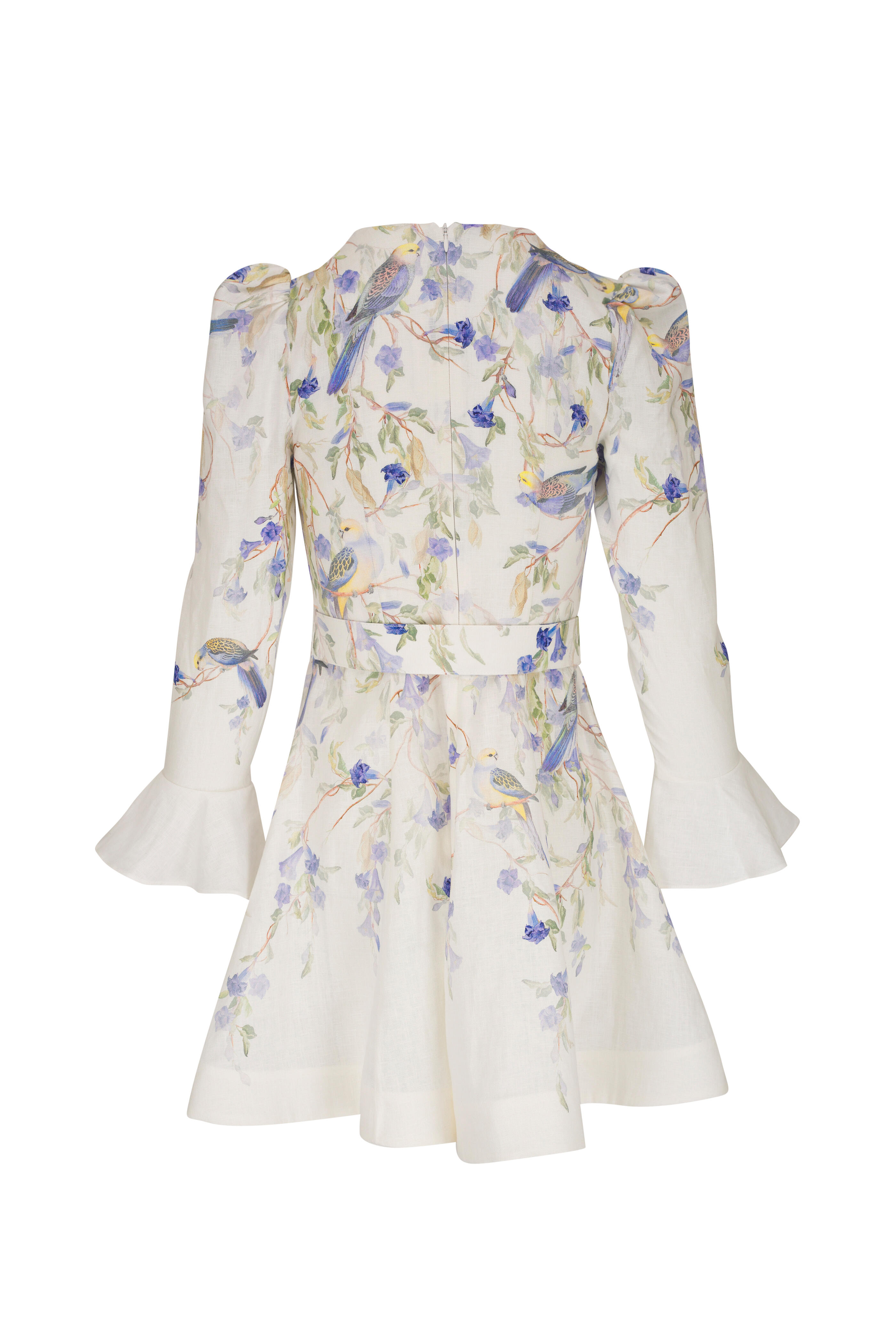 Deep v-neckline. Concealed back zip. Removable self-belt; chain stitch belt loops. Long sleeves; fluted cuffs. Crinoline hem. Imported. Fitted at the waist. Relaxed through hips and legs. True to size. 100% linen. Dry clean.