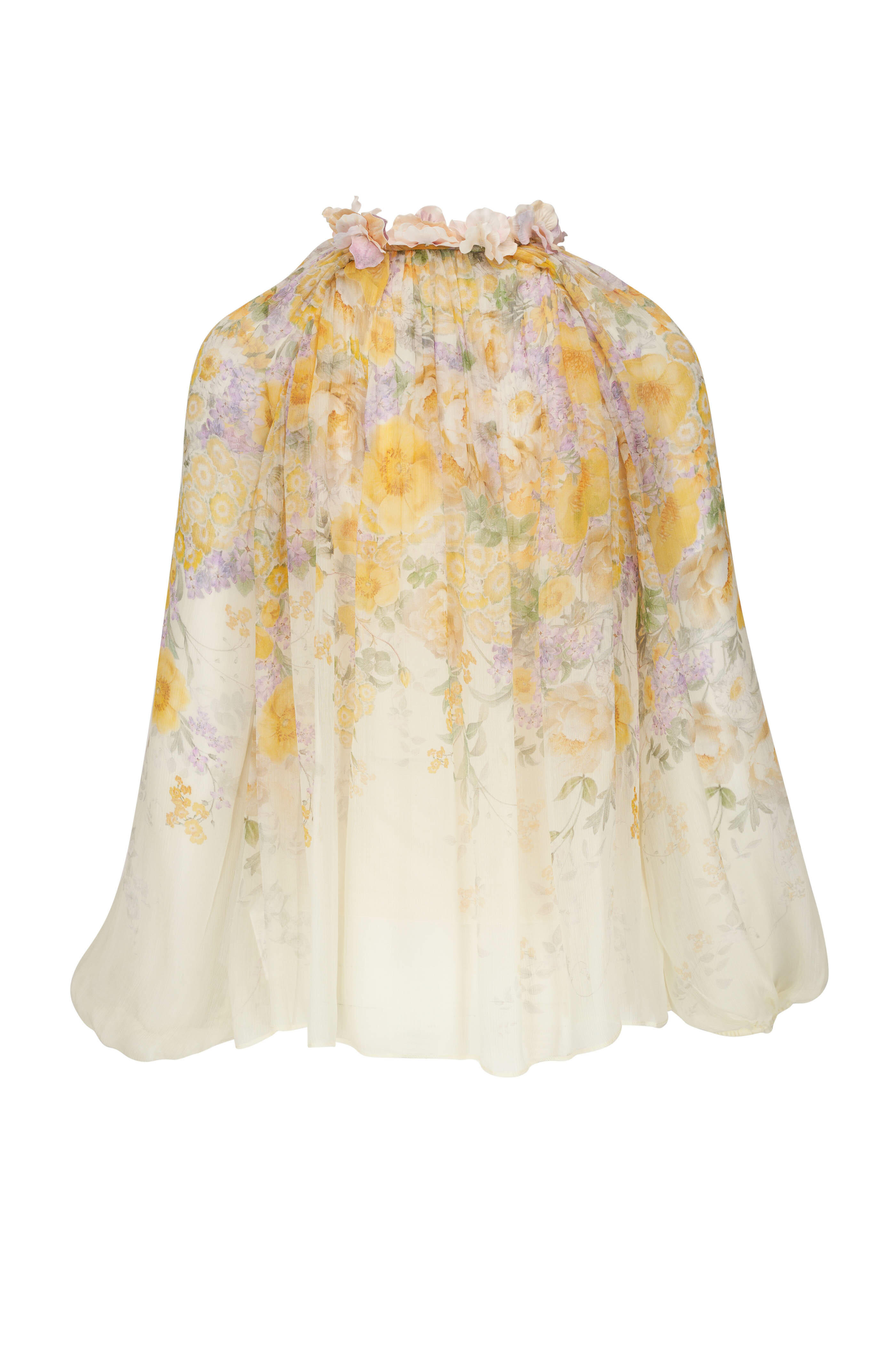 Ruffled split neckline; self-tie closure. Pullover style. Blouson sleeves; elasticized cuffs. Separate slip cami included. Curved, surplus hem. Imported. 100% viscose. Dry clean.