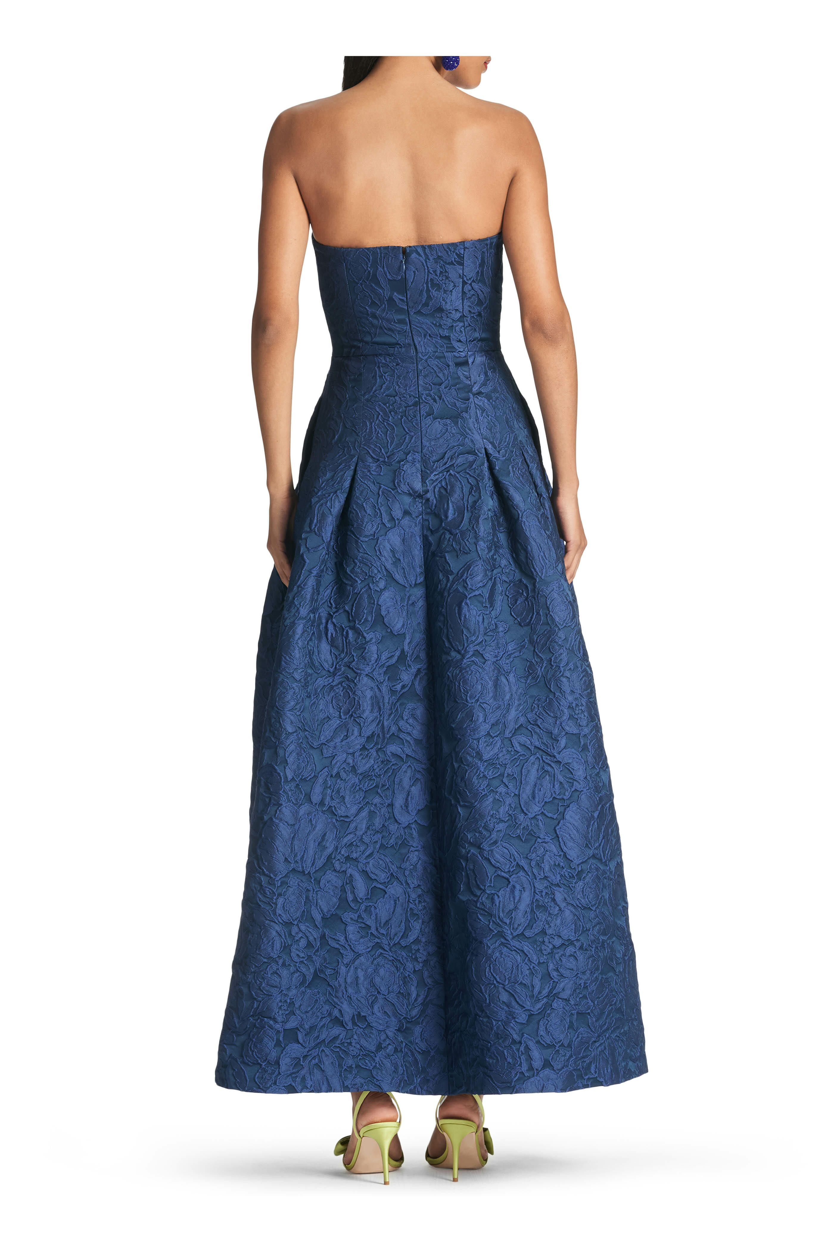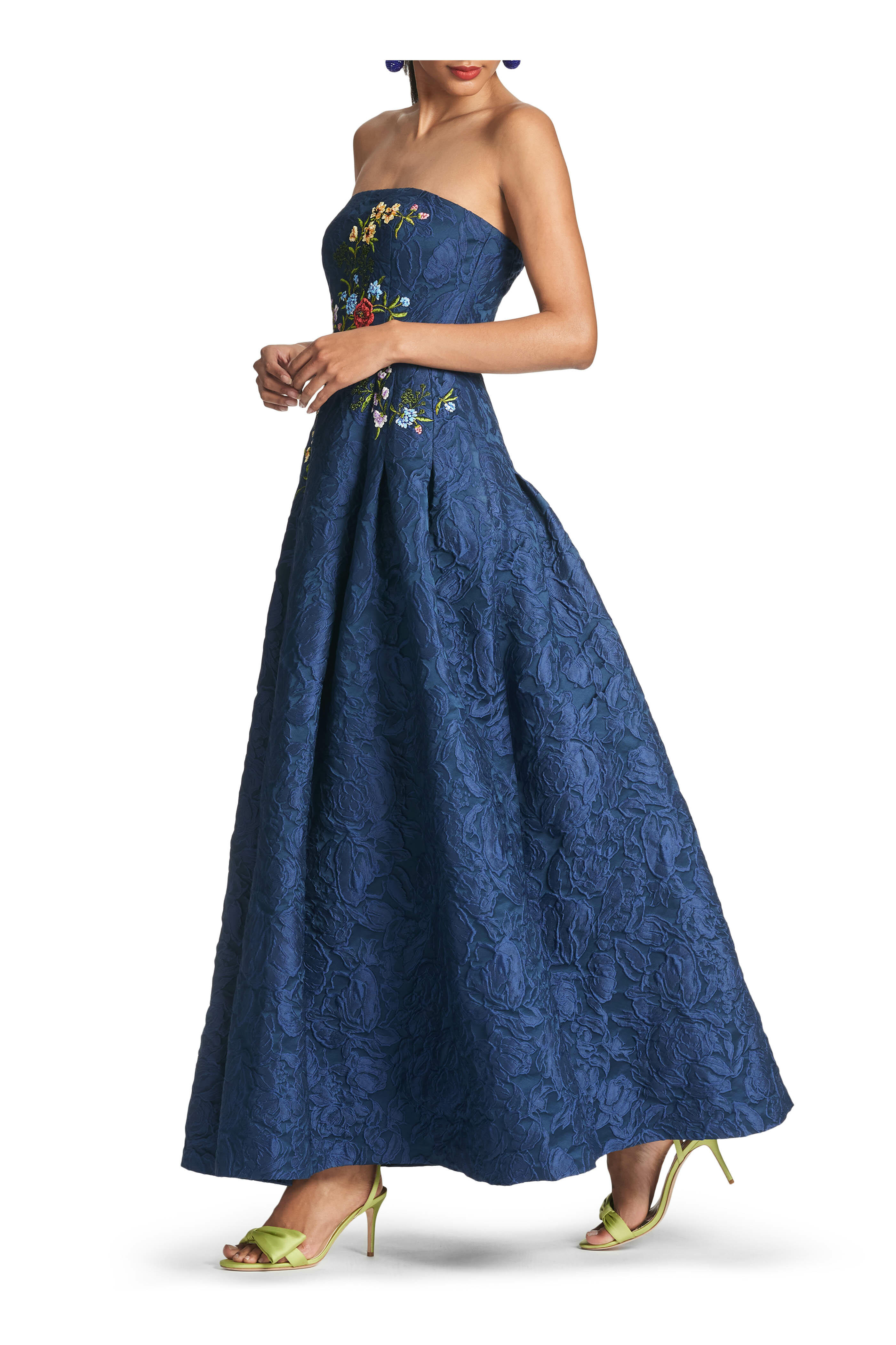 Strapless neckline. Concealed back zip. Side seam pockets. Imported. 49" topline to hem. 94% polyester, 6% nylon. Dry clean.