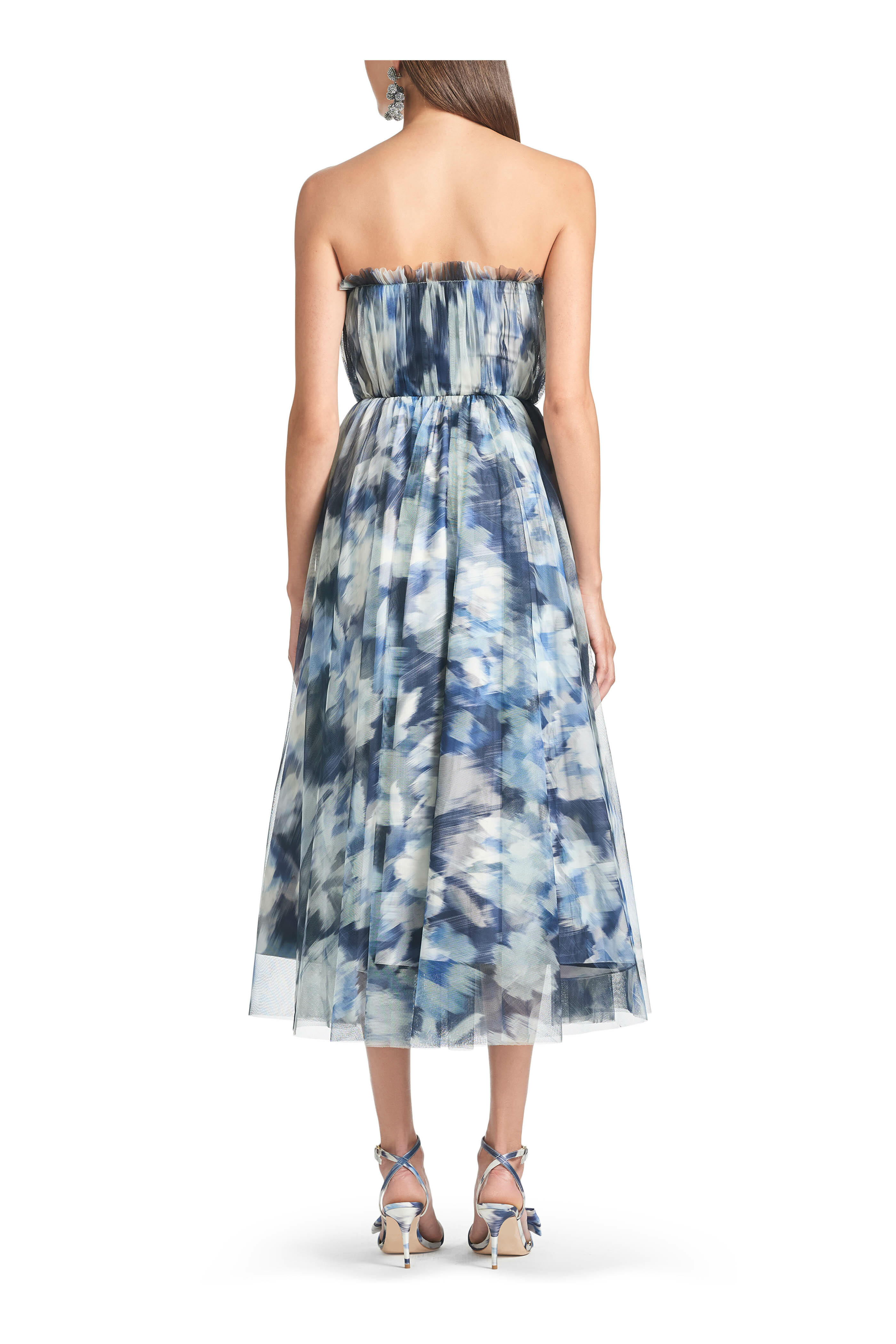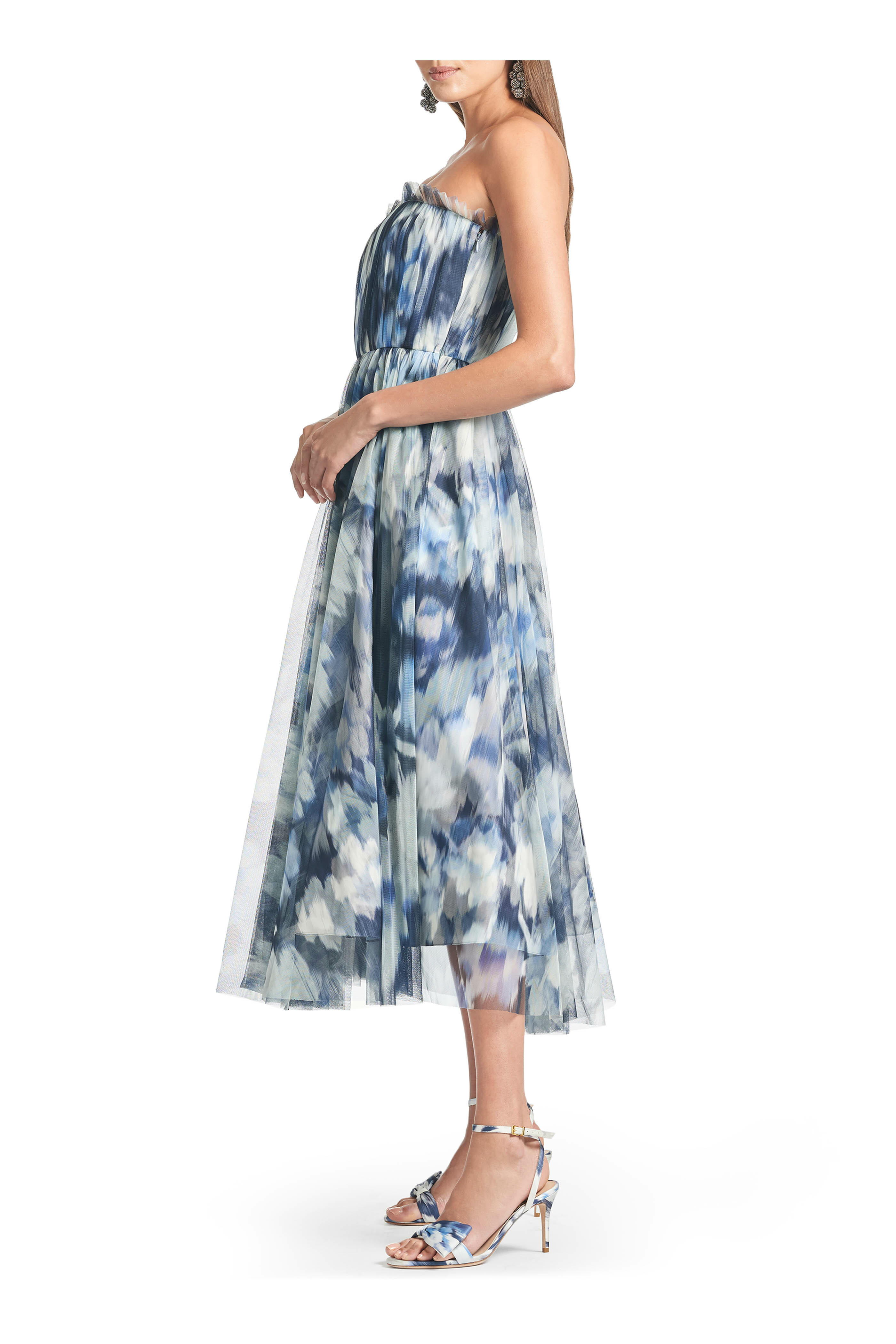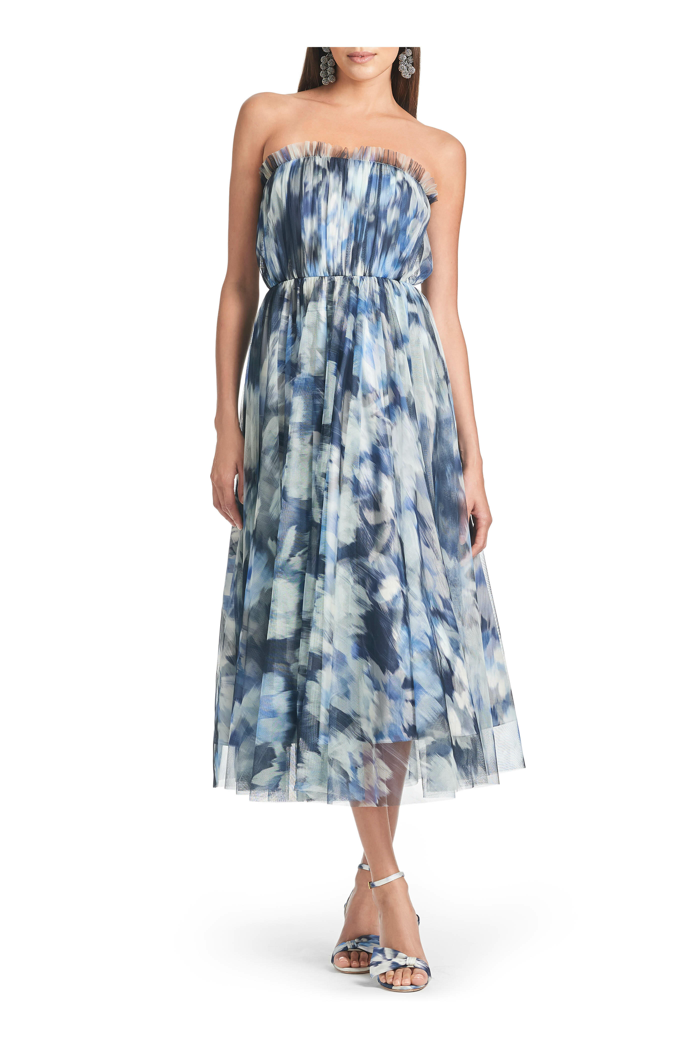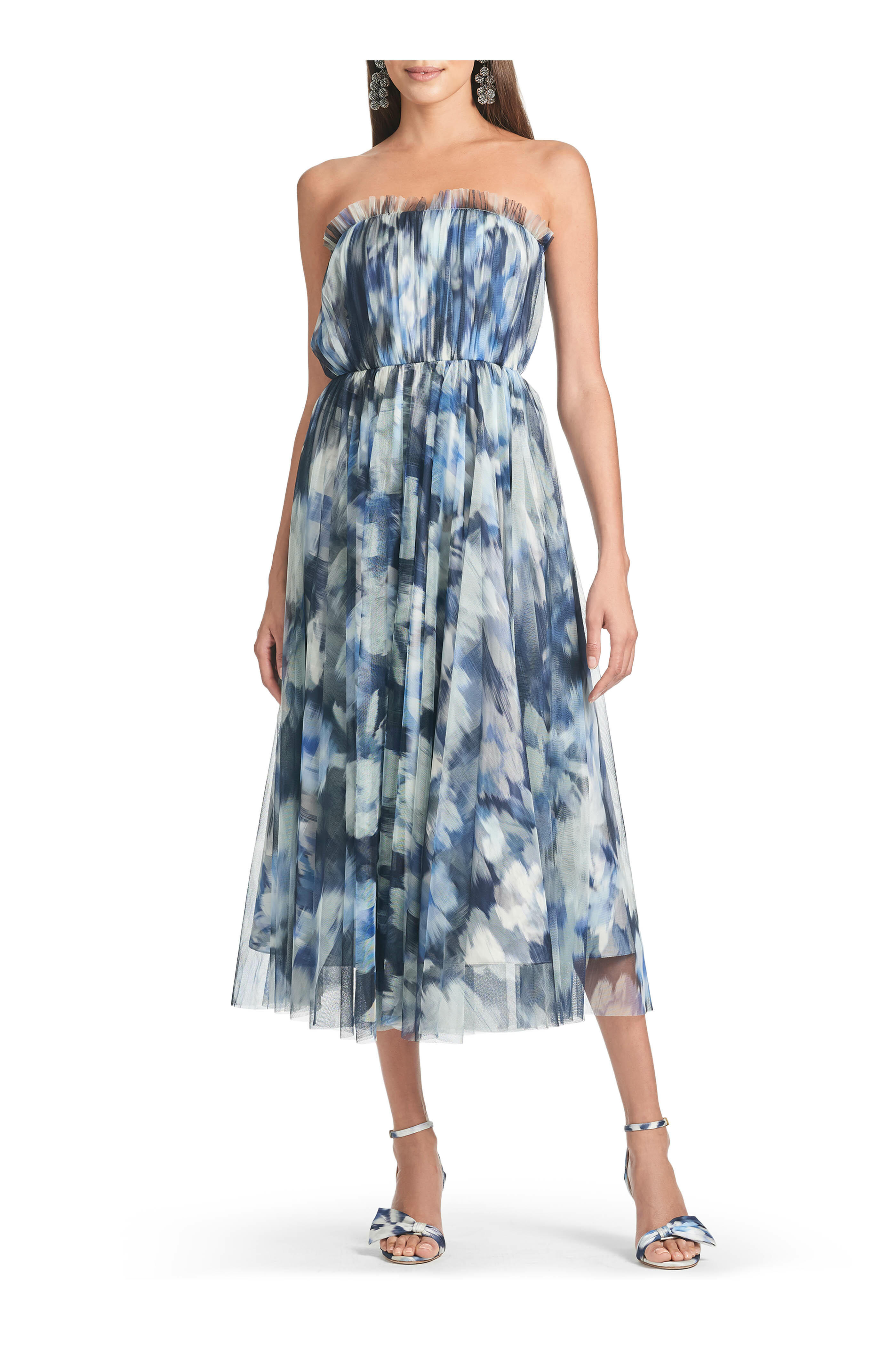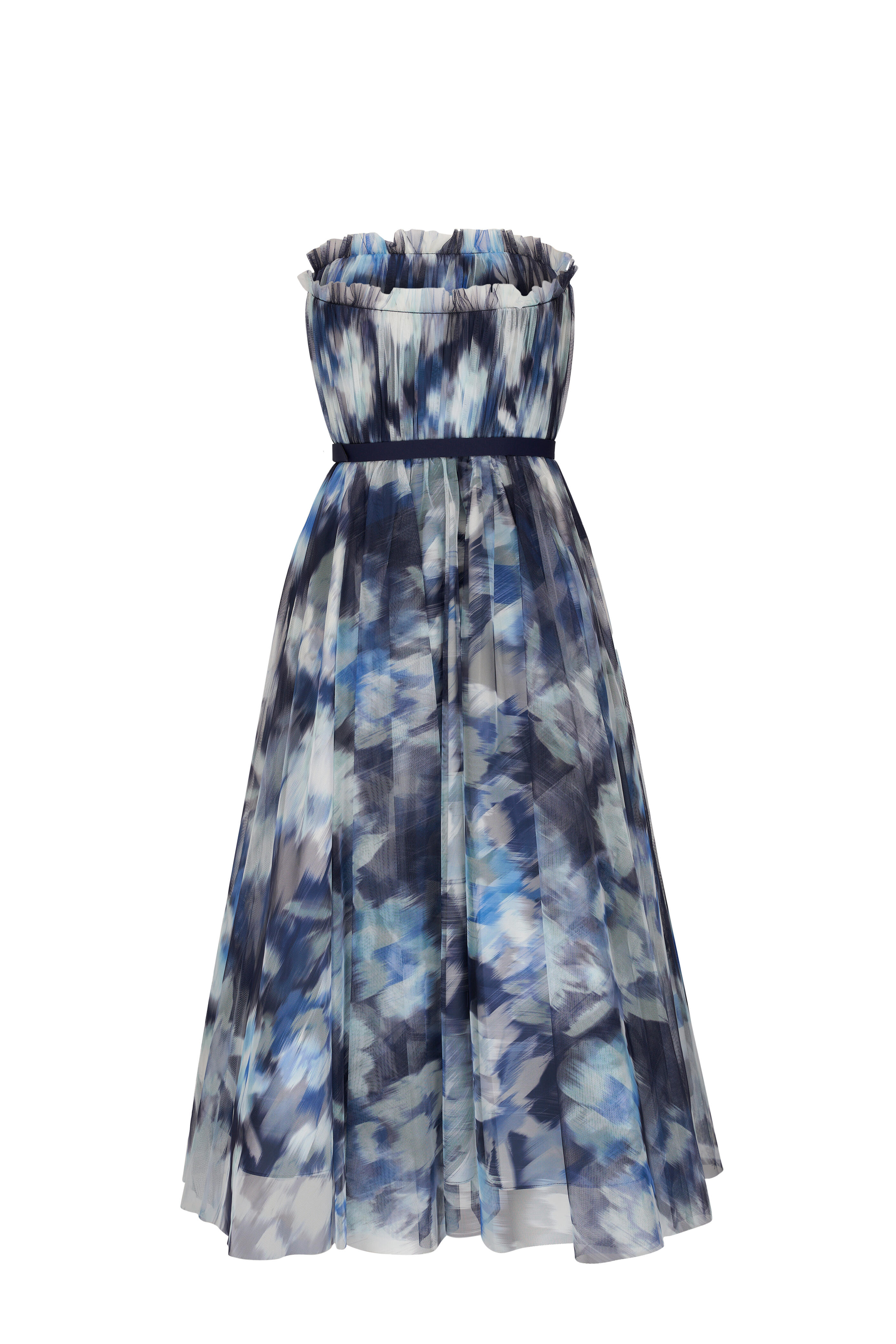 Strapless neckline. Concealed side zip. Removeable navy blue belt. Imported. 42" top line to hem. A-line silhouette. 100% polyester; fully lined. Dry clean.