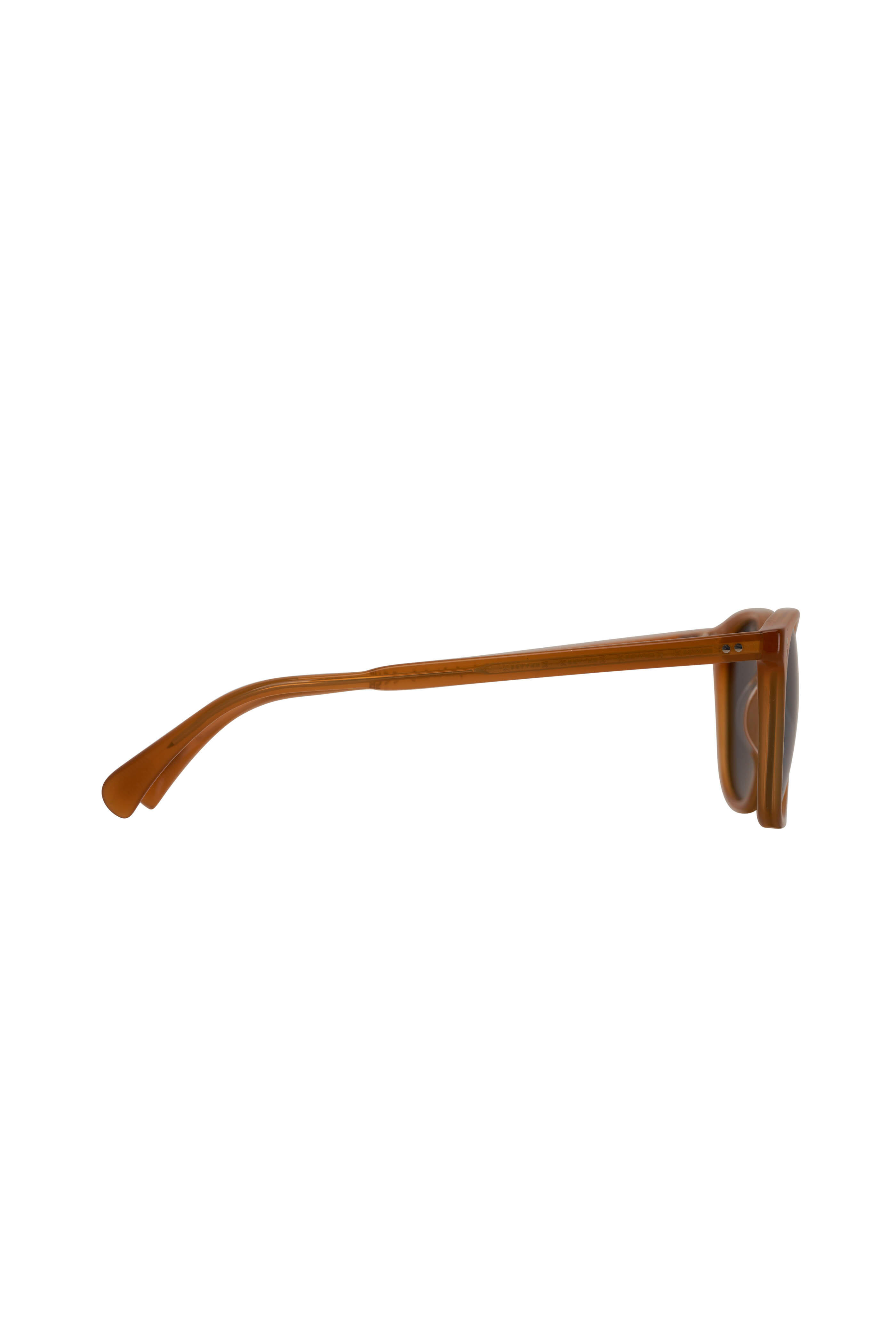 Frame material: acetate. Frame color: amber. Frame fit: high bridge. Lens type: glass. Lens color: regal blue. Made in Italy. 100% UV protection.