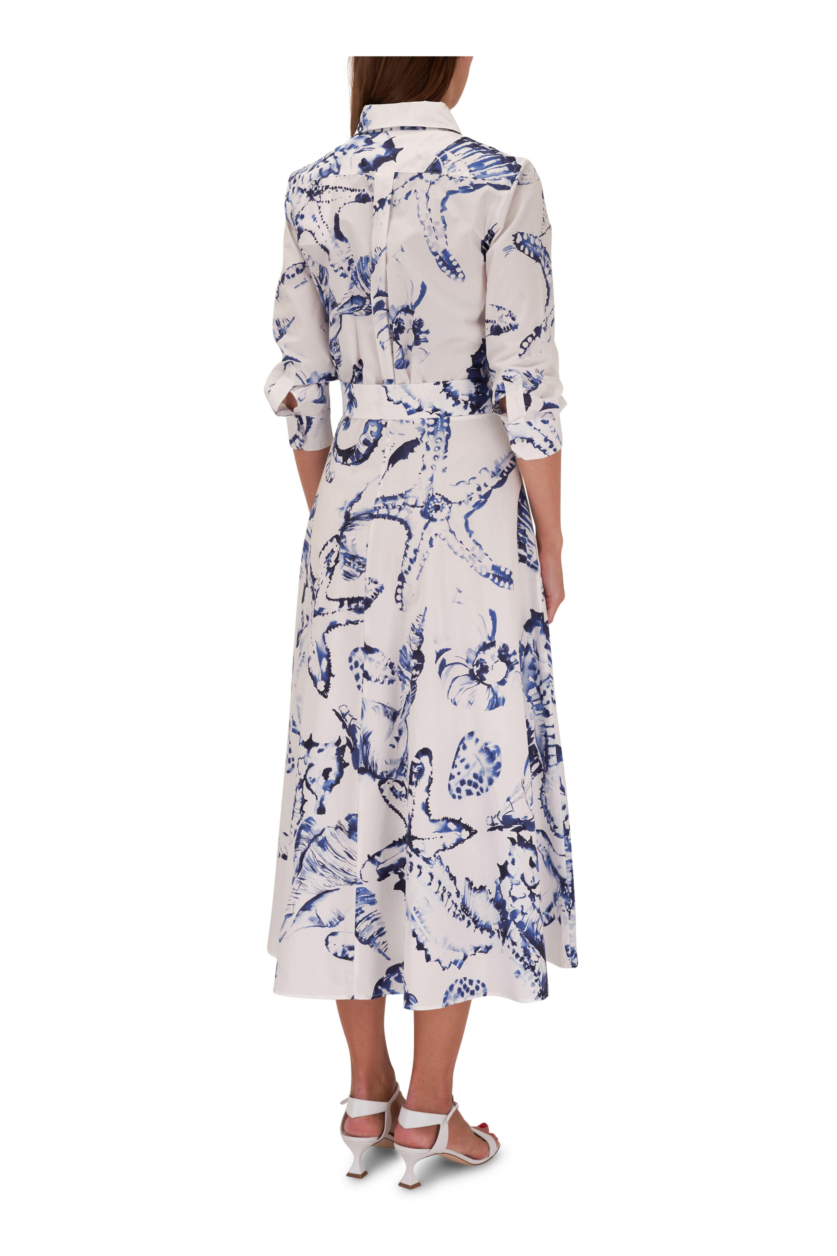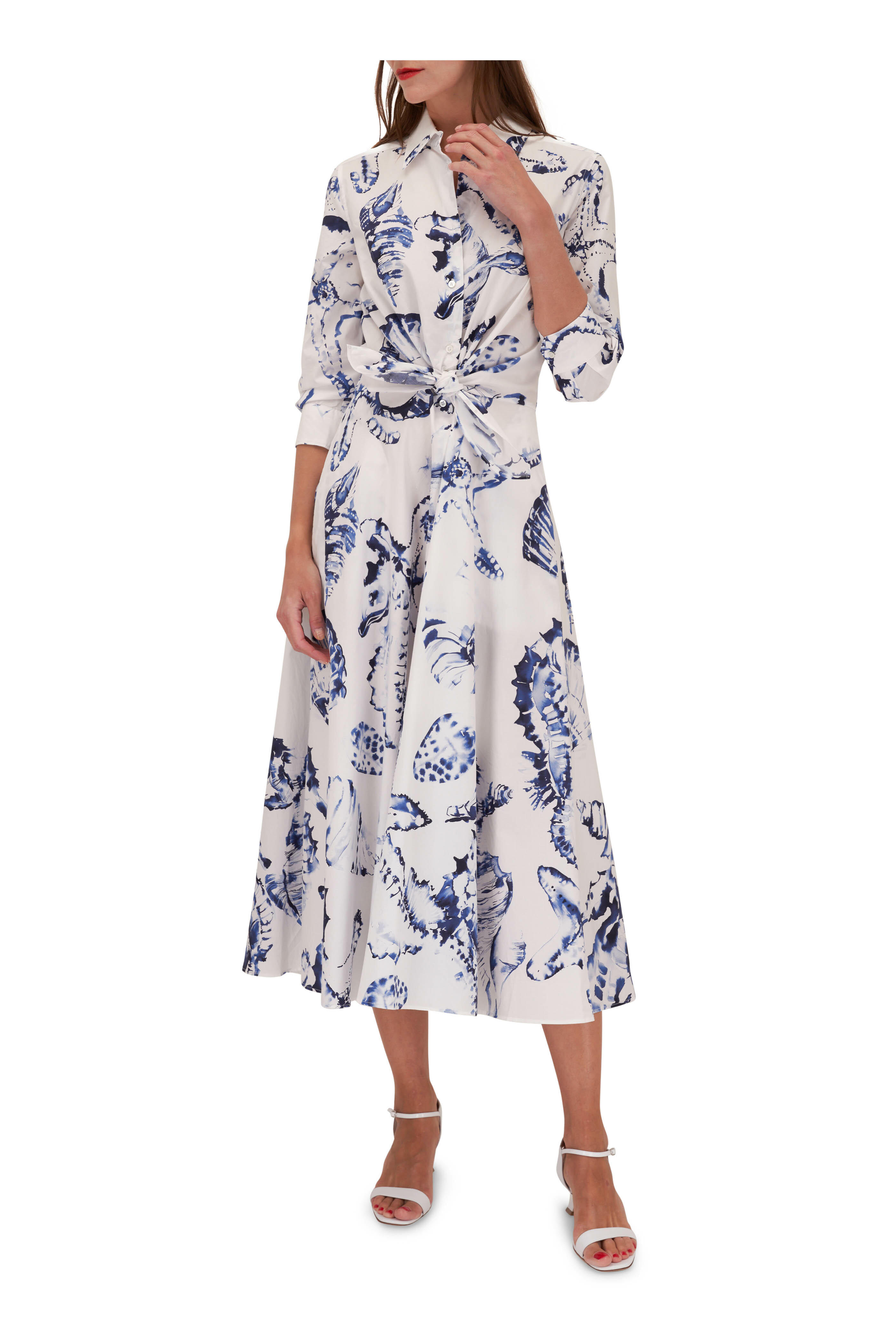 Spread collar. Front button placket. Self-tie waist. Three-quarter length sleeves. Single button cuffs. On-seam pockets. Made in Italy. Approx. 51" shoulder to hem. 100% cotton. Hand wash.