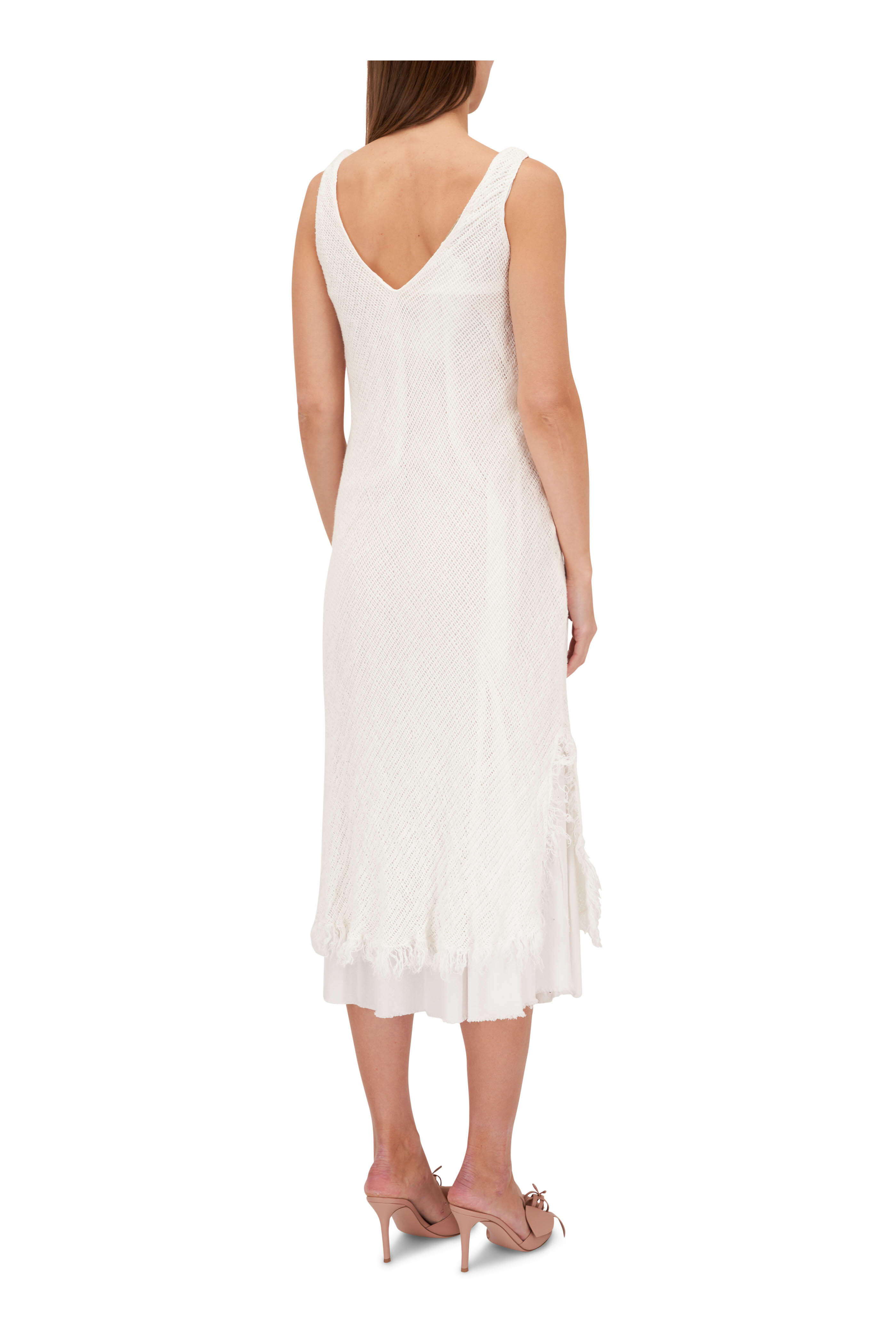 V-neckline. Slip-on style. Raw fringe hem. Made in Italy. Approx. 49" shoulder to hem. 100% linen; Lining: 100% cotton. Dry clean.