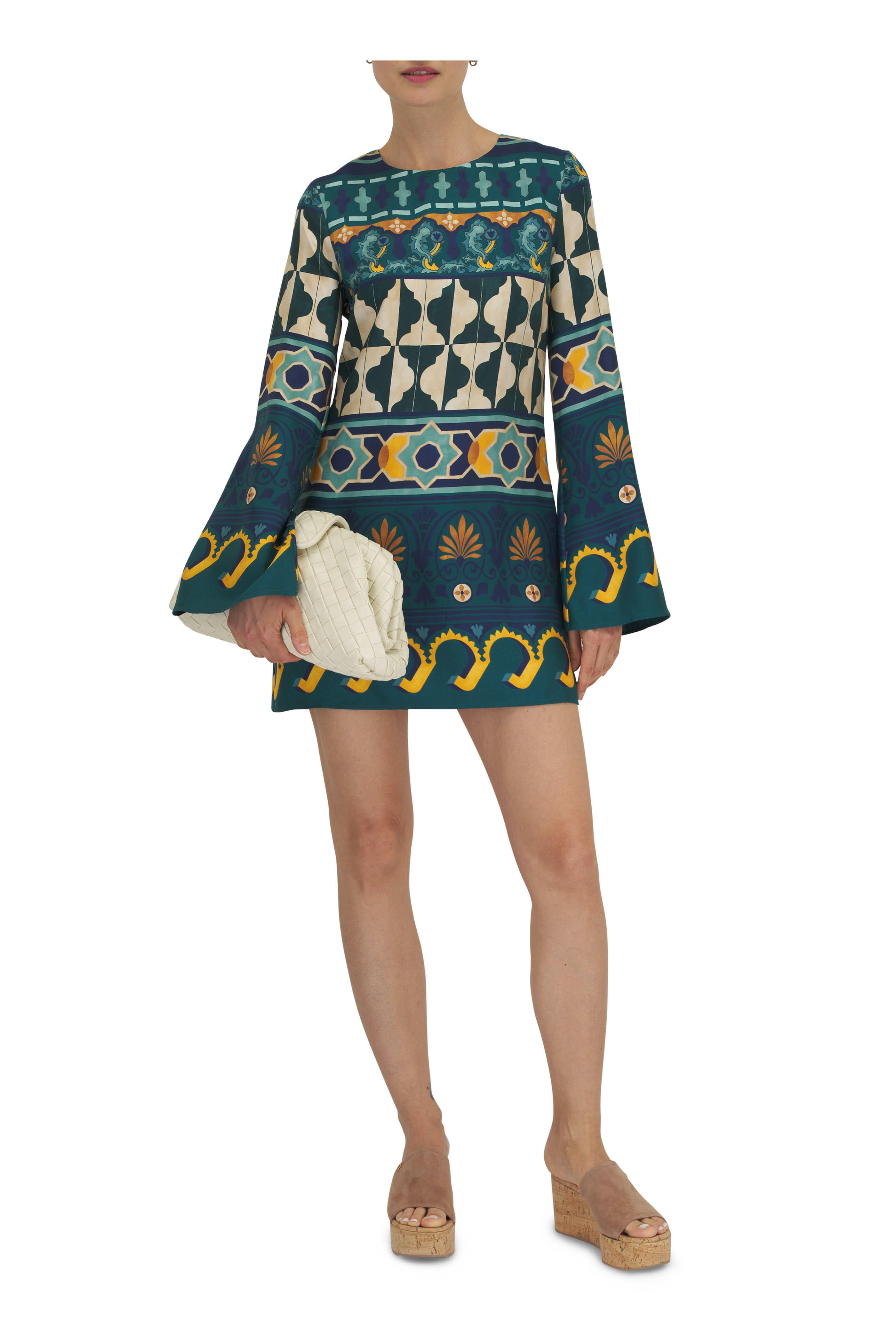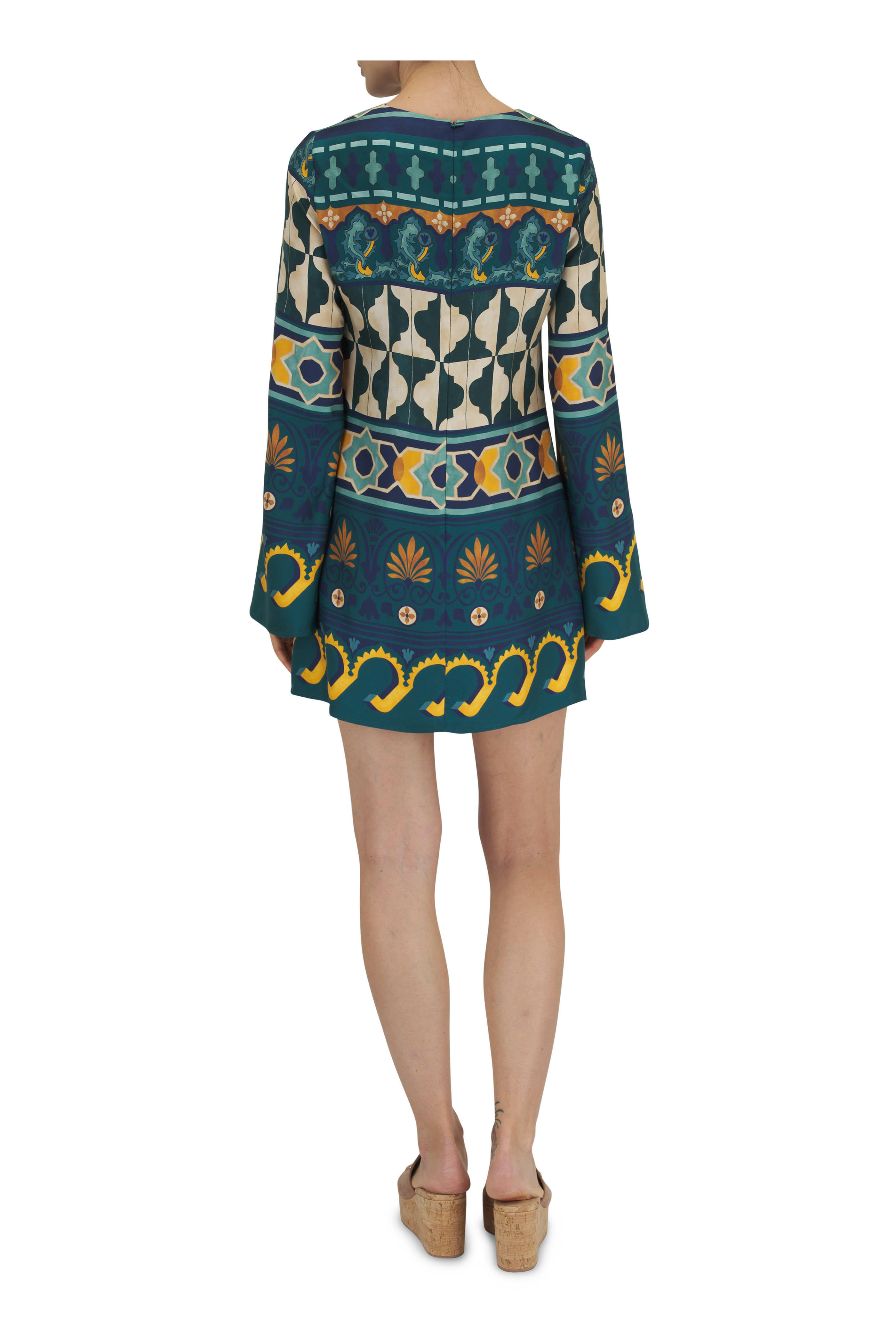 Round neckline. Concealed back zip with clasp closure. Long bell sleeves. Made in Italy. Approx. 32 ½" shoulder to hem. 100% silk. Dry clean.