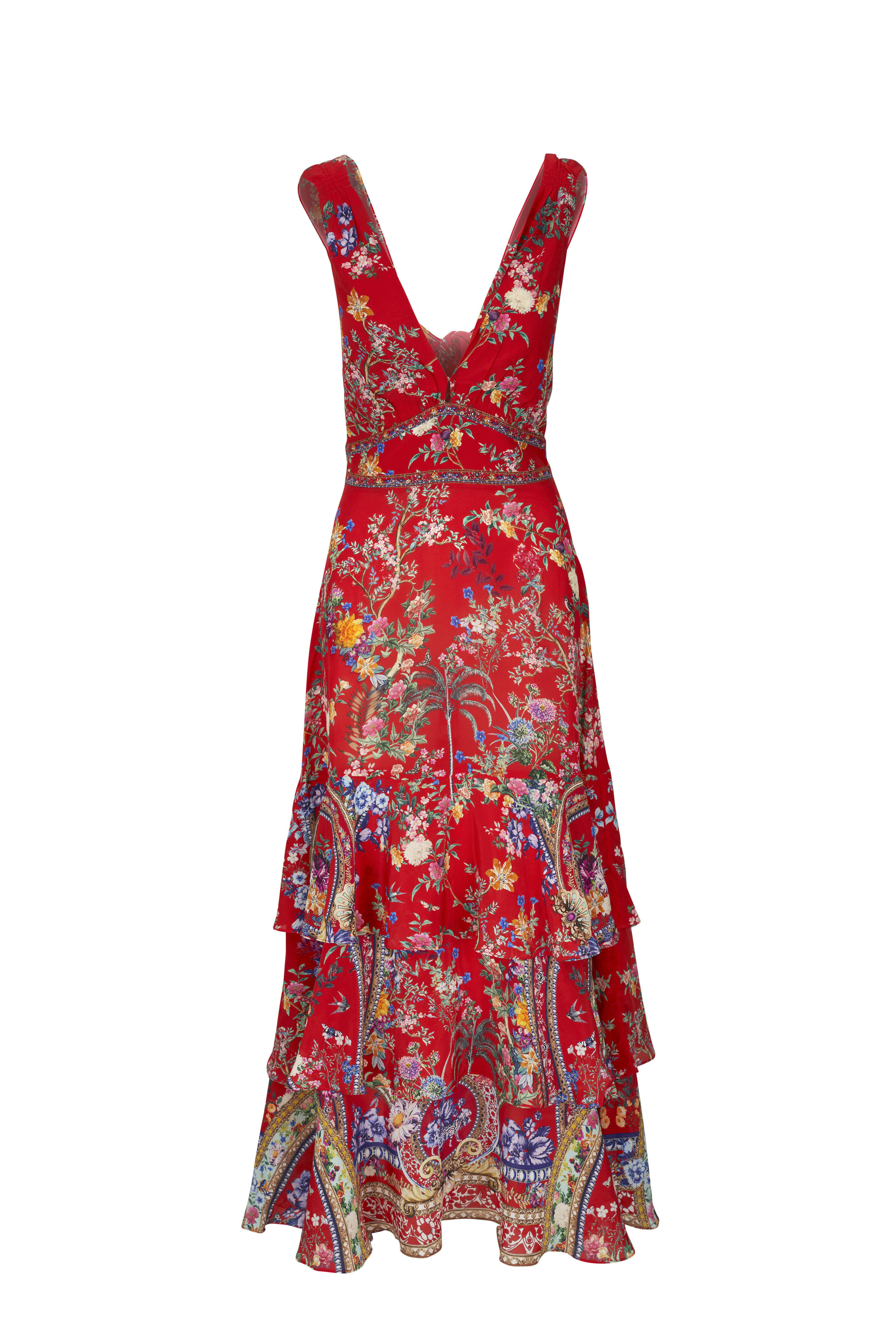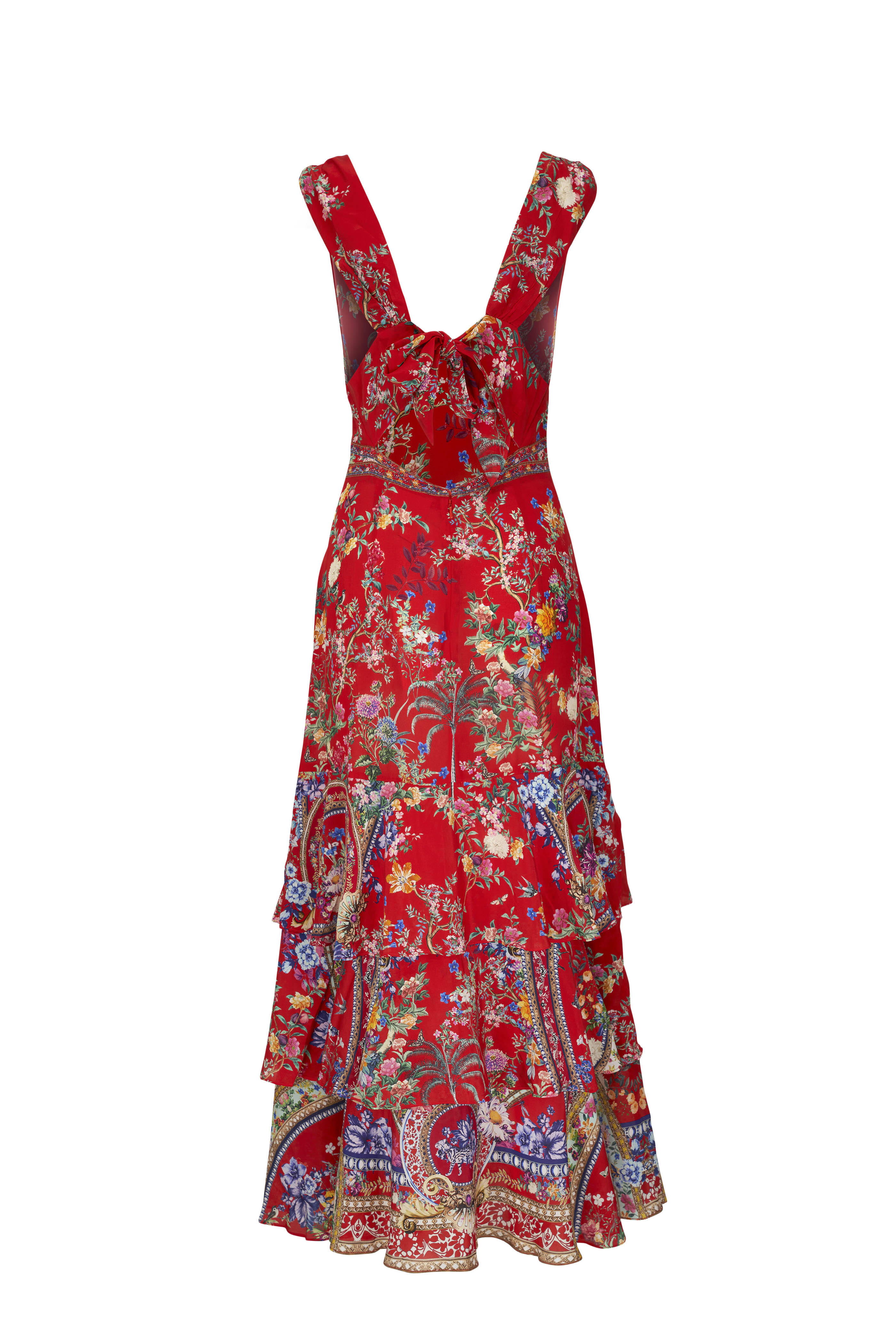 V-neckline. Self-tie back. Tiered skirt. Imported. Shoulder to hem 57". Falls just above the ankle.. 100% silk. Dry clean.
