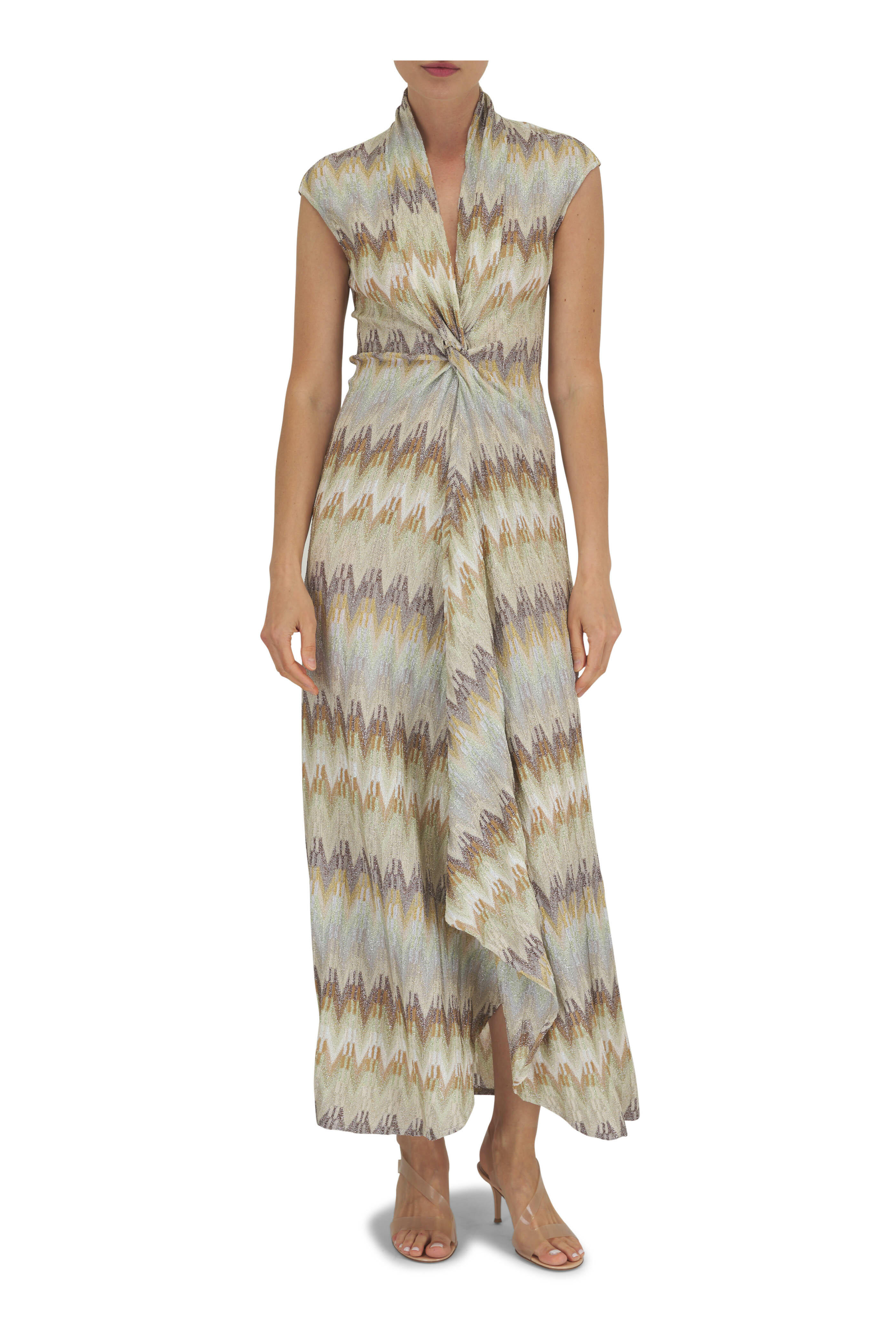 V-neckline. Knot detailing. Drape detailing. Straight hem. Imported. Shoulder to hem 57". 80% viscose, 20% metallic. Dry clean.