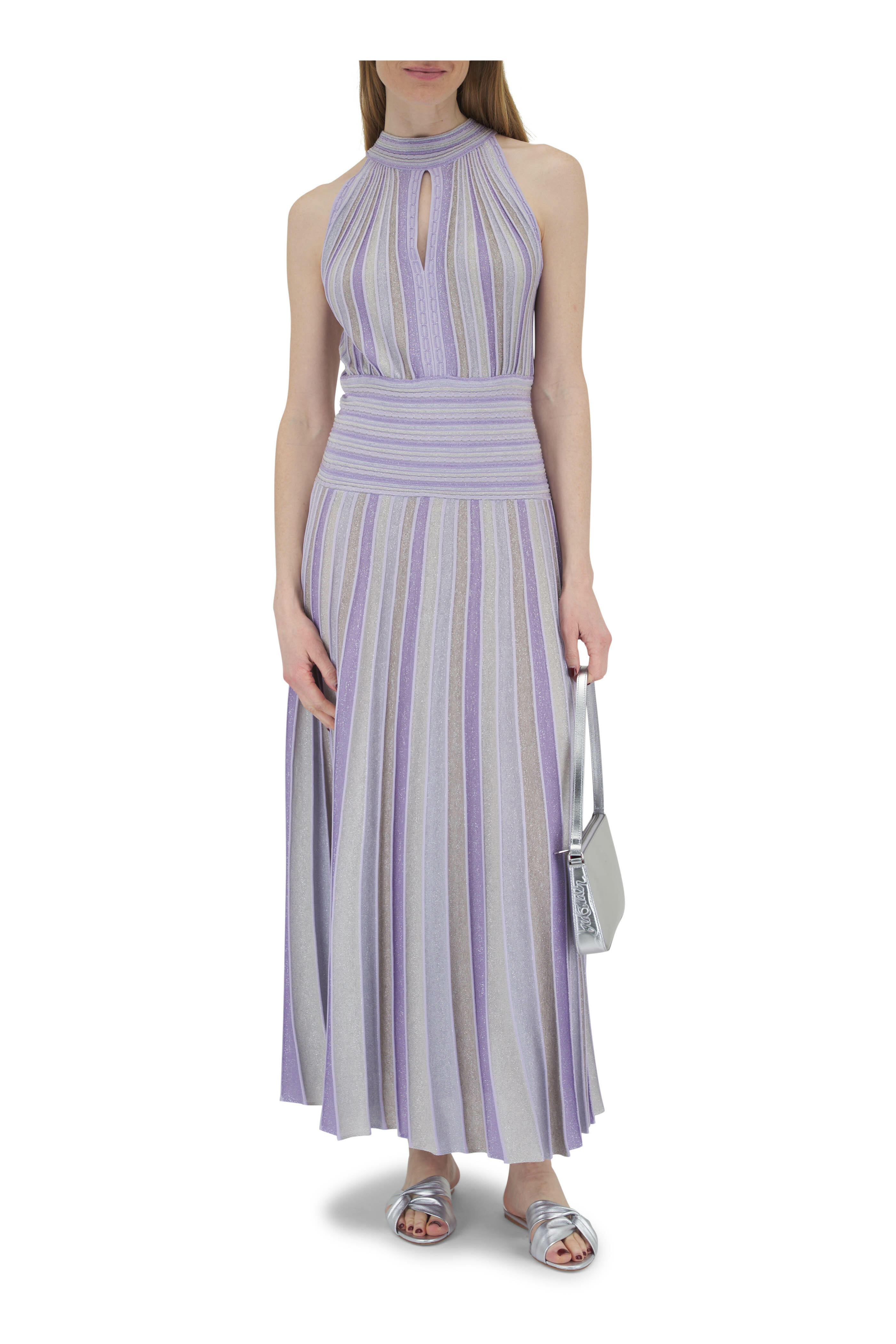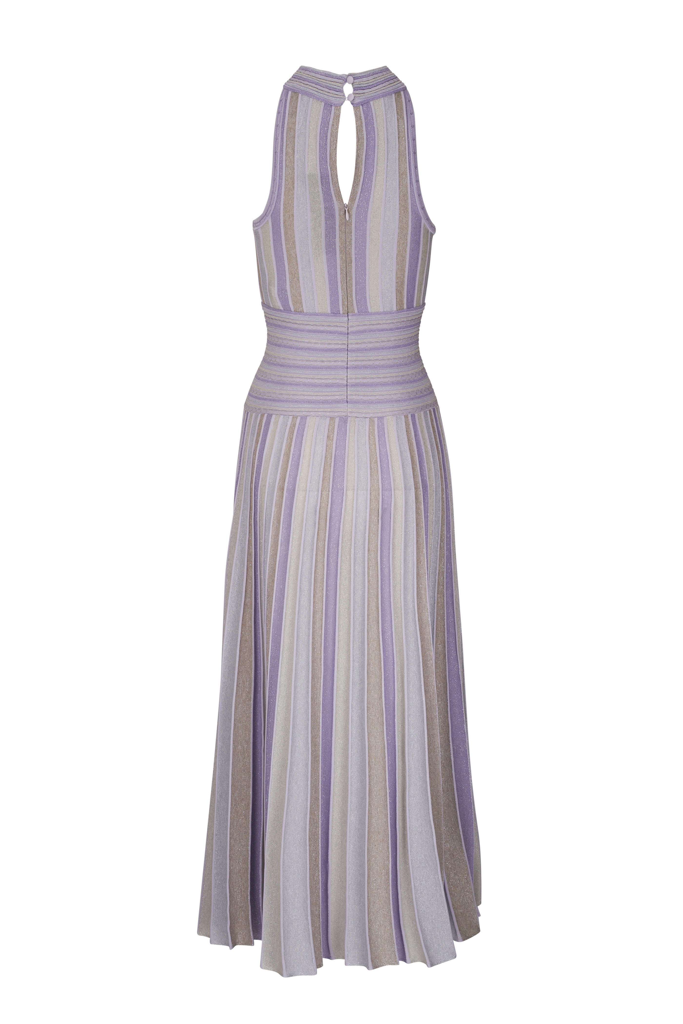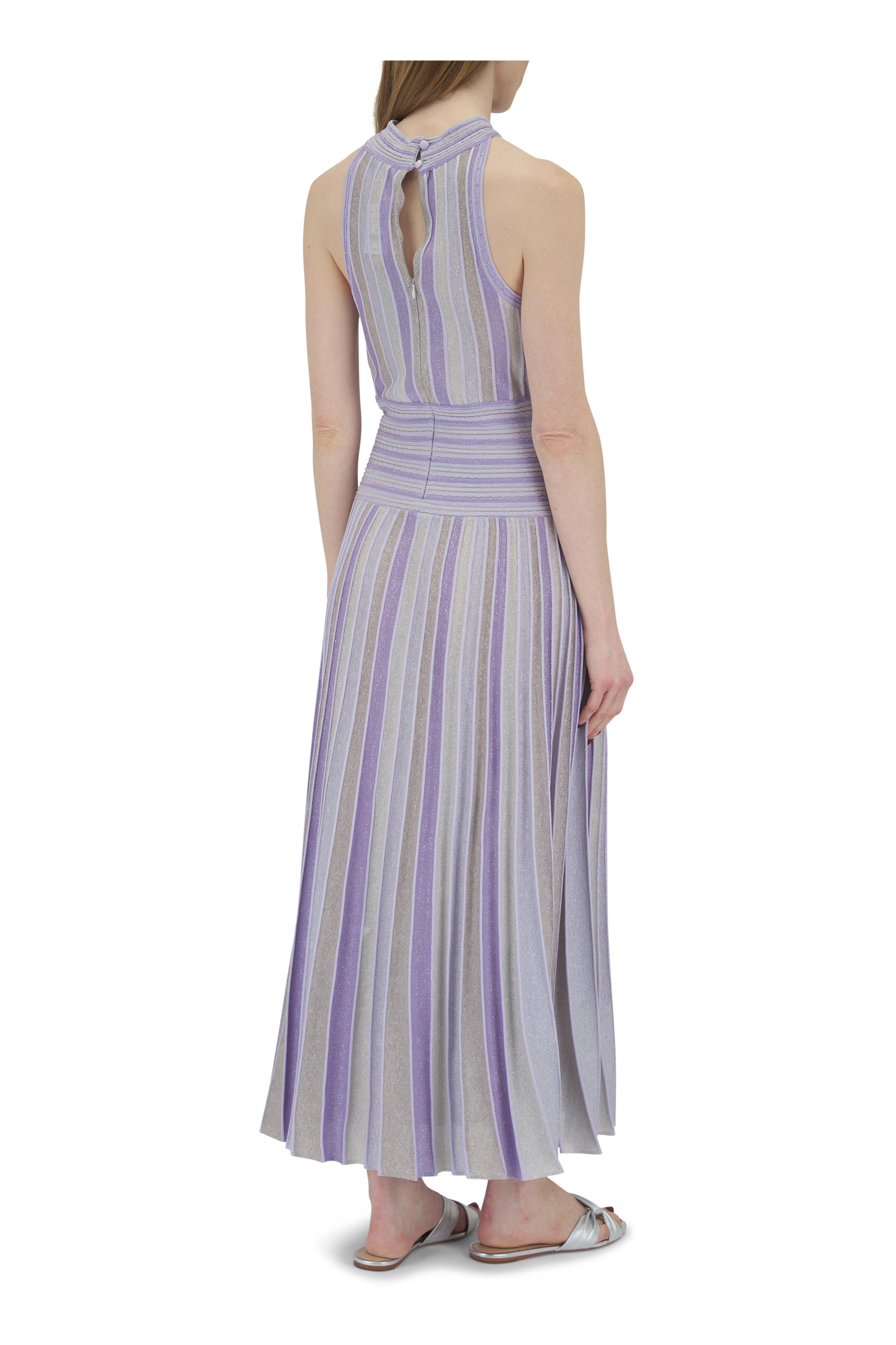 Round, cut-out neckline. Two button keyhole closure; lower concealed back zip. Wide banded waist. Pleated, striped skirt. Imported. 57" shoulder to hem. 72% viscose, 22% polyester, 6% polyamide. Dry clean.