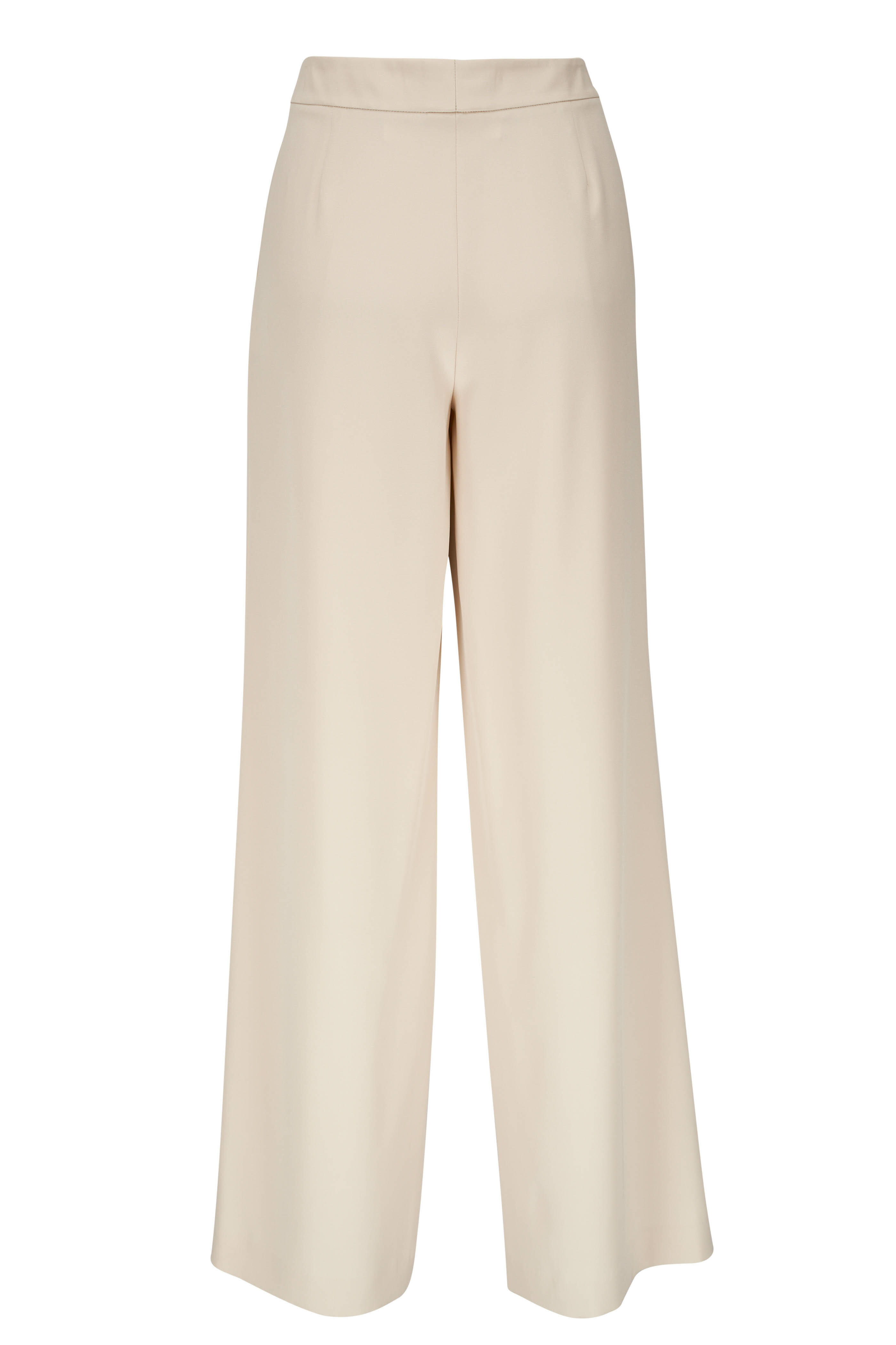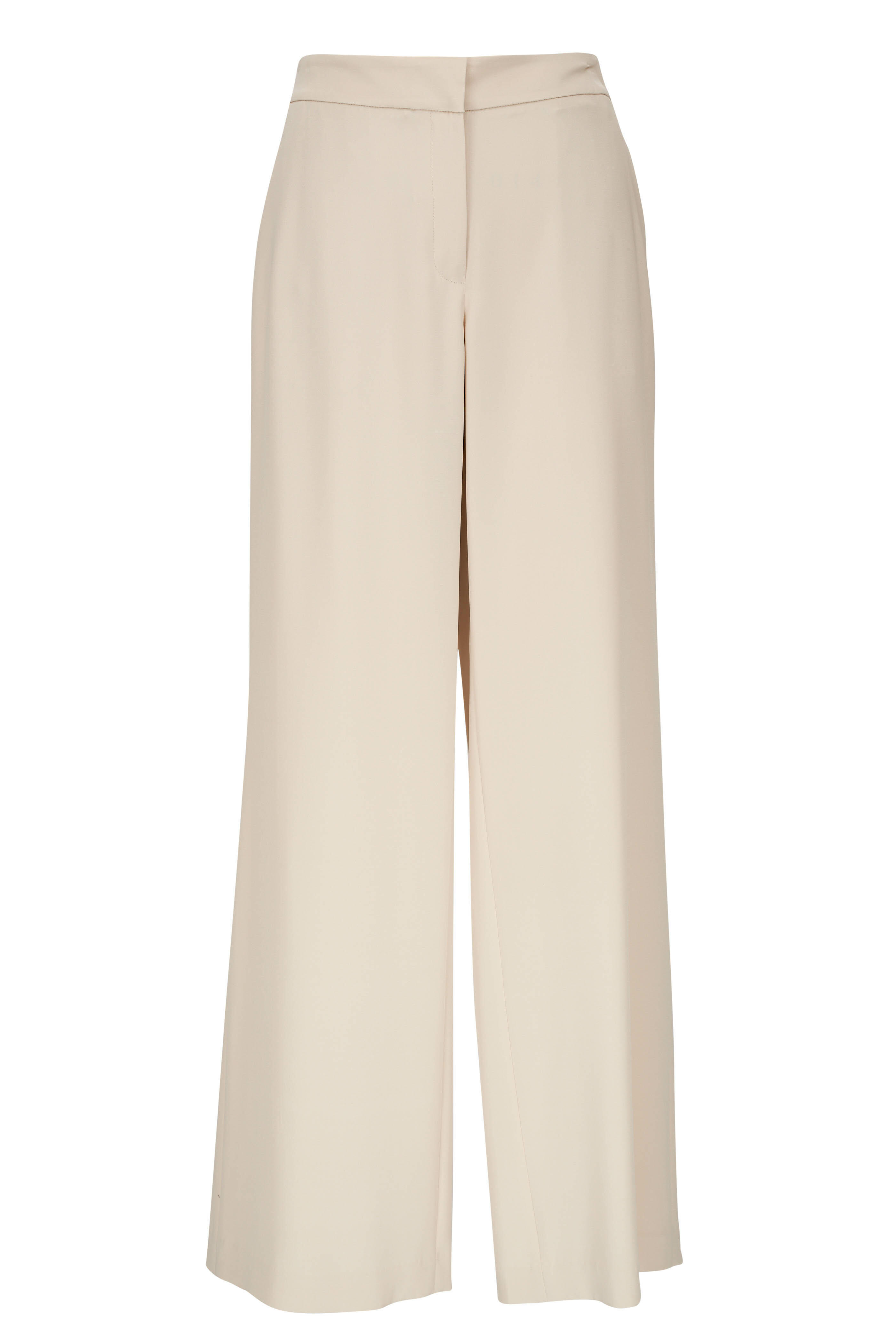 Zip fly; button closure. Banded waist. Side slip pockets. Imported. Mid-rise. 94% silk, 6% elastane. Dry clean.