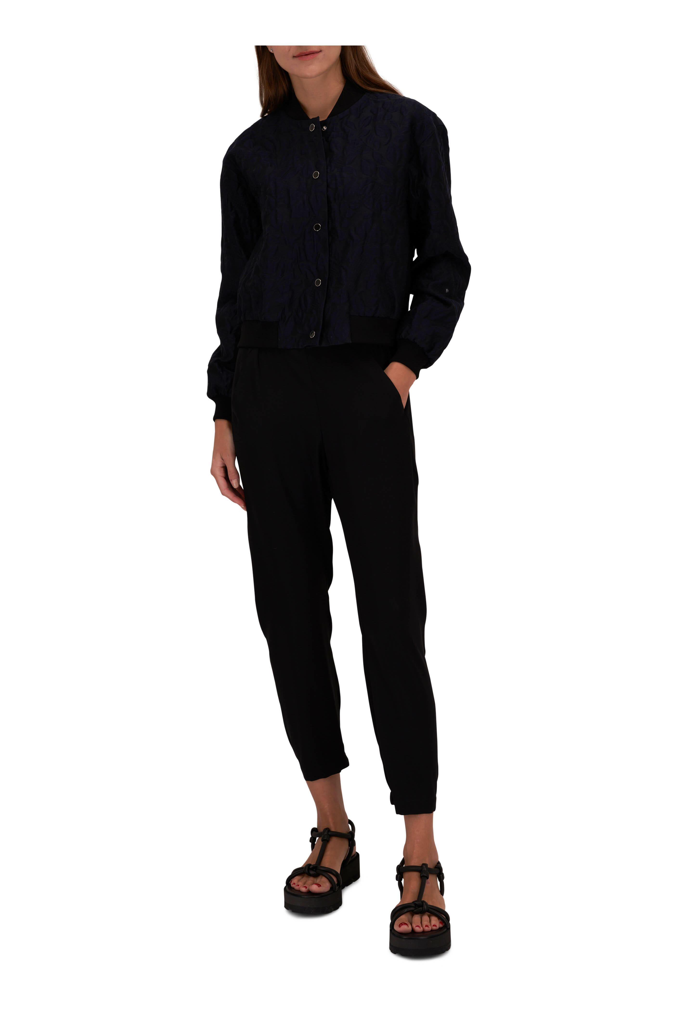 Elasticized waistband. Slip on style. Side seam pockets. Tapered, elasticized hem. Made in the USA. Rise: 11". Inseam: 27". 95% silk, 5% elastane. Dry clean.