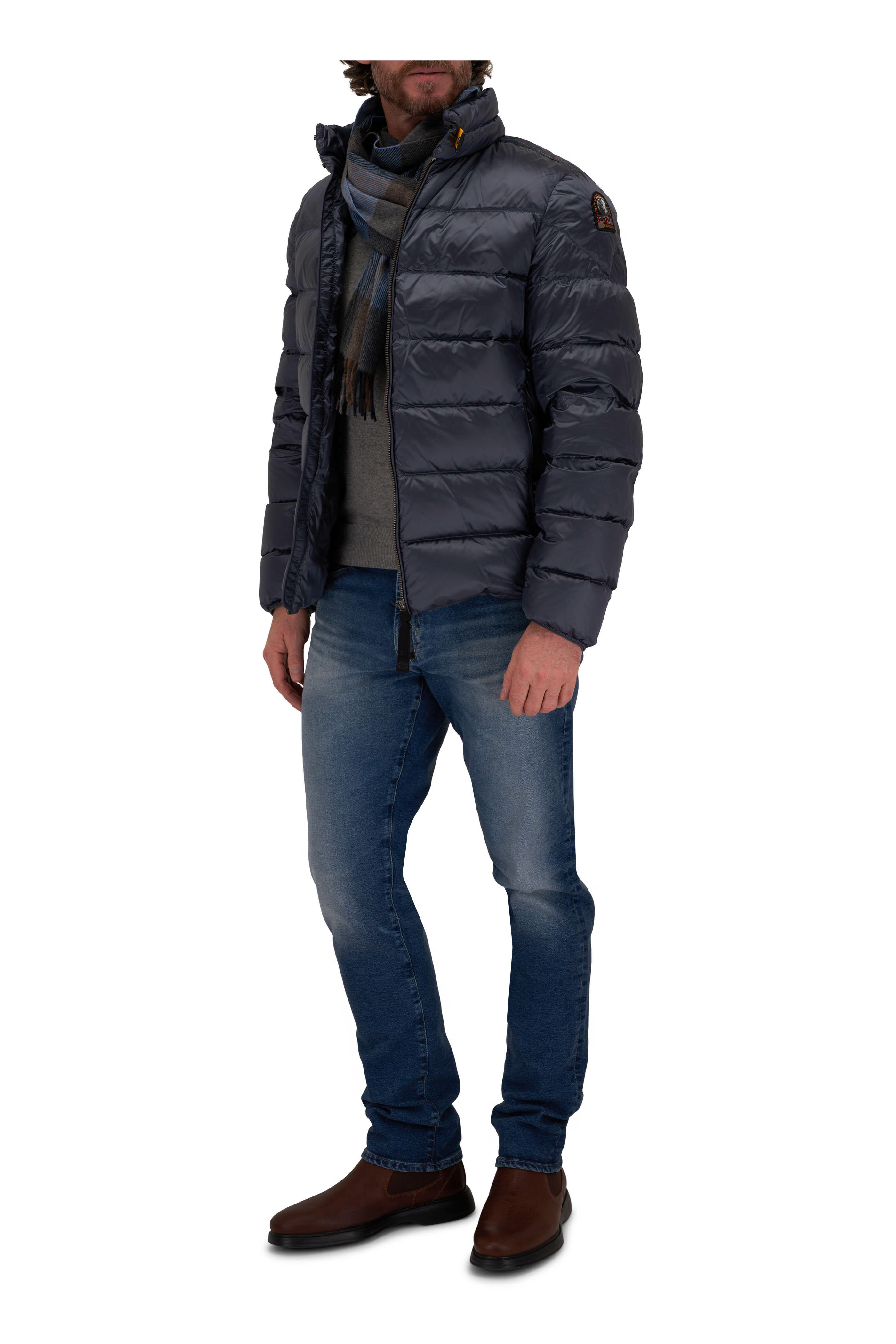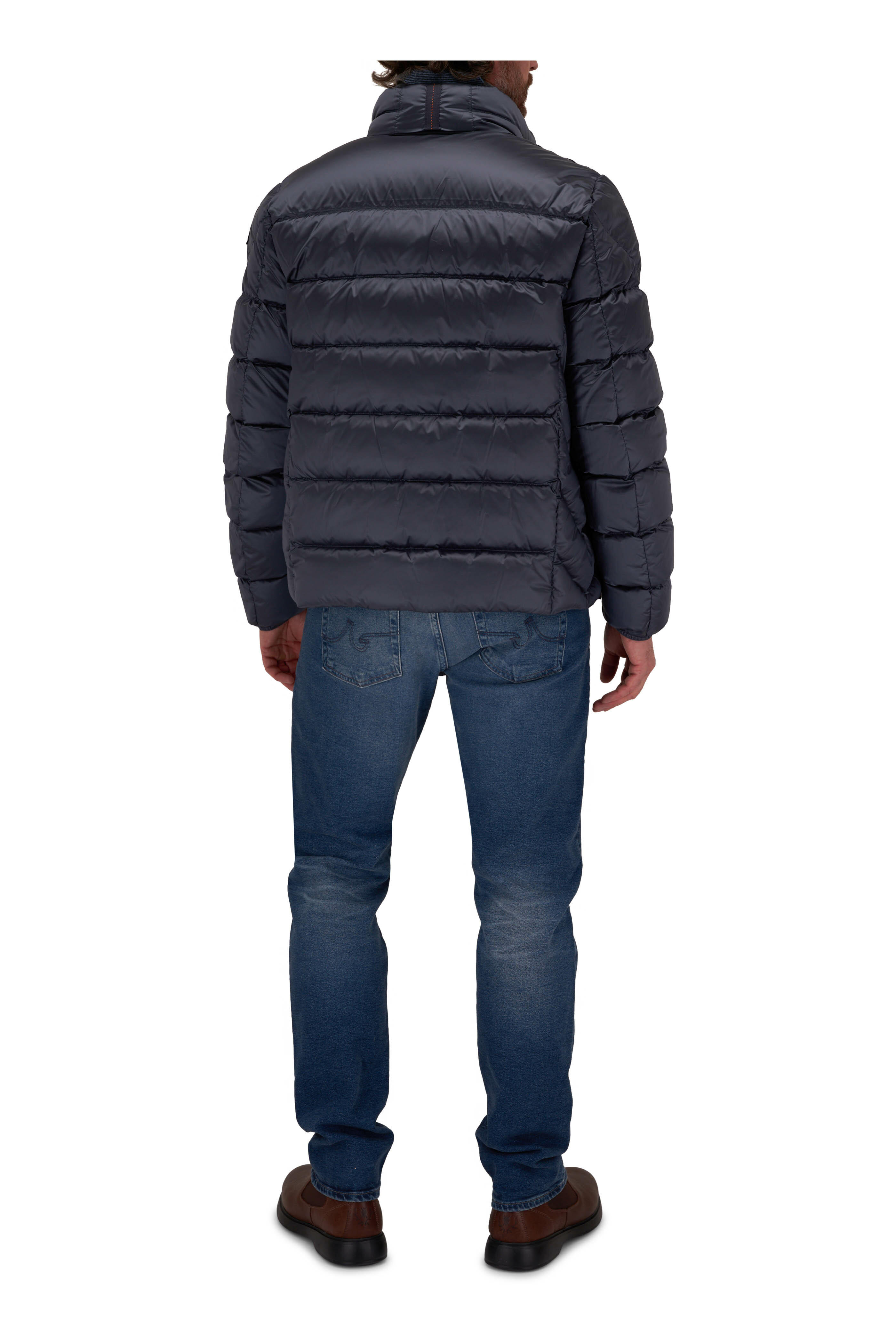Stand collar; ribbed trim; neck button tab. Two-way front zip. Lower zip welt pockets; interior slip pockets. Logo patch on shoulder. Elasticized cuffs. Imported. 60% polyester, 40% polyamide; lining: 100% polyamide; fill: 100% duck down. Machine wash.