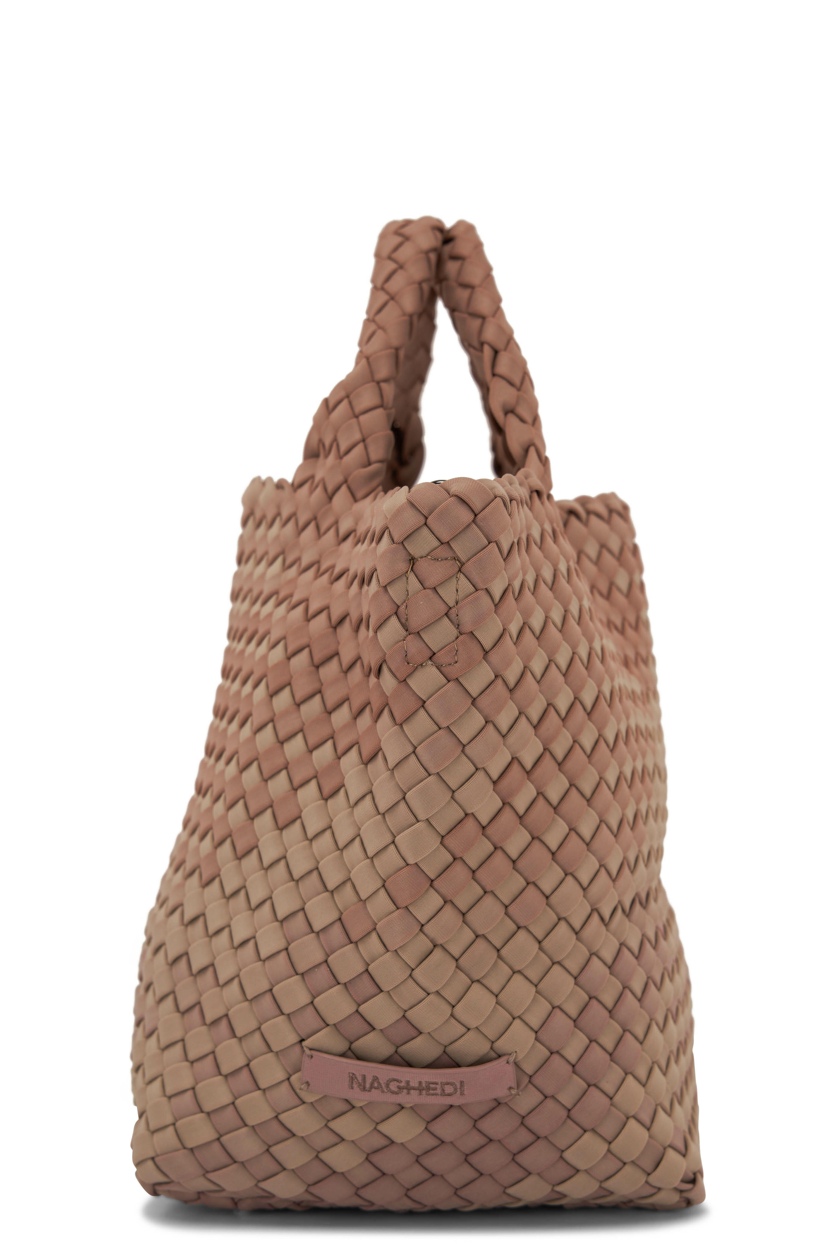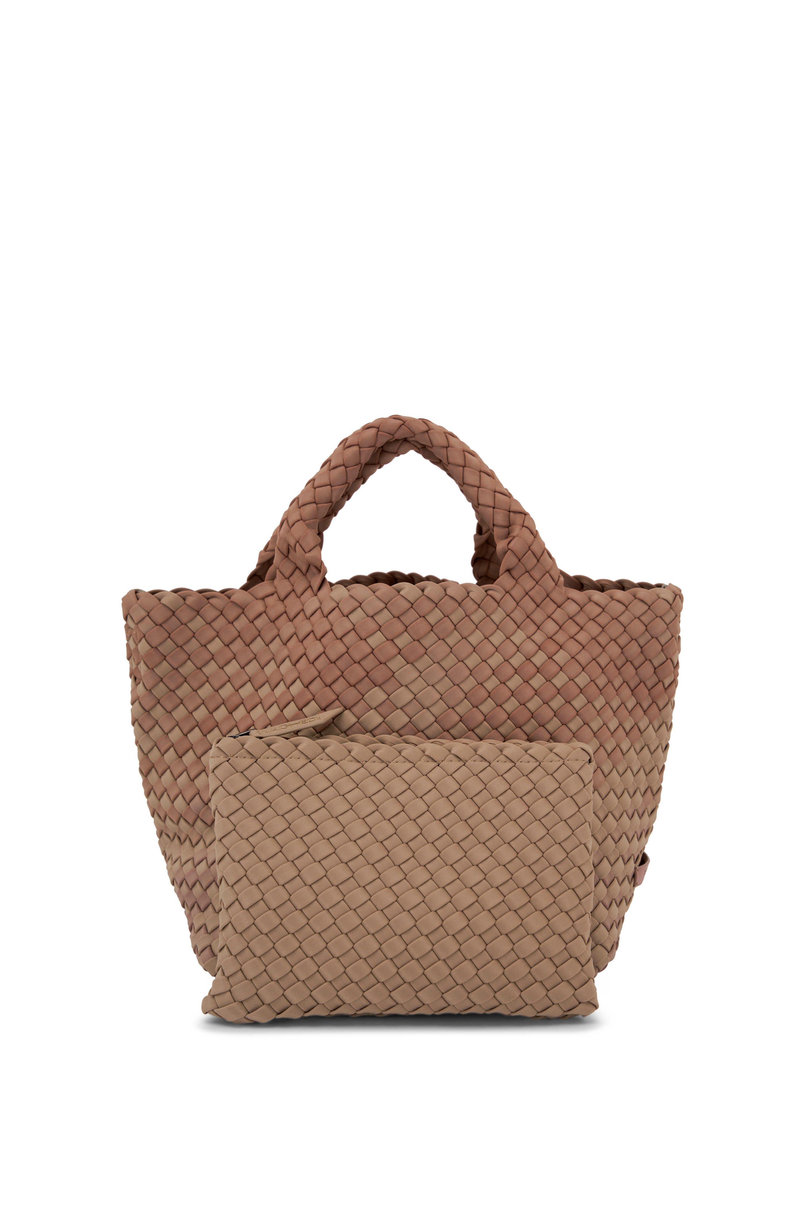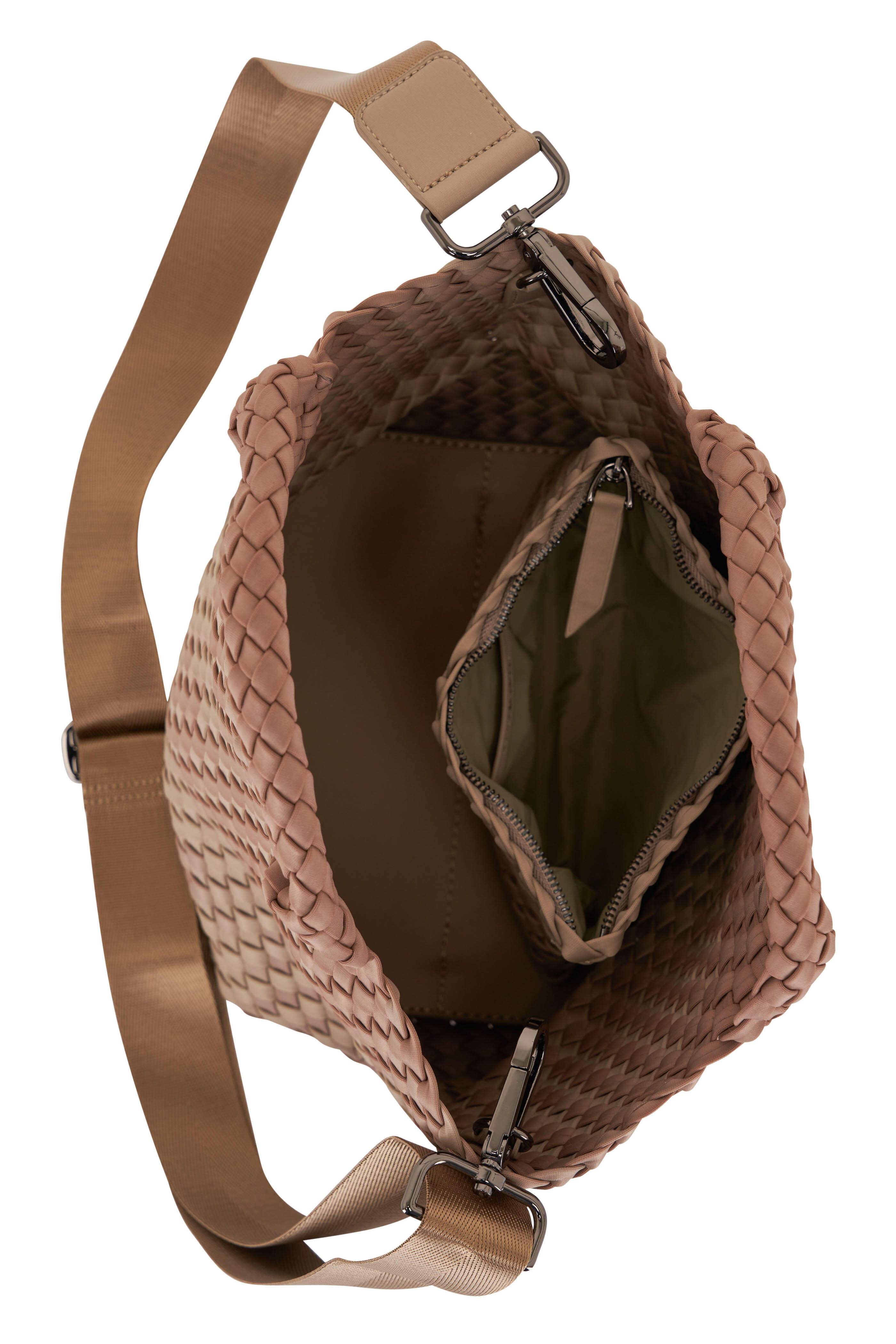 Neoprene. Dual top handle. Detachable, adjustable shoulder strap. Open top. Removable zip pouch. Unlined. Imported. Width: 13". Height: 8". Depth: 6 ½". Handle drop: 2 ½". Strap drop: 14-25".