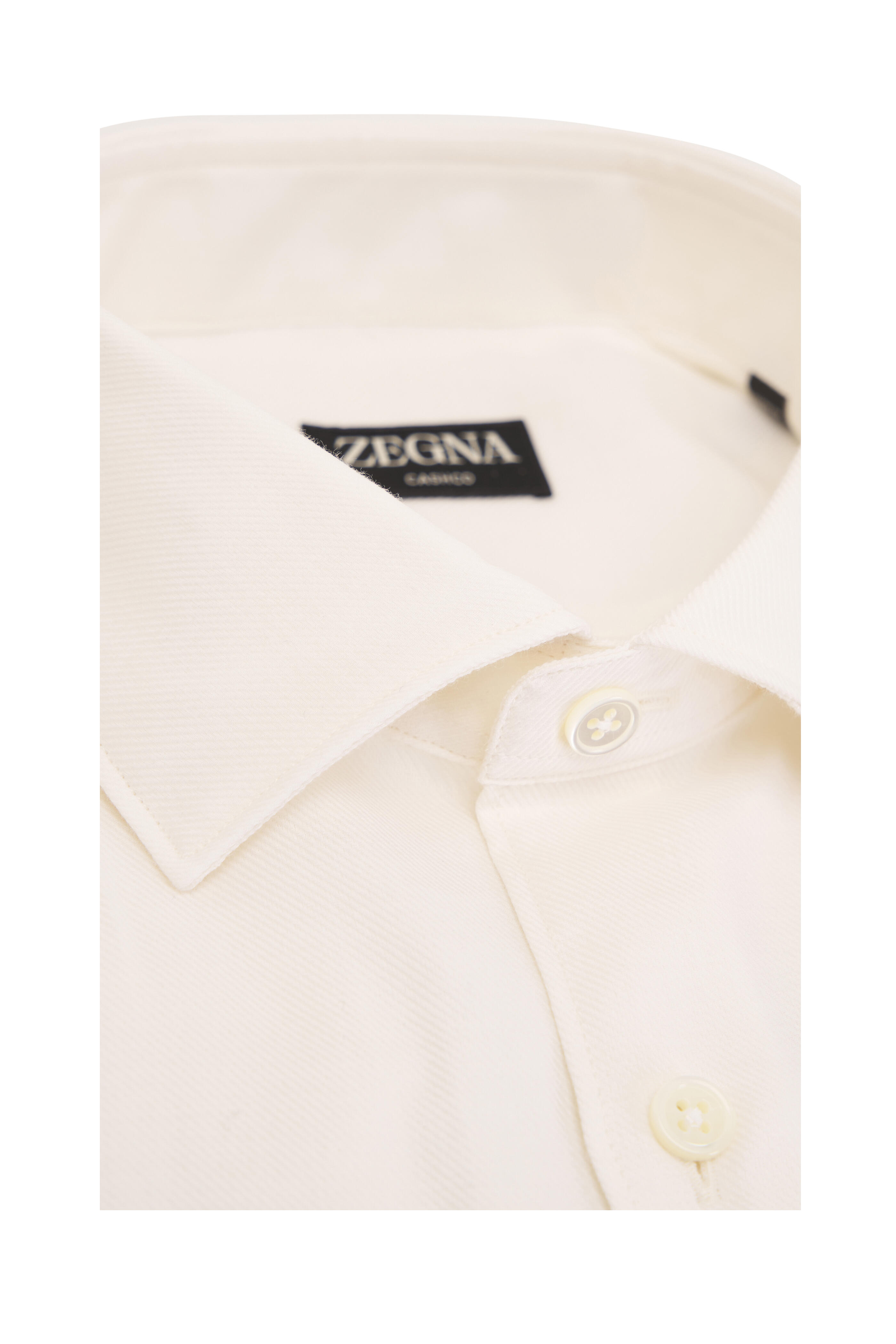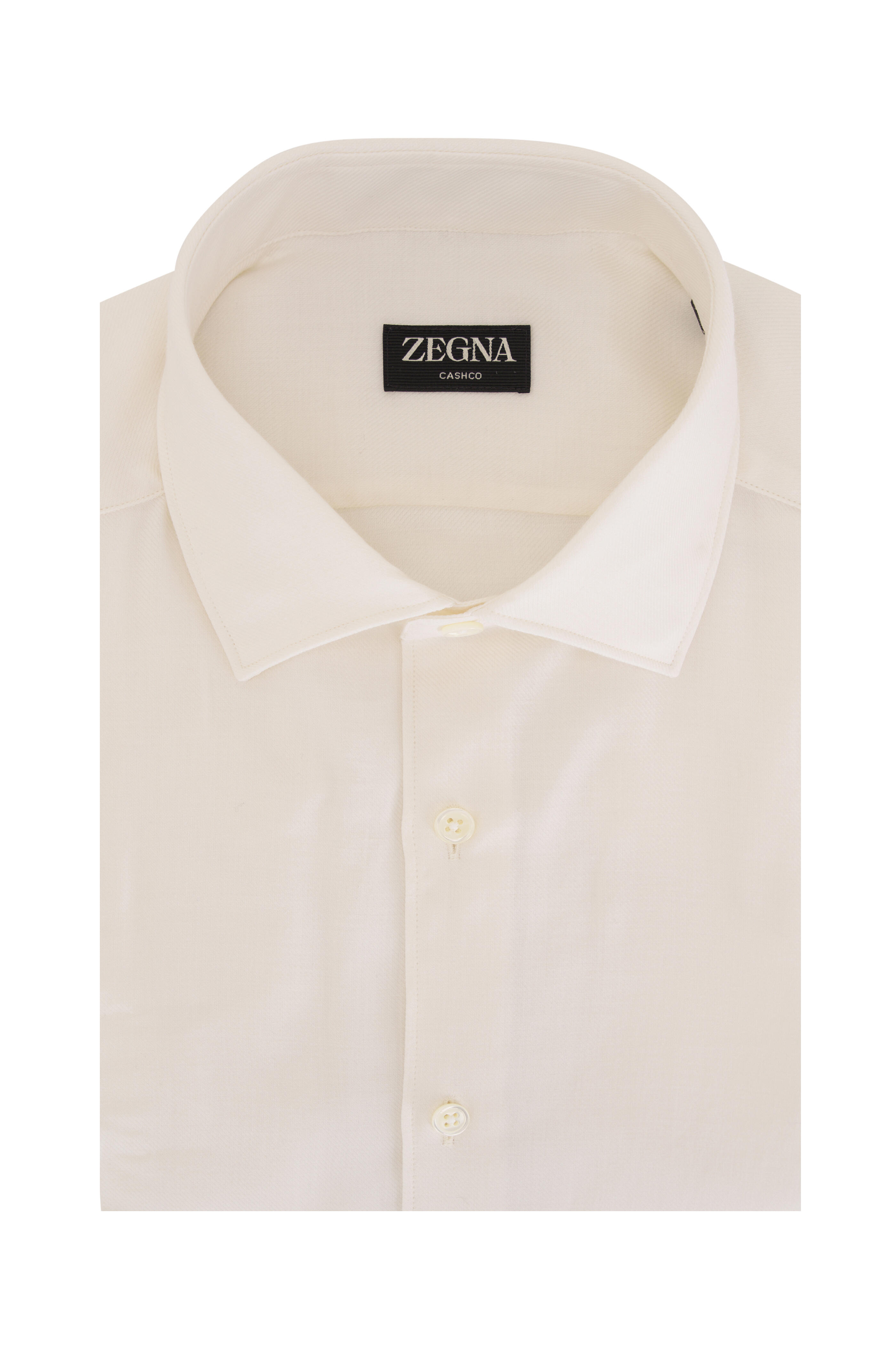 Spread collar. Front button placket. Single button barrel cuffs. Imported. 85% cotton, 15% cashmere. Hand wash.