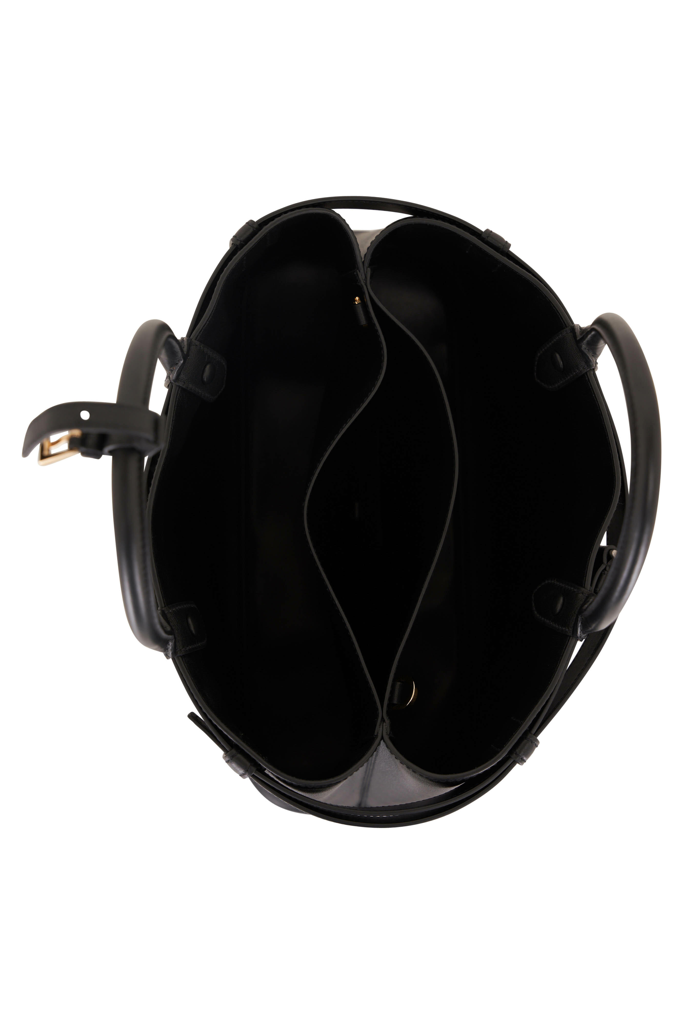 Grain leather. Dual top handles. Detachable, adjustable shoulder strap. Open top; dual compartment; interior center pocket. Decorative belt; silver square buckle. Gold embossed logo detail. Nappa leather lining. Imported. Width: 15". Height: 10". Depth: 6". Strap drop: 6 ½". Handle drop: 19".