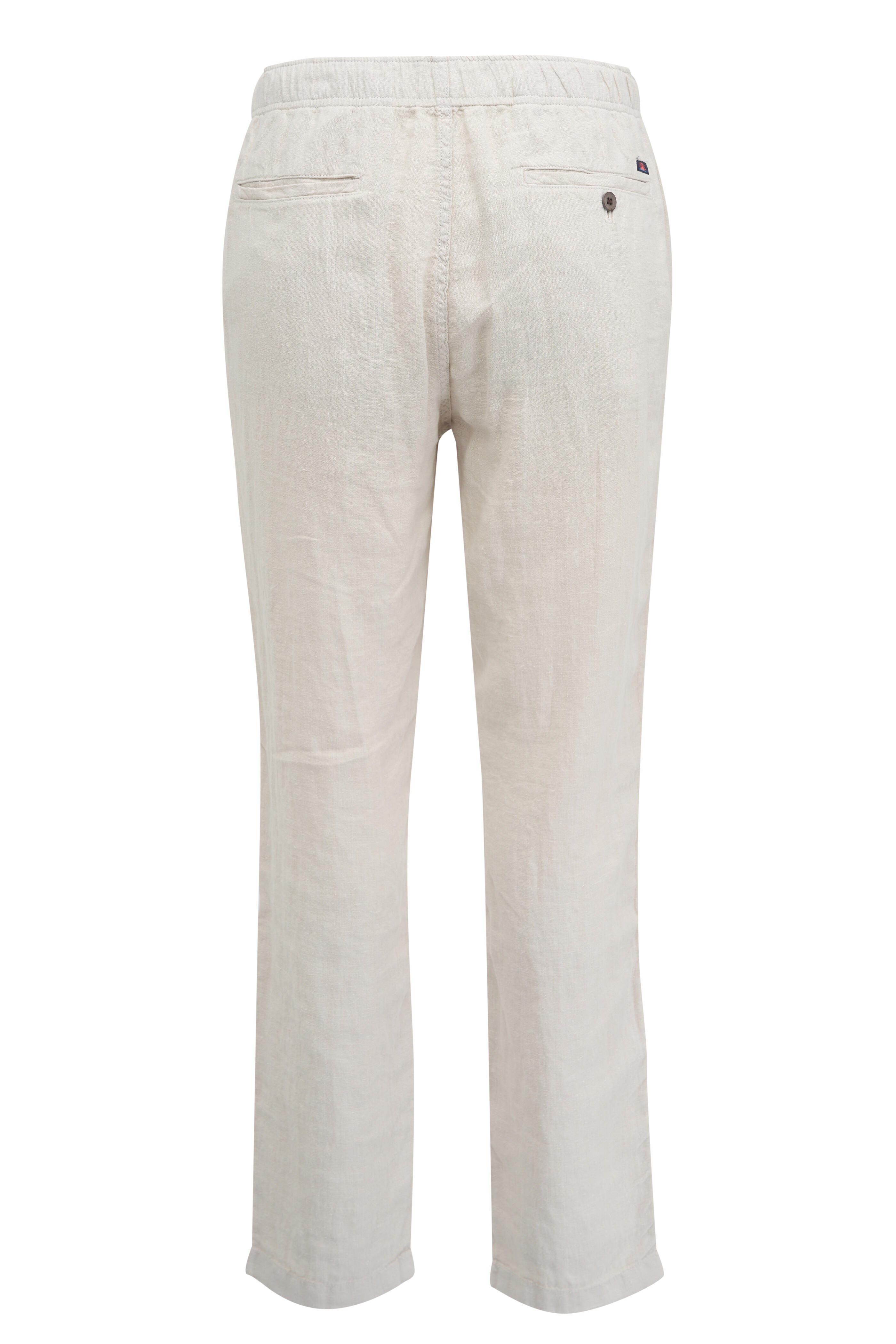Pull-on style; elasticized drawstring waistband. Side slash pockets; welt back pockets. Imported. Slim, straight leg. 100% linen. Machine wash.
