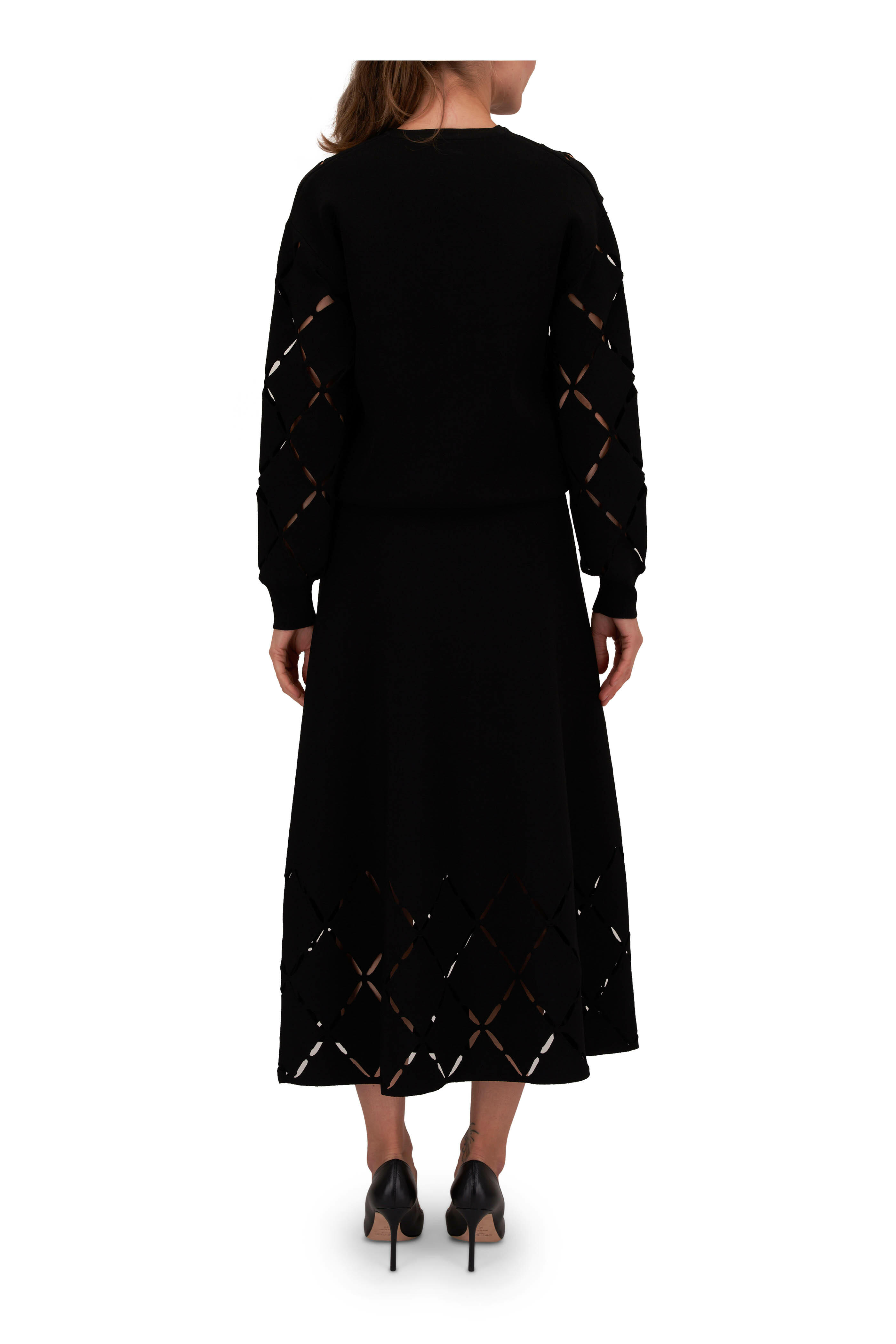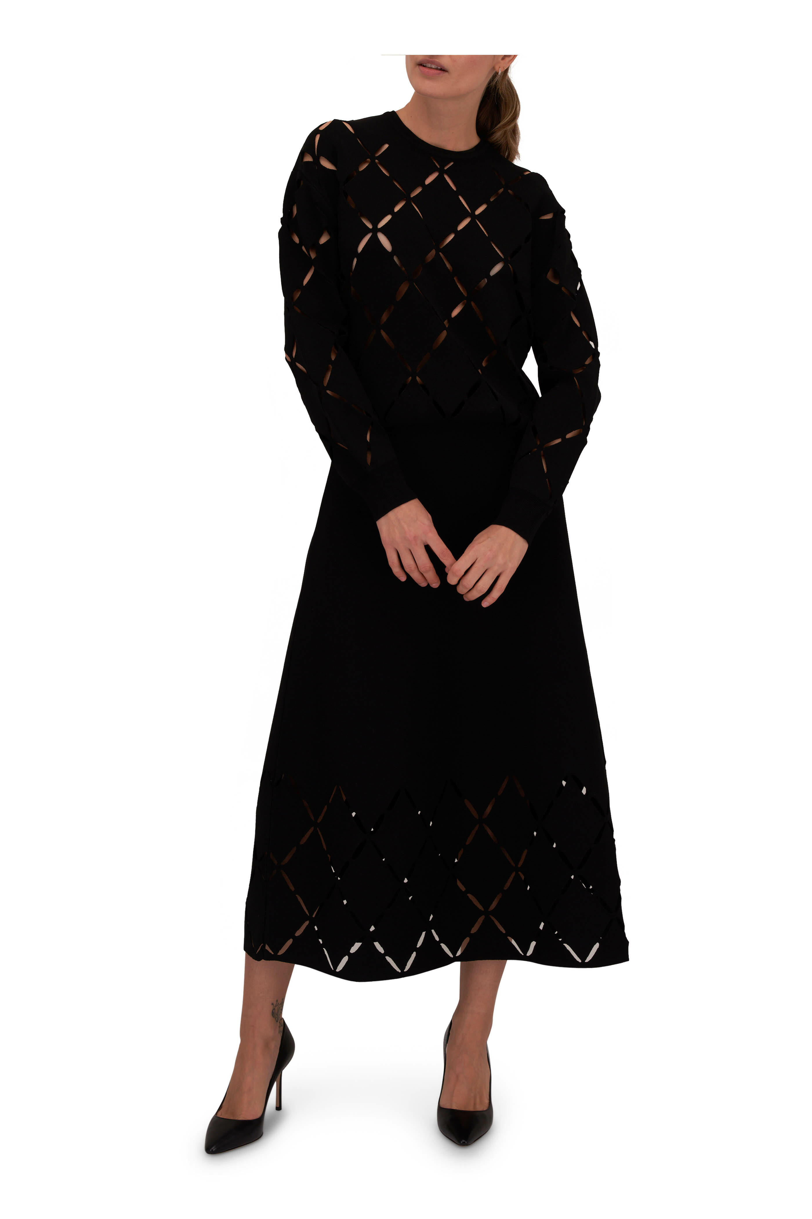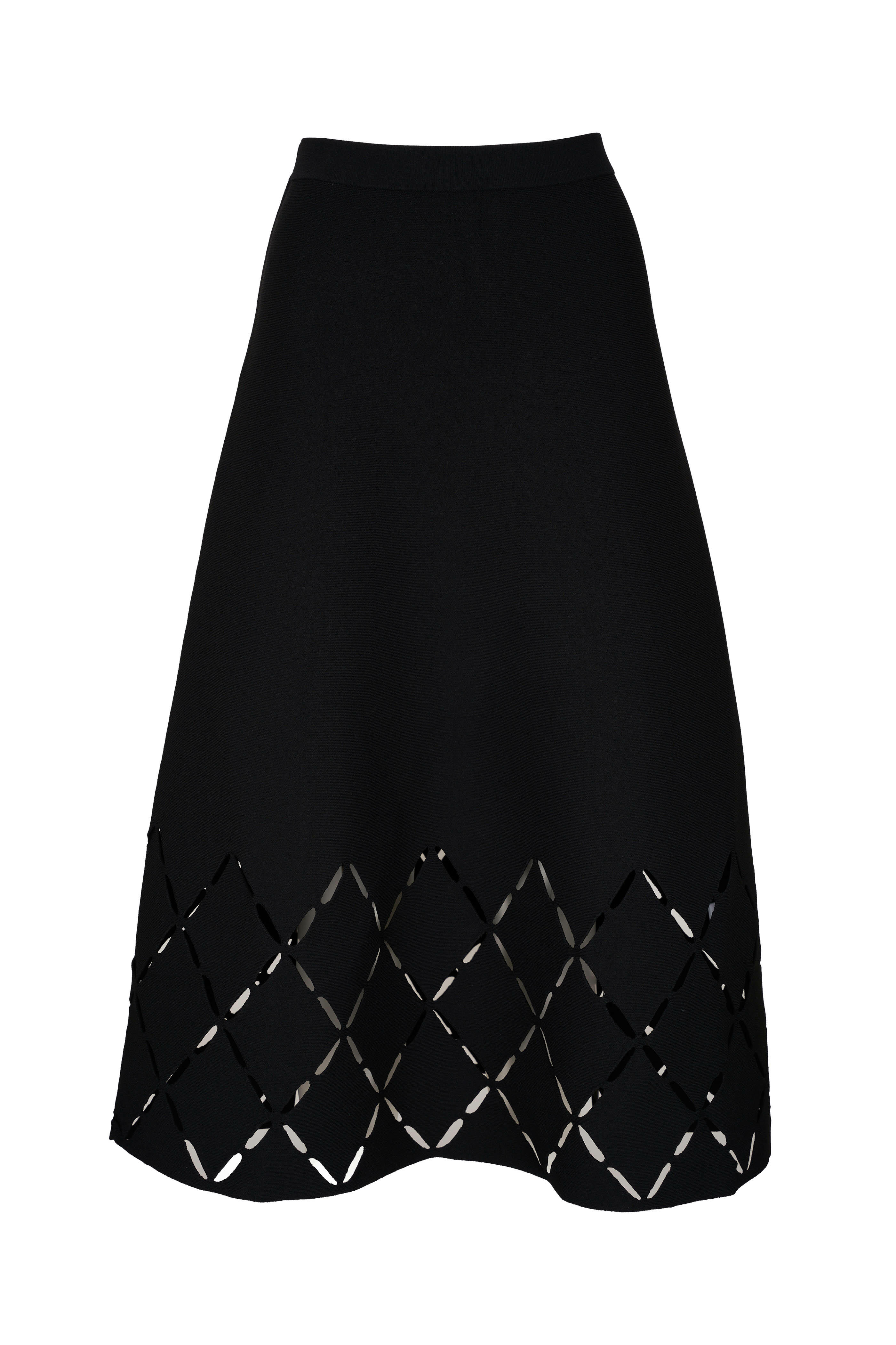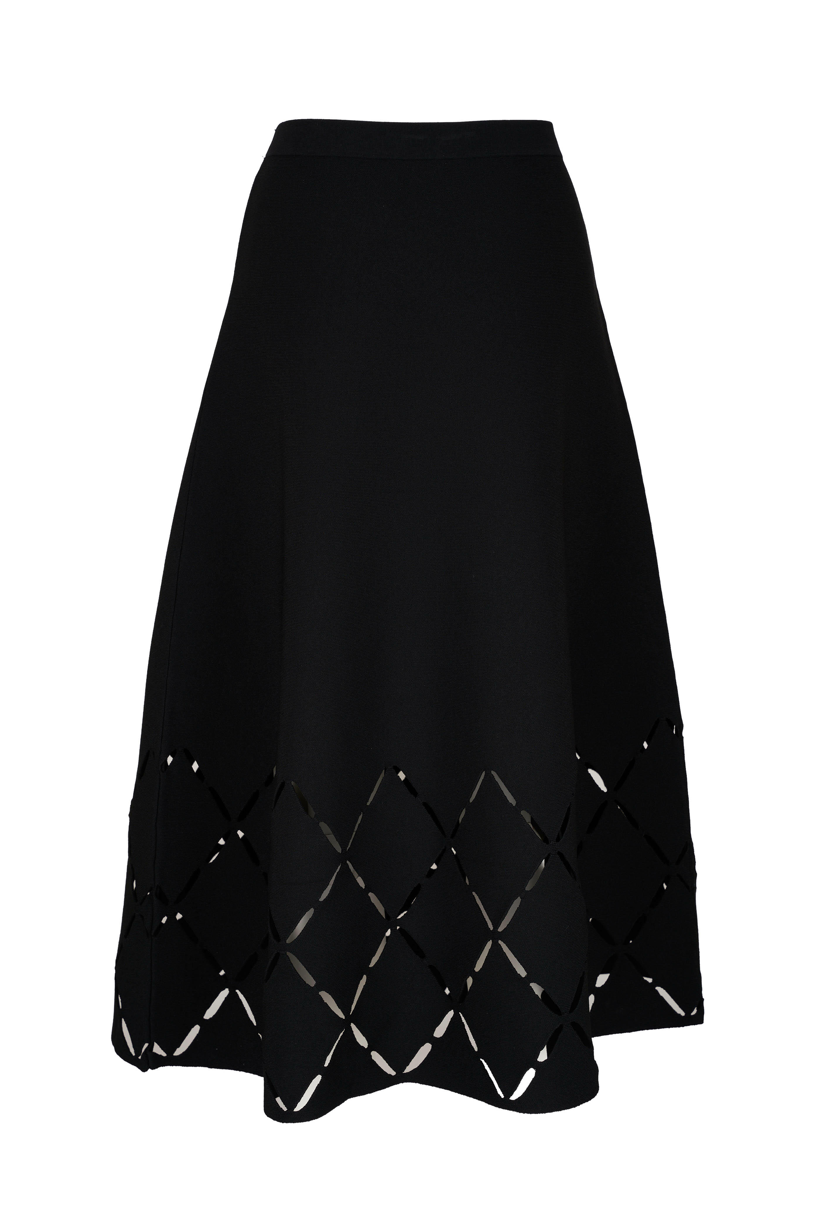 Elasticized waistband. Pull on style. Diamond cut-out detail at hem. Imported. 34 ½" length. A-line silhouette. 83% viscose, 17% polyester. Dry clean.