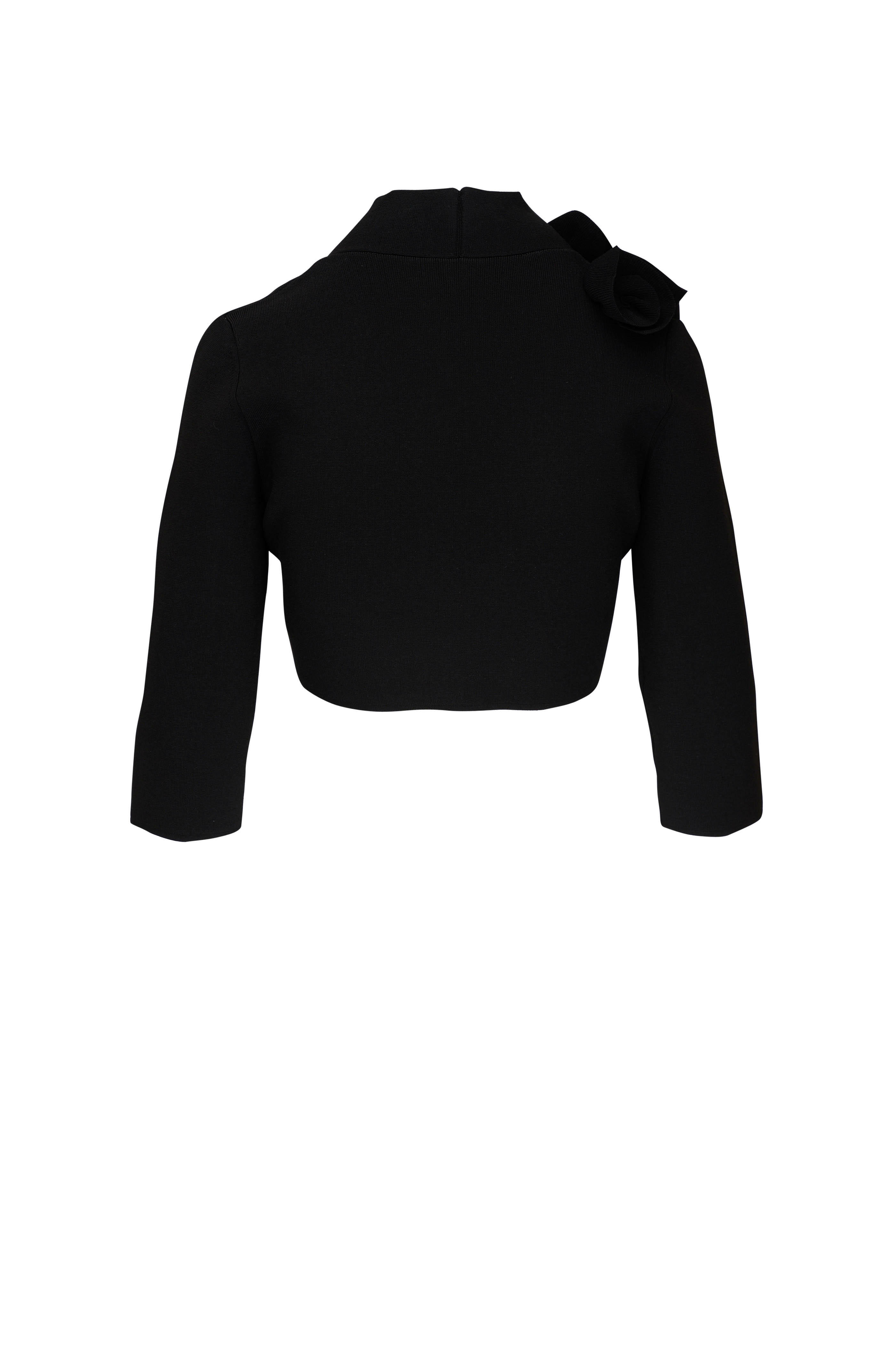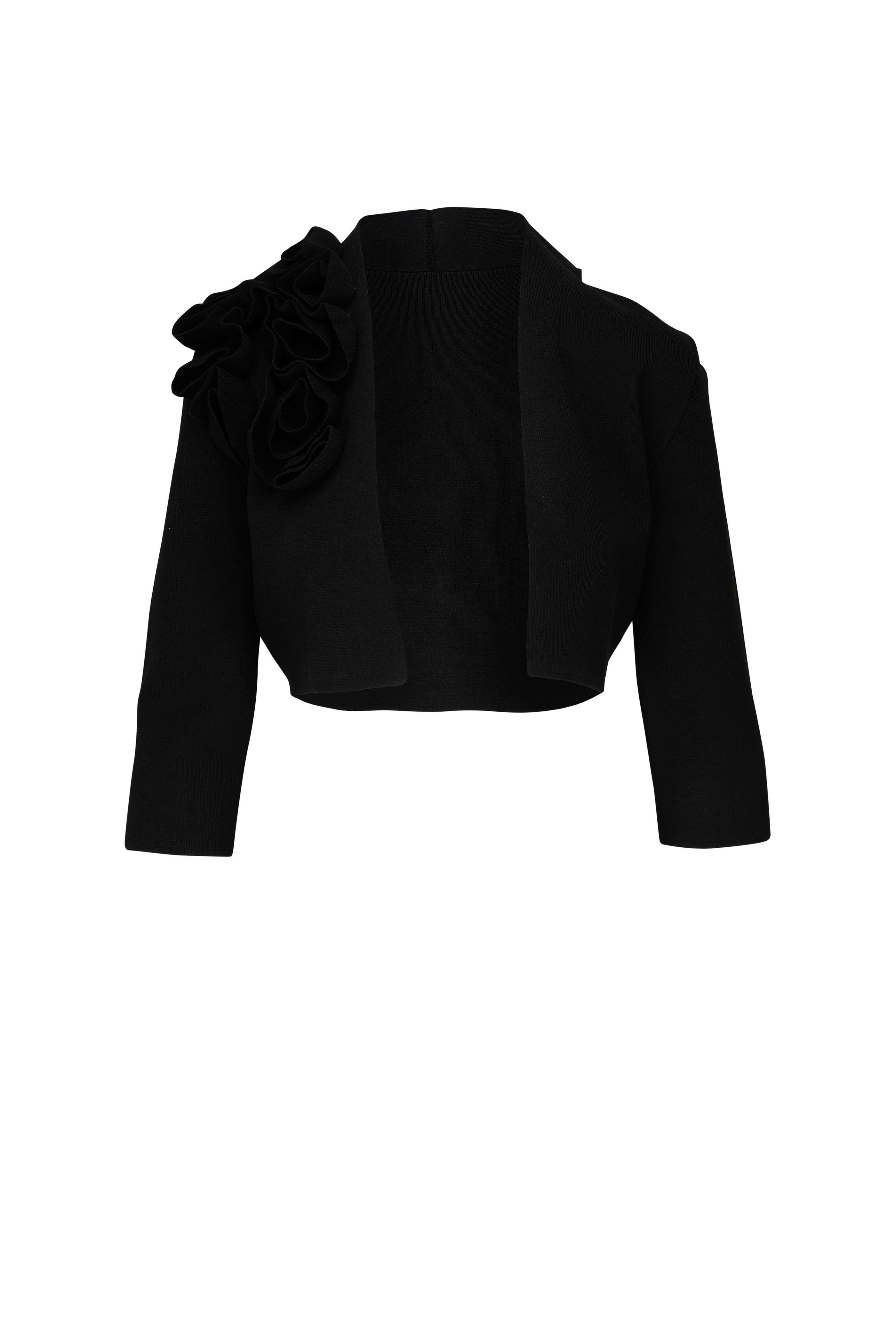 Open front. Three-quarter length sleeves. Ruffle composed of 3D rosettes. Cropped hem. Imported. Shoulder to hem 15". 83% viscose, 17% polyester. Dry clean.