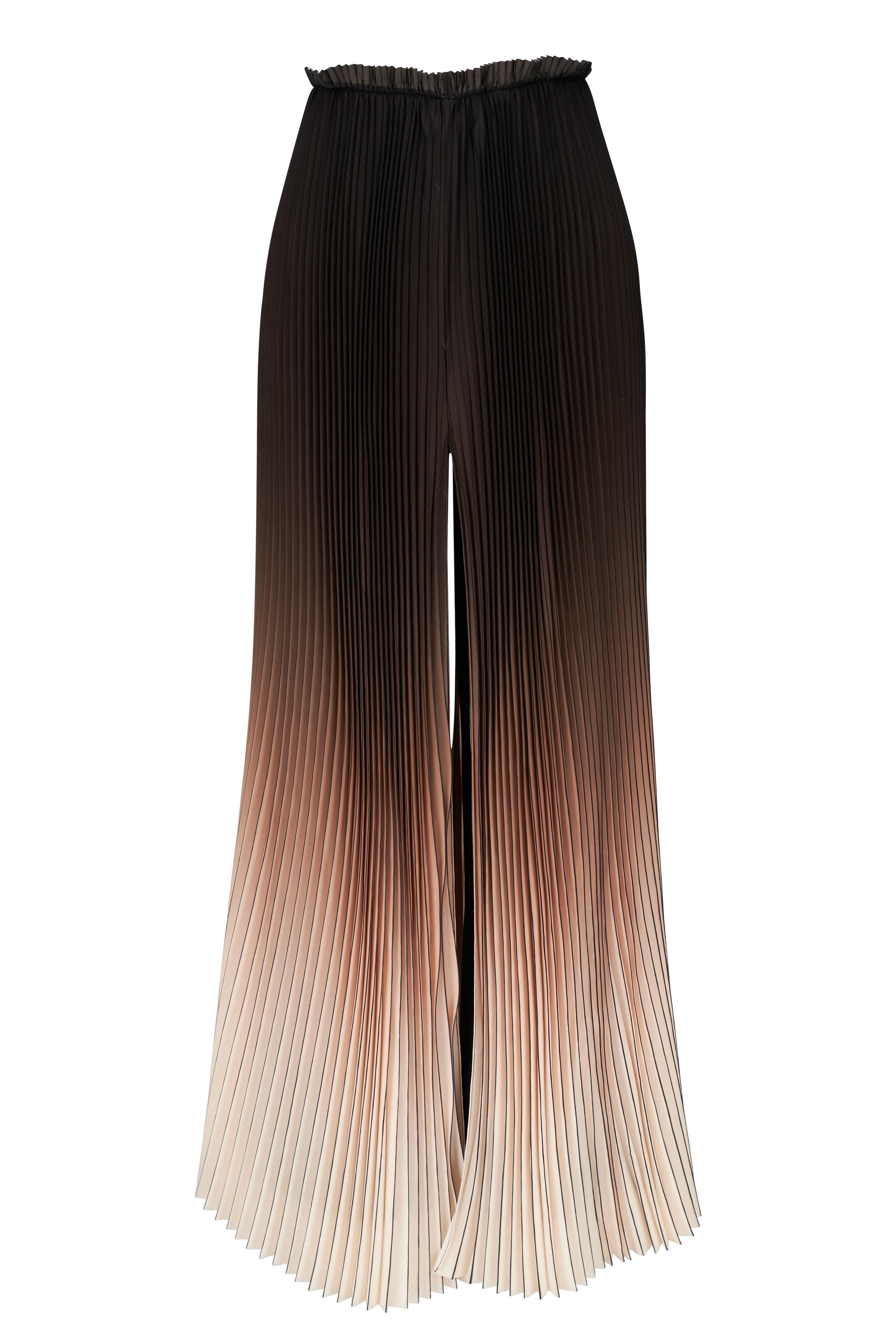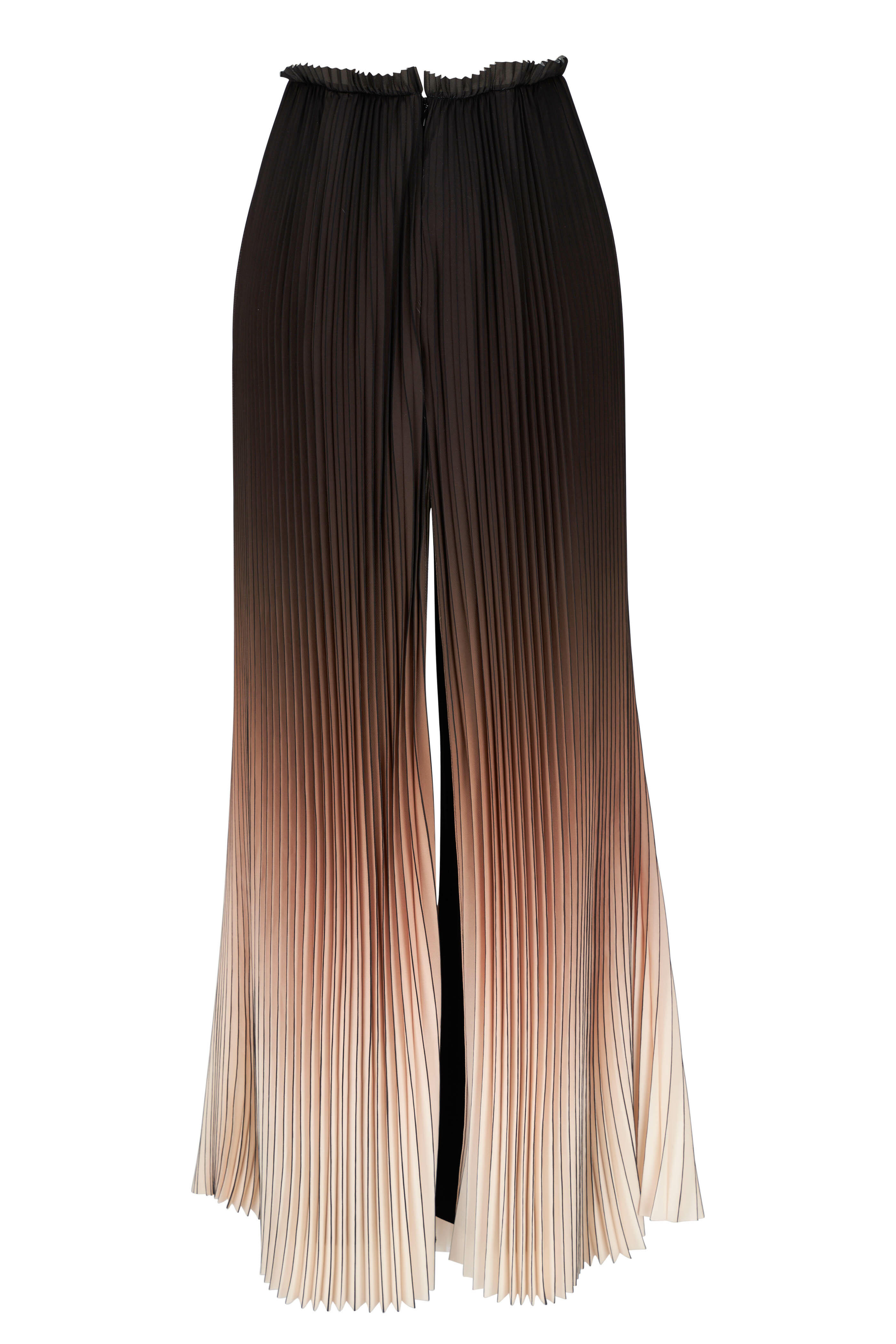 Banded elastic waistband. Concealed back zip. Pleated overlay with front and back slits. Made in the USA. Approx. 30" inseam. 100% polyester; Contrast: 83% acetate, 17% polyester. Dry clean.