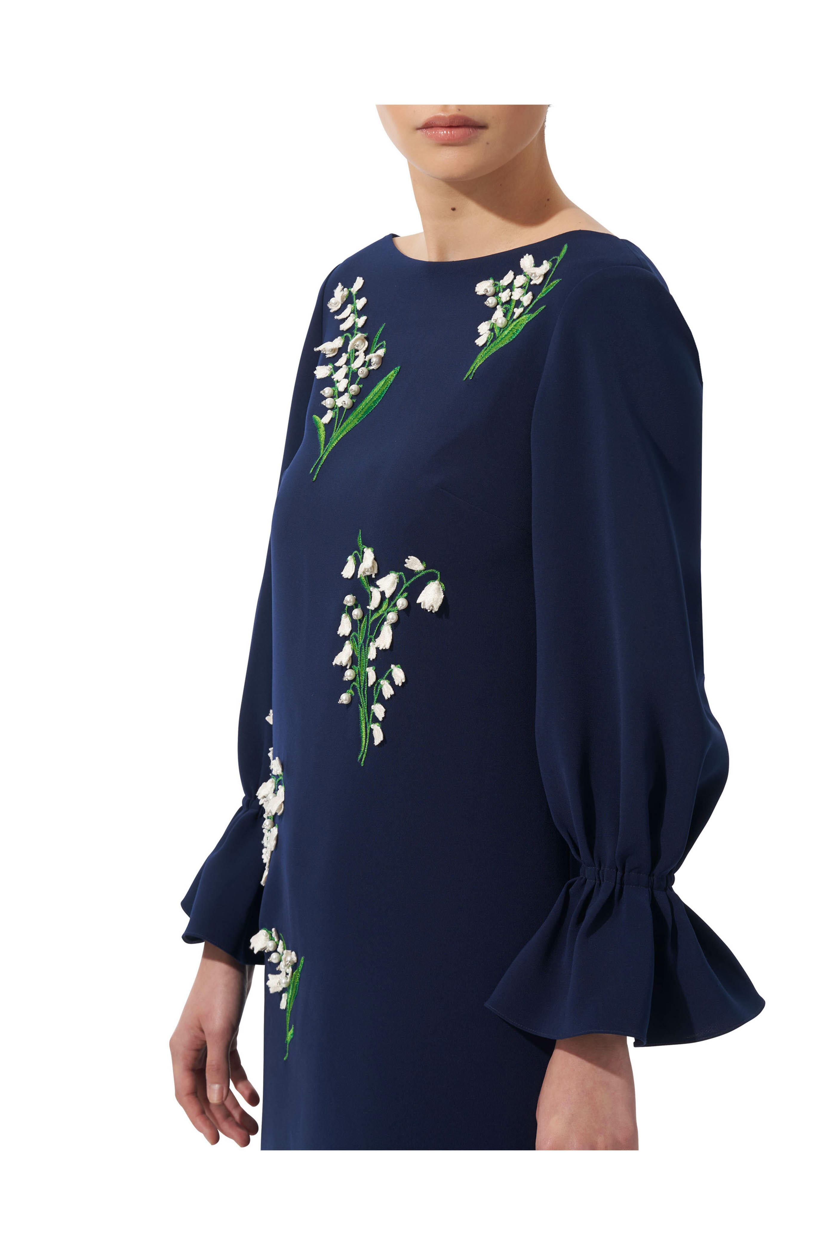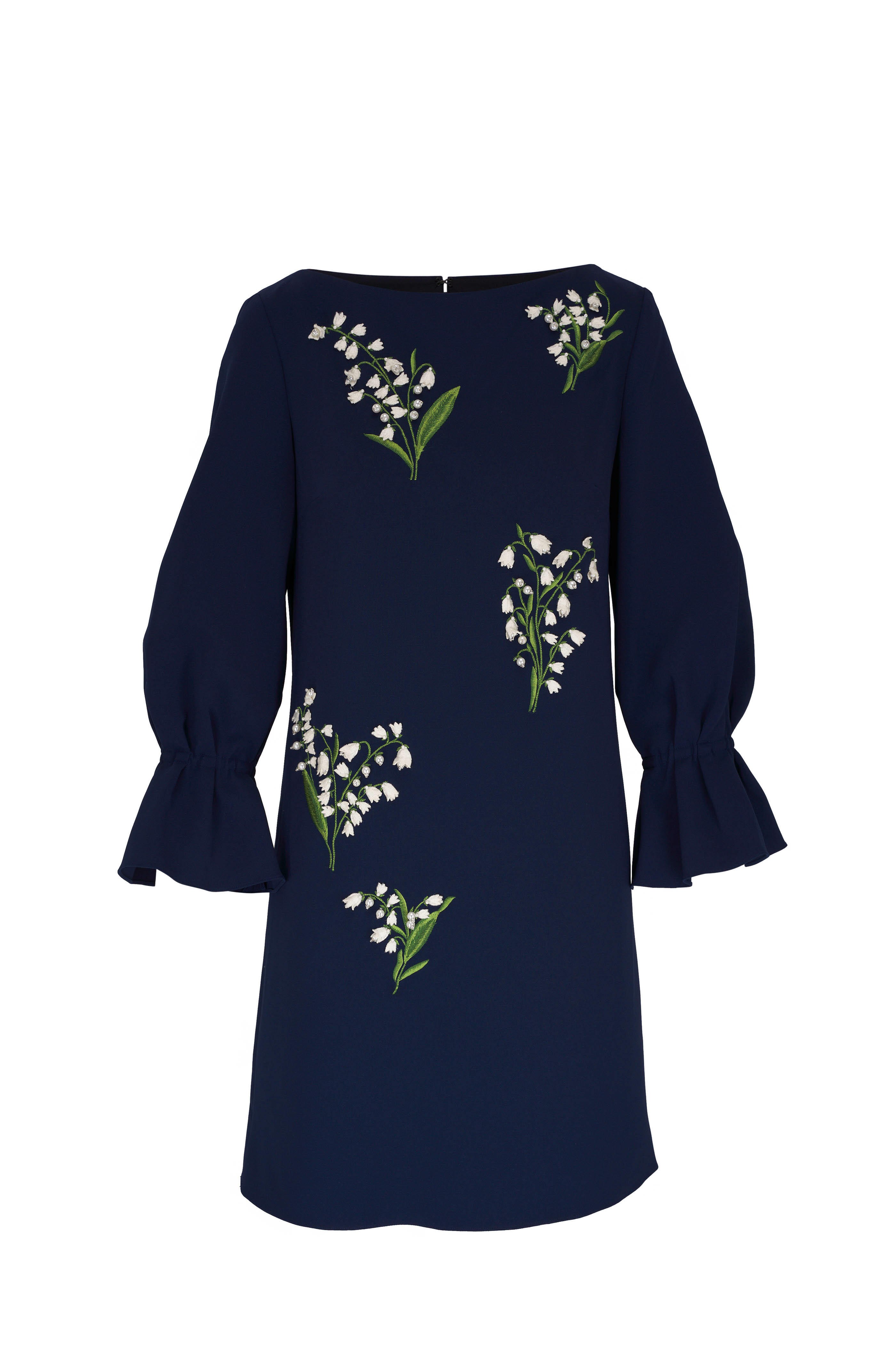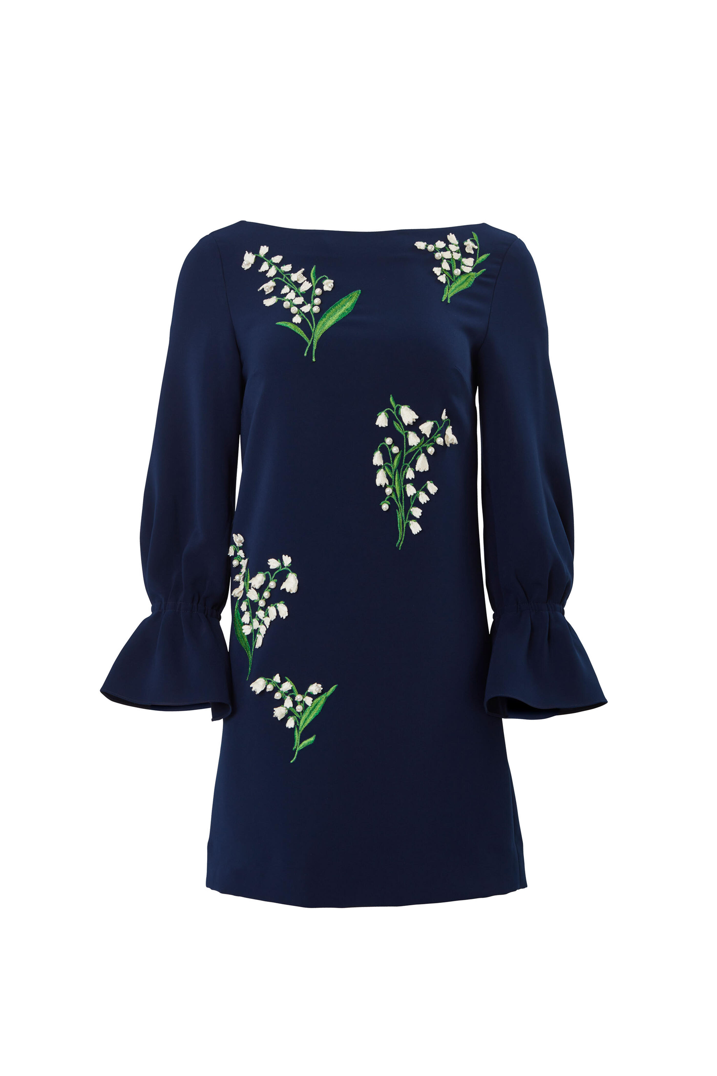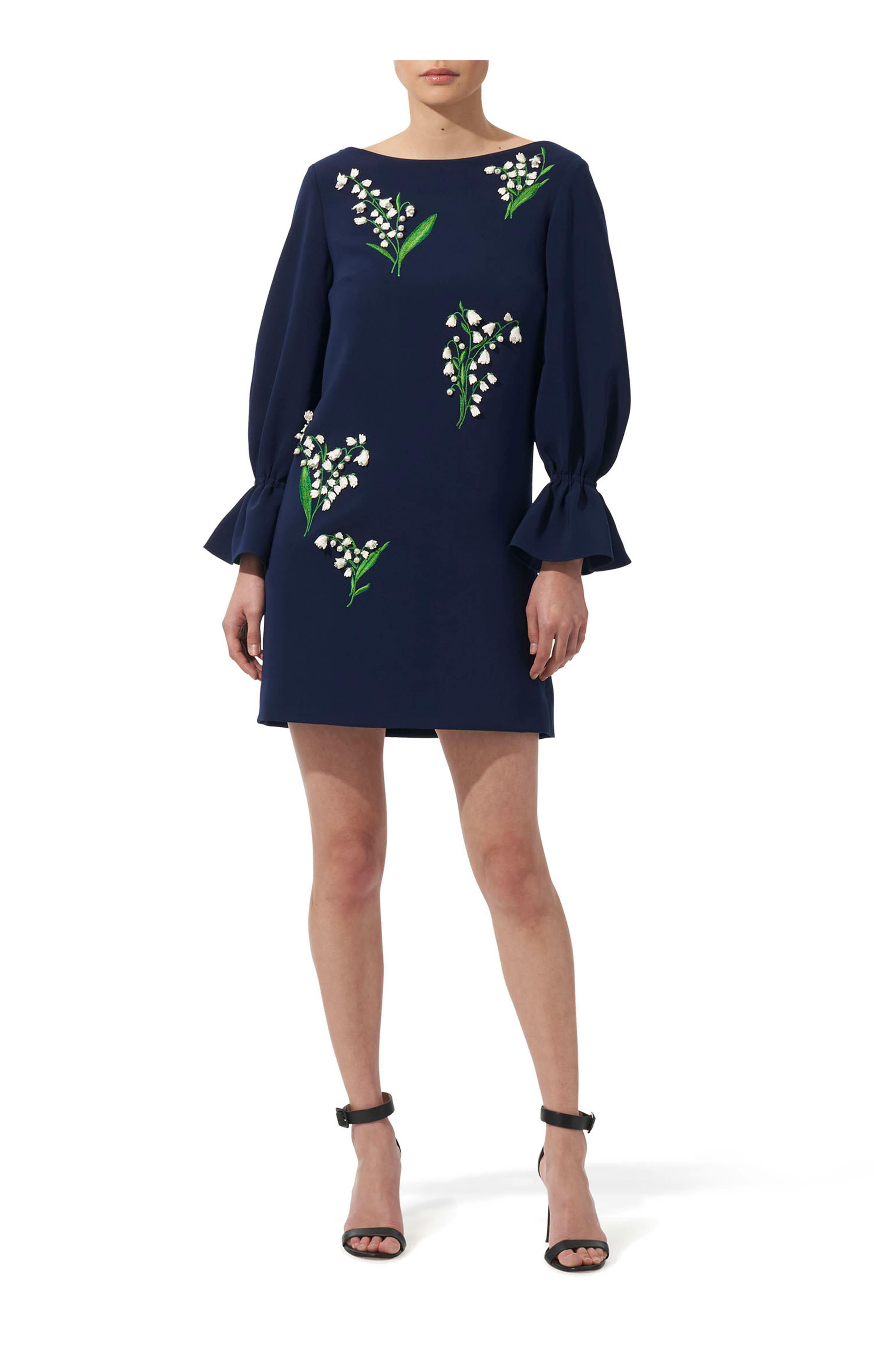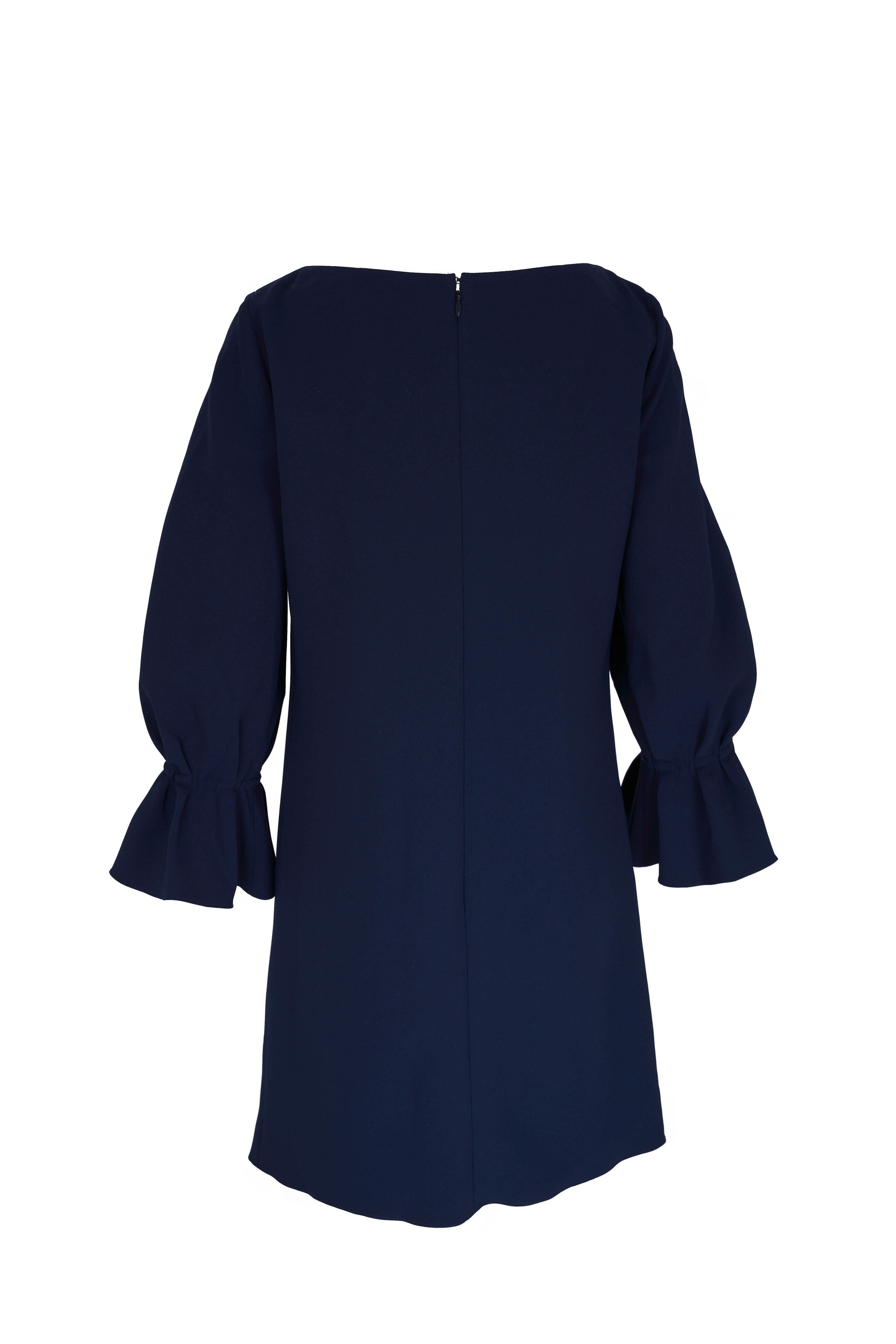 Bateau neckline. Concealed back zip. Long sleeves with elasticized bell cuffs. Made in Italy. Hits mid thigh. 92% polyester, 8% polyurethane; lined. Dry clean.