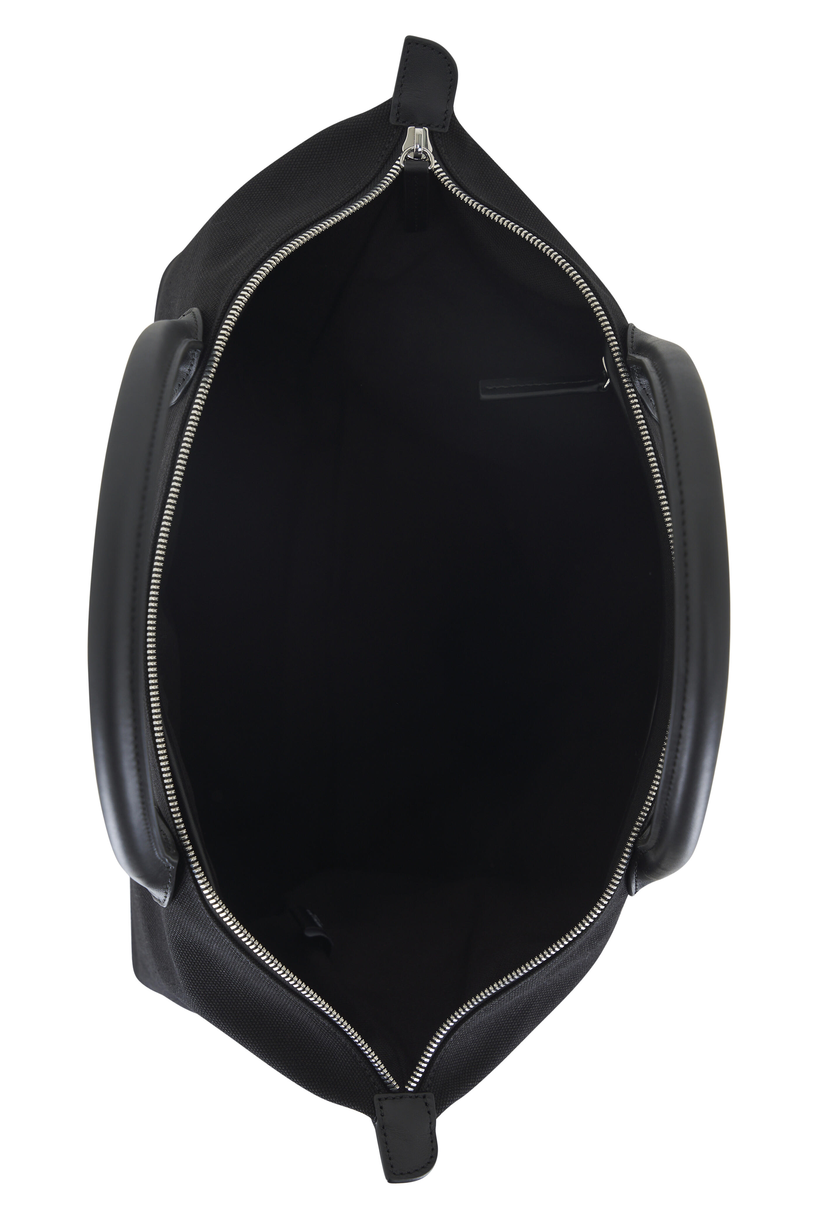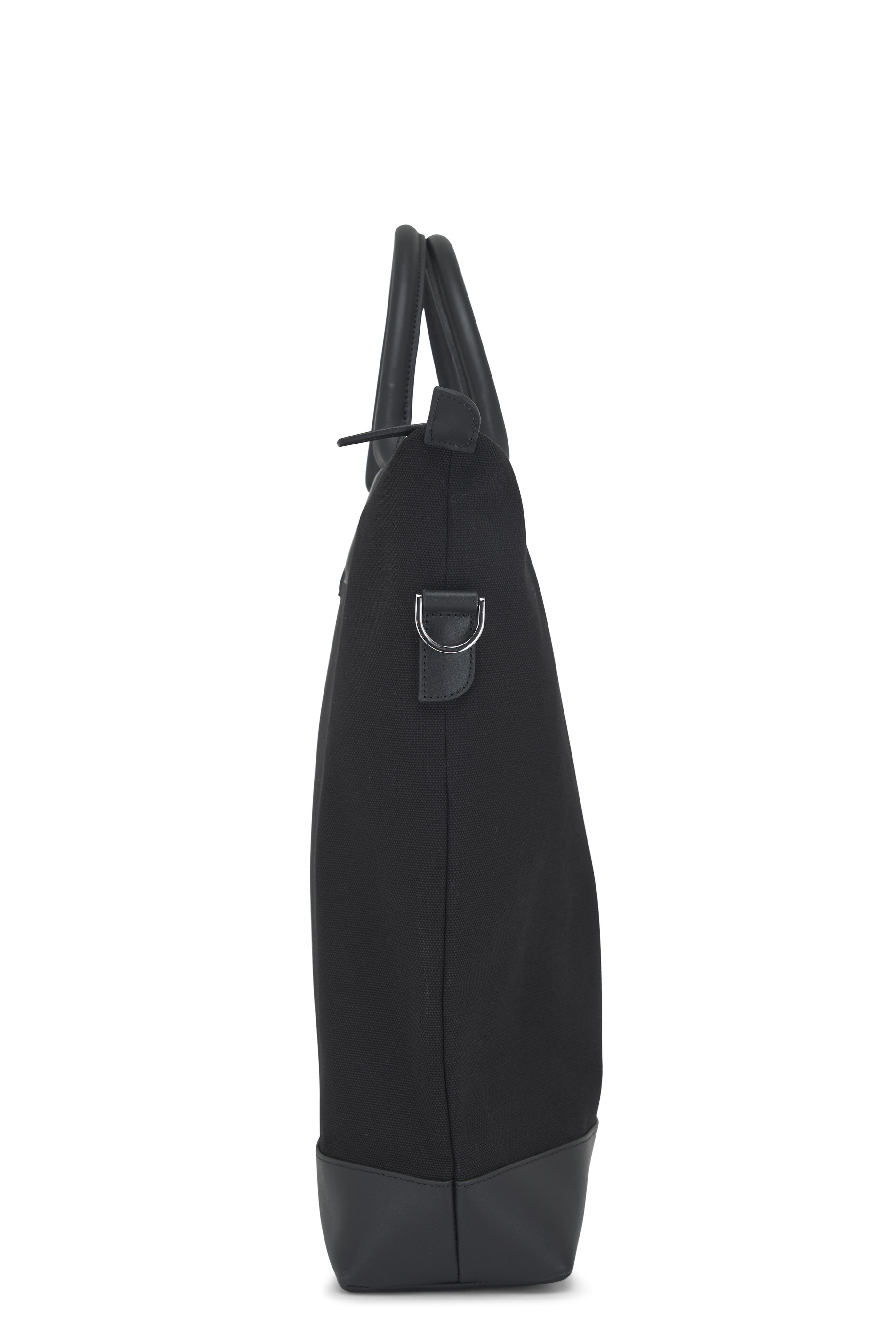 Organic cotton canvas. Dual top rolled leather handles. Two-way top zip closure. Detachable, adjustable woven shoulder strap. Single compartment. Interior zip pocket, two patch pockets and one padded wall pocket for 15" laptop. Zinc alloy hardware. Leather base. Imported. Width: 18". Height: 15". Depth: 4". Strap drop: 13-23". Handle drop: 4".